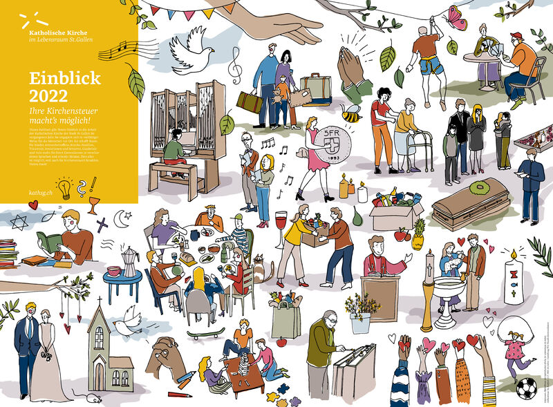 30.03.2022Die Katholische Kirche der Stadt St.Gallen engagiert sich in vielfältiger Weise für die Menschen vor Ort. Sie schafft Raum für Kinder, Armutsbetroffene, Kranke, Familien, Trauernde, Seniorinnen und Senioren, Gläubige und viele mehr. Das Faltblatt "Einblick" zeigt das vielfältige Wirken der Katholischen Kirche dieses Jahr auf der Vorderseite anhand einer bunten Illustration auf. Auf der Rückseite bekommen Sie einen detaillierteren Einblick in fünf ausgewählte Themen. Dies alles ist möglich, weil auch Sie Kirchensteuern bezahlen - vielen Dank!