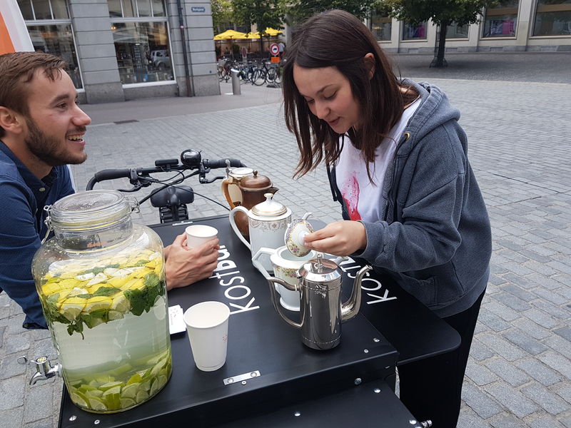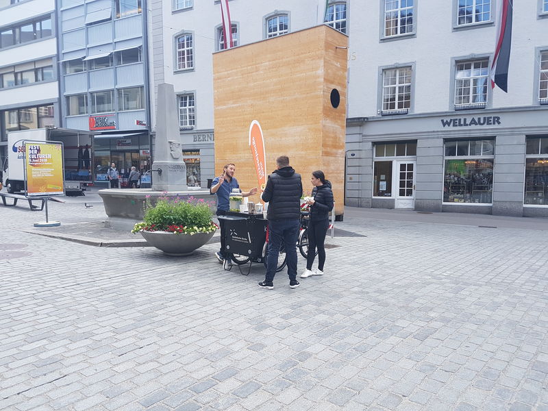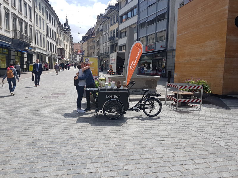 Eine Aufgabe der mobilen City-Seelsorge lautet: Im öffentlichen Raum als Kirche präsent sein. Ein Versuch, nahe bei den Menschen in der Stadt zu sein, ist das Unterwegssein mit der ‘Kostbar’. Die Kostbar fällt auf, die Krüge werden wahrgenommen und der erfrischende Drink löscht den Durst der PassantInnen. All dies hilft, ins Gespräch zu kommen über Erfreuliches sowie die Sorgen der Menschen.