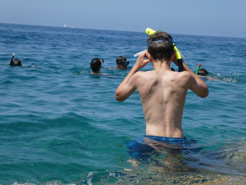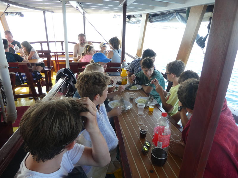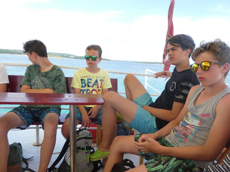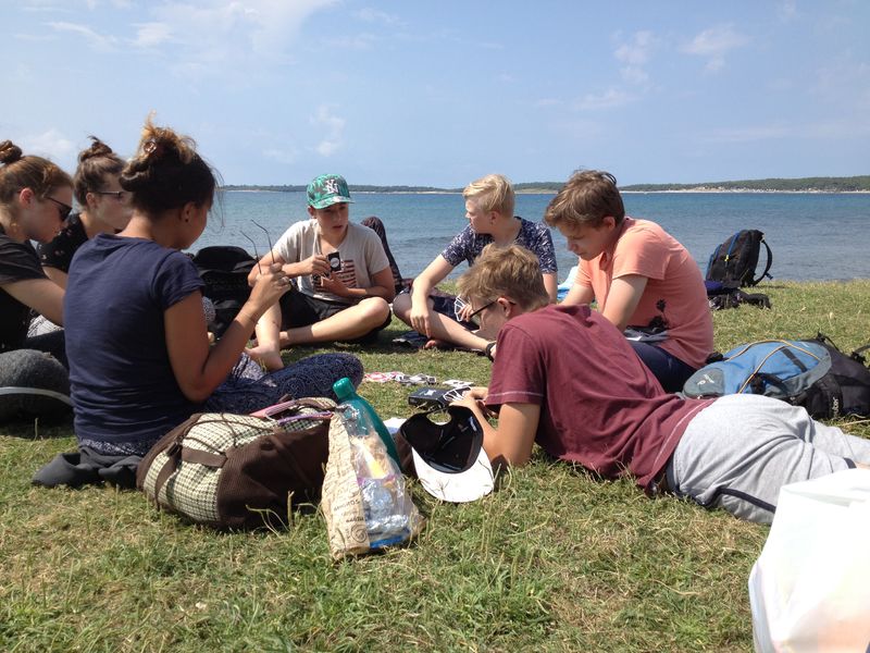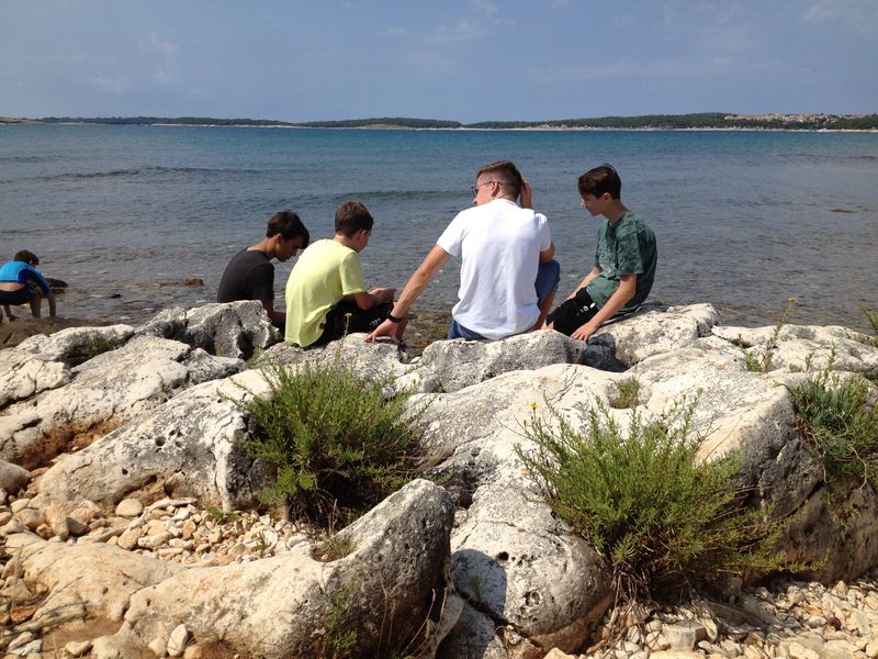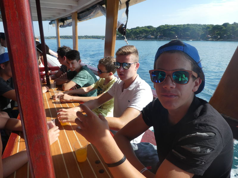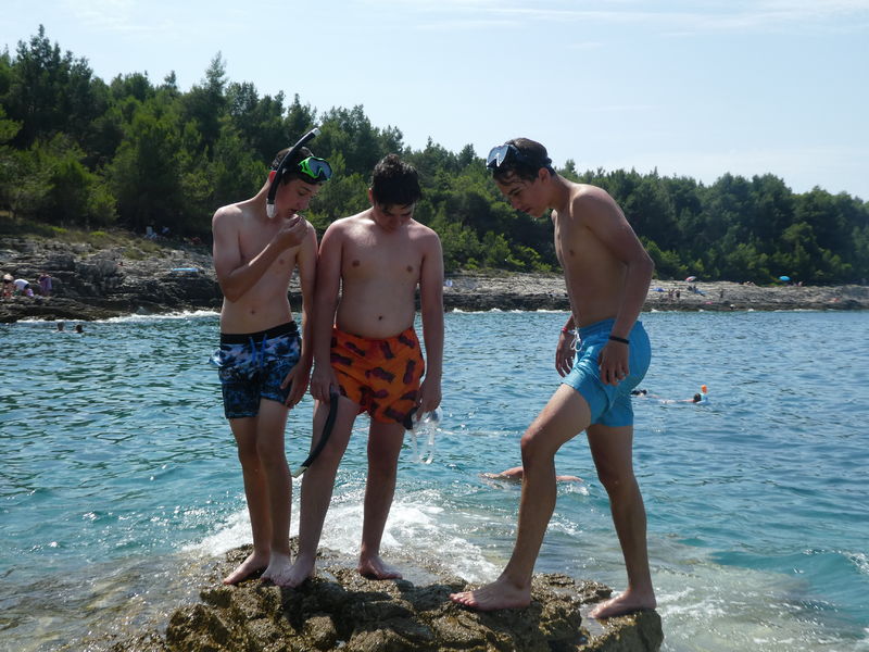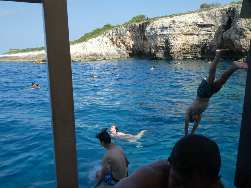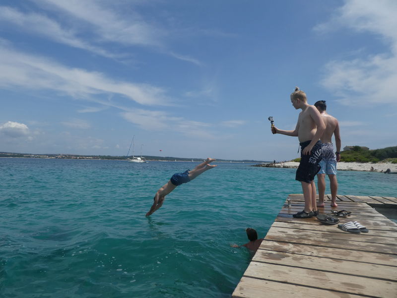 Heute Morgen wurden wir vom Regen geweckt. Bald schon kämpfte sich die Sonne aber wieder durch und wir fuhren mit einem Schiff zum Kamenjak. Dort konnten wir schwimmend eine Höhle besichtigen. Auf dem Rückweg gab es frischen Fisch. Ein Leiter hatte etwas mit dem Fisch zu kämpfen, denn beim Essen ging seine Gabel zu Bruch.