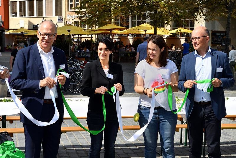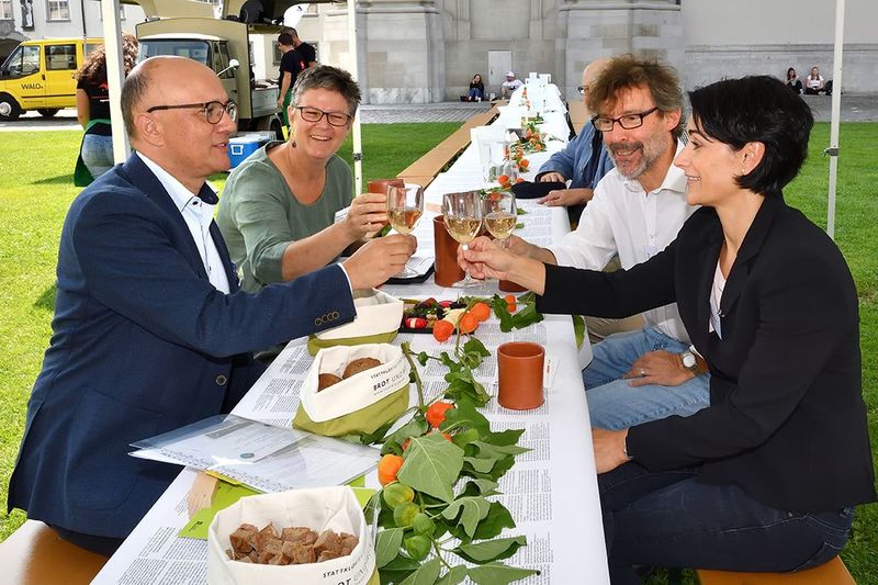 Am Di. 28. August wurde die Aktion "Brot und Wein" von Martin Schmidt, Martin Gehrer, Isabel Schorer und Nicolo Paganini zusammen mit dem Team von WirkRaumKirche in der Marktgasse eröffnet. Die Aktion läuft bis Sa. 1. September und schliesst dann um 16.45 Uhr mit einer feierlichen Schlussfeier. Setzen auch Sie sich an den langen Tisch und teilen Sie Brot und Wein (oder ein anderes Getränk). Details zu den Mittagsgesprächen und zum Kulturprogramm finden Sie hier.
