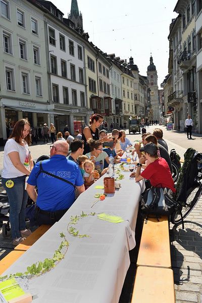 Vom Vadian Denkmal und der Kathedrale her, wächst von beiden Seiten ein langer Tisch. Jeden Tag kommen weitere Tische dazu. Am Freitag 31. August und Samstag 1. September verbindet eine durchgehend lange Tischreihe die beiden Standorte.