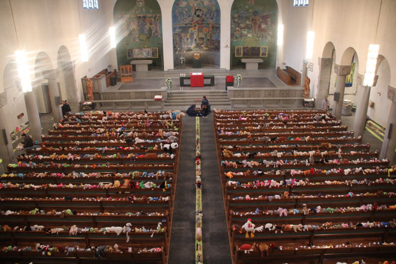 Am Sonntag 2. September 2018 gelang in der Kirche Heiligkreuz ein Weltrekord der besonderen Art. Zwischen 400 – 500 Eltern und Kinder brachten insgesamt 3701 Kuscheltiere in die Kirche. So wurde die Kirche zur Arche, die allen Tieren Schutz gibt.