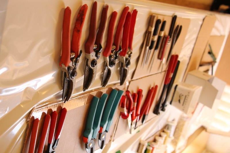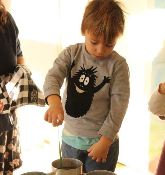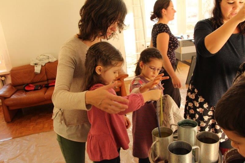 Paradiesli, Jugendtreff St. Otmar - 12.55 Uhr - die Wachsbehälter werden immer leerer, dafür werden die Kerzen immer dicker. Einige Kerzenabschnitte liegen bereits auf dem Tisch, auf dem die Kerzen kunstvoll zugeschnitten oder "Rädli"aufgeklebt werden. Die Atmosphäre ist sehr friedlich und ruhg. Schon bald wird die Kerze in ein ein Gesteck drapiert werden.