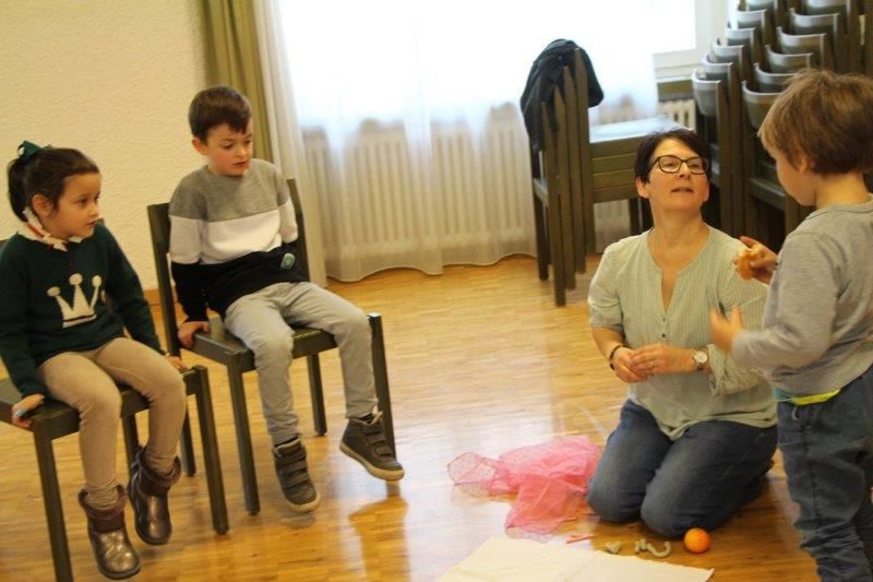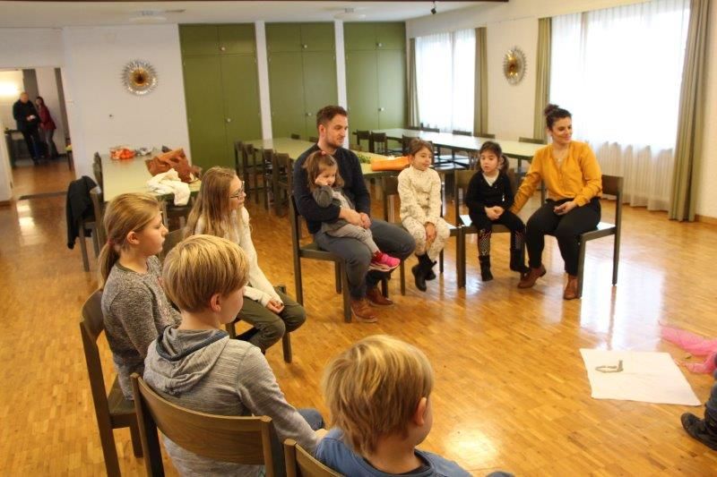 Pfarreizentrum St. Otmar - 12.00 Uhr - Mitten in der Adventsbinderei - Während bei einigen der Kranz soeben fertiggestellt wurde und nur noch darauf wartet, verziert zu werden, haben sich andere bereits im Otmarssaal zum Geschichtenlauschen eingefunden. Eine Adventsgeschichte, die auch noch über die Entstehung des Adventskranzes berichtet. Sobald die Geschichte fertig ist, werden auch diese Kinder und ihre Eltern sich in die Cafeteria begeben, um dort ihren wohlverdienten Hotdog zu essen.