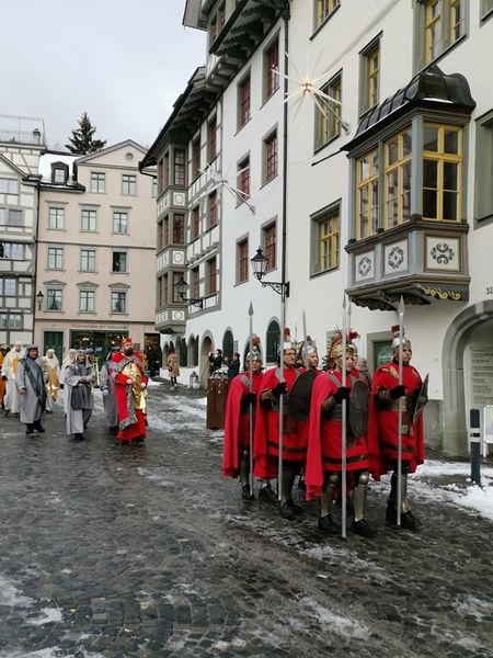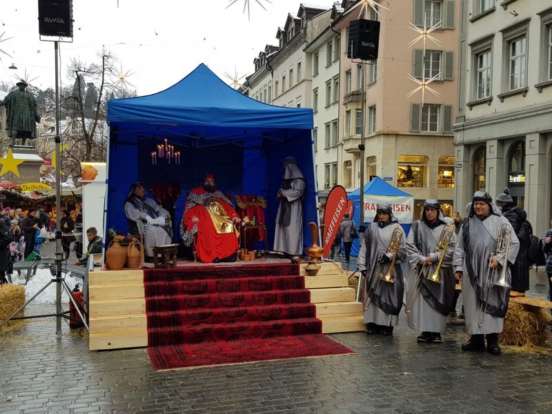 mit der Heiligen Familie. Die einzelnen Standorte konnten individuell besucht werden, die Szenen wurden mehrmals gespielt. An zwei Orten, Anfang der Multergasse und in der Marktgasse, konnten sich Passanten in Herodes’ Steuerlisten eintragen. Zum Abschluss traffen sich alle Mitwirkenden zum gemeinsamen Singen auf dem Klosterplatz. Getragen wird die Veranstaltung von der Katholischen, Evangelisch reformierten und der Christkatholischen Kirche sowie den Freikirchen der Evangelischen Allianz.