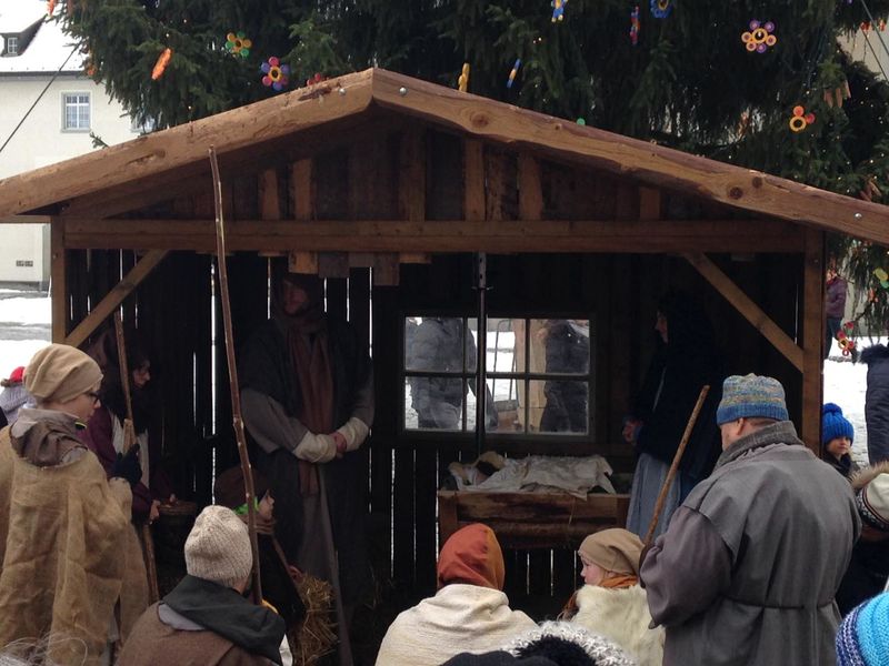 das Lager der Hirten und Schafe und auf dem Klosterplatz vor dem Christbaum stand die Krippe