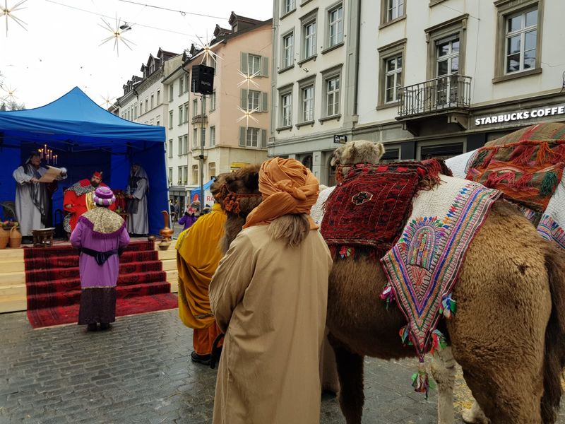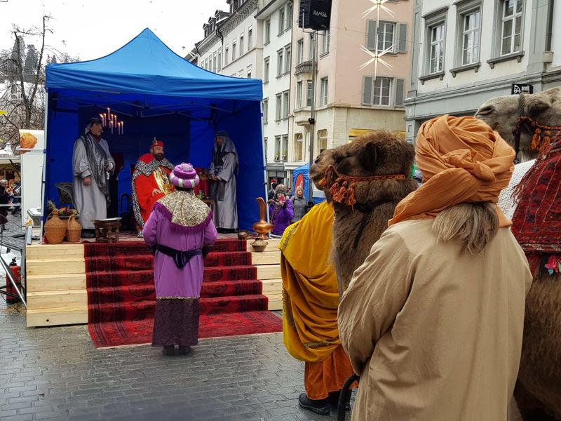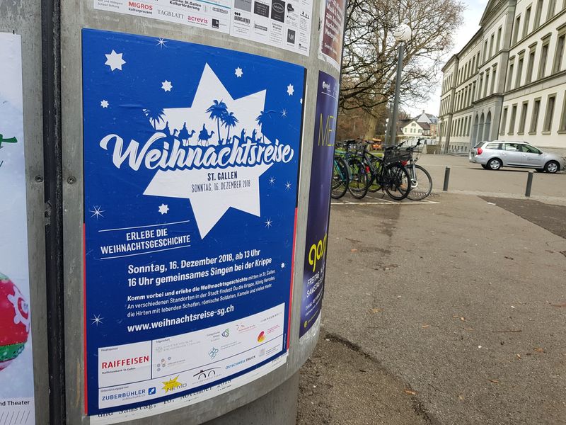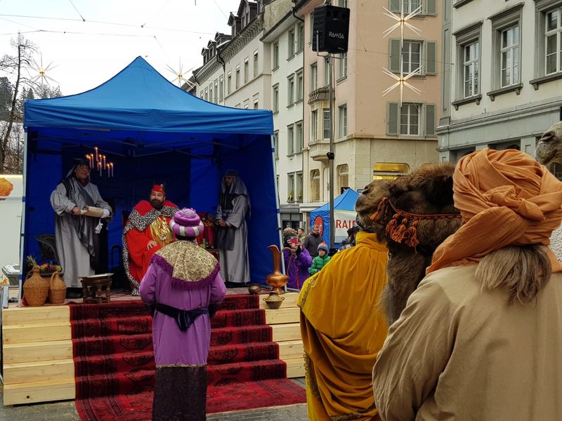 Der Verein Weihnachtsreise St.Gallen erweckte die Geschichte aus dem Neuen Testament mit Darstellern aus Fleisch und Blut in der St.Galler Altstadt zum Leben. Über 80 Schauspielerinnen und Schauspieler waren beteiligt. Auch Schafe, Ziegen, Esel und Kamele waren zu sehen. Sie zogen vom Klosterplatz über den Gallusplatz, die Weber- und Multergasse zum Bärenplatz und verteilten sich dann von dort aus an die verschiedenen Standorte in der Altstadt. Bis 16 Uhr wurden verschiedene Szenen aus der Weihnachtsgeschichte aufgeführt: In der Marktgasse stand der Thron des Herodes, auf dem Grüningerplatz