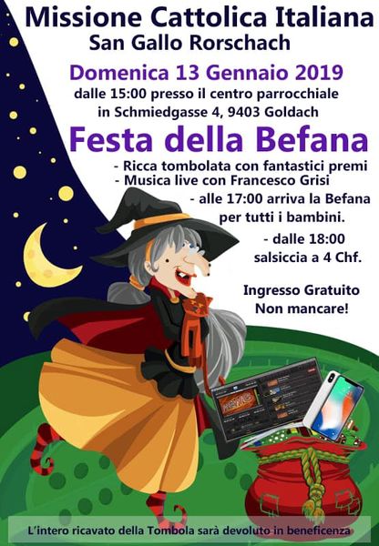 Fantastica festa della Befana, organizzata dal Gruppo Uomini "S. Gennaro" della MCI per un vastissimo pubblico che ha gremito la sala parrocchiale di Goldach. Non solo divertimento, musica e tanti, tantissimi ricchi premi ma anche e soprattutto beneficenza per i nostri fratellini che hanno bisogno. Grazie a tutti voi della bellissima partecipazione.