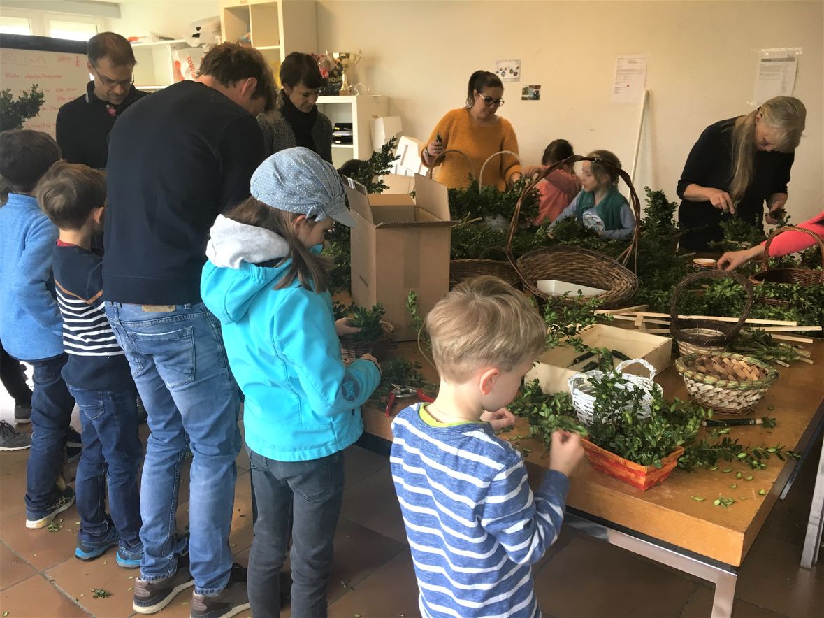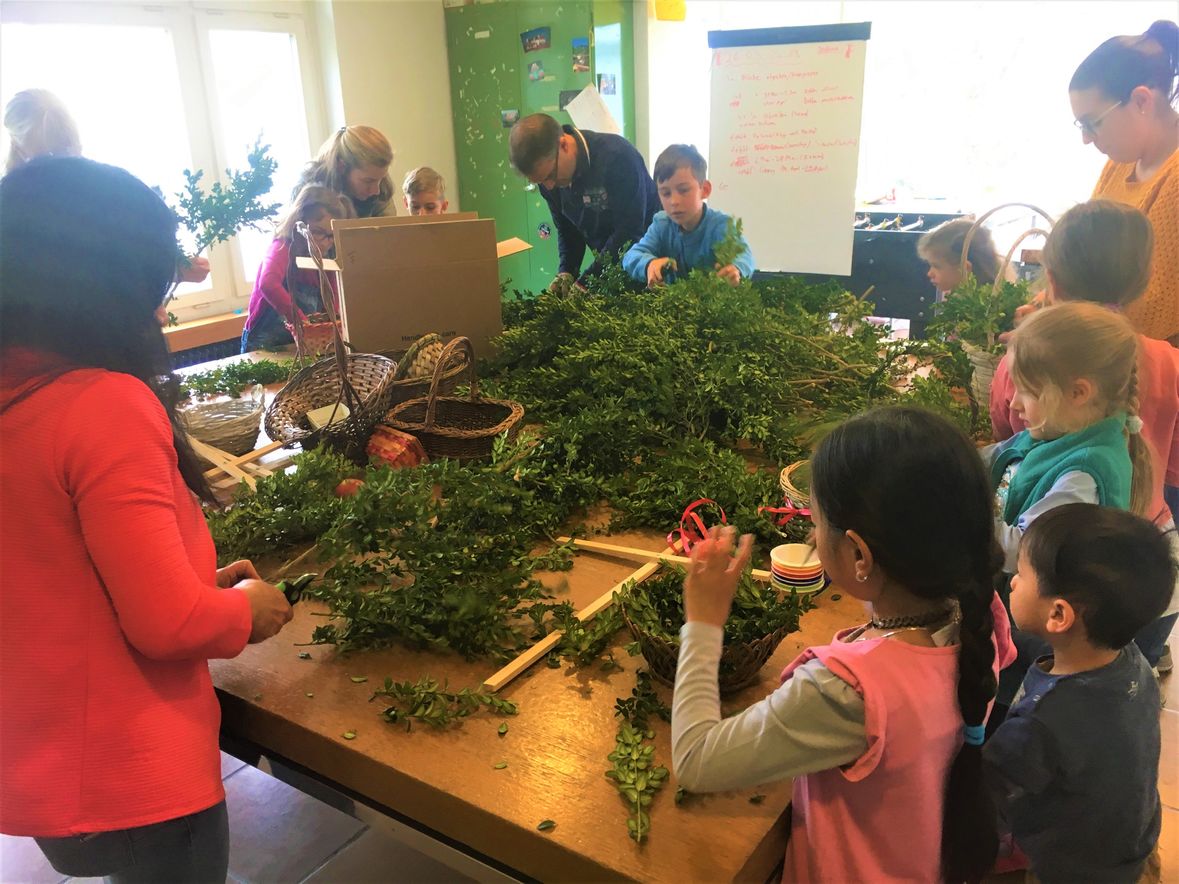 Diese alte Tradition pflegen wir einen Tag vor Palmsonntag in der Pfarrei. Vorbereitete Holzkreuze werden mit Buchs-, Palm- und Thuja-Zweigen eingebunden und mit roten Bändern und Äpfeln geschmückt.