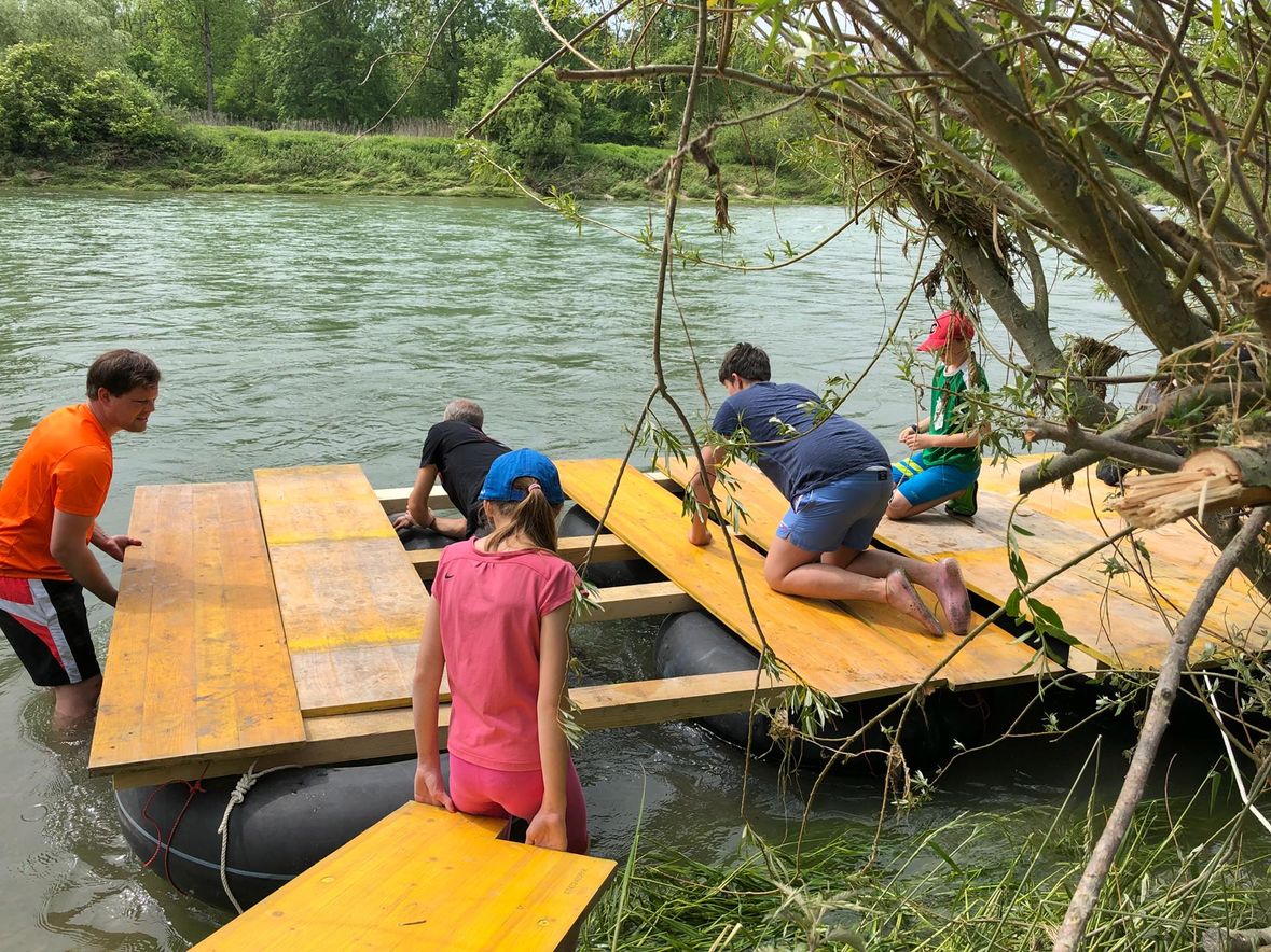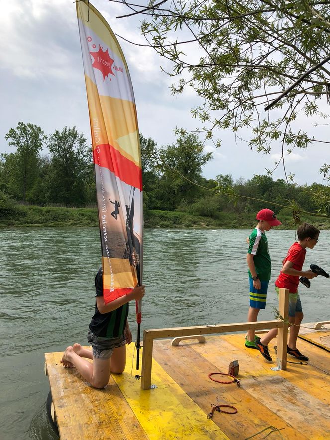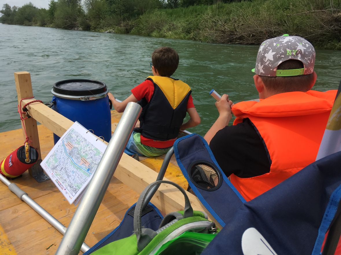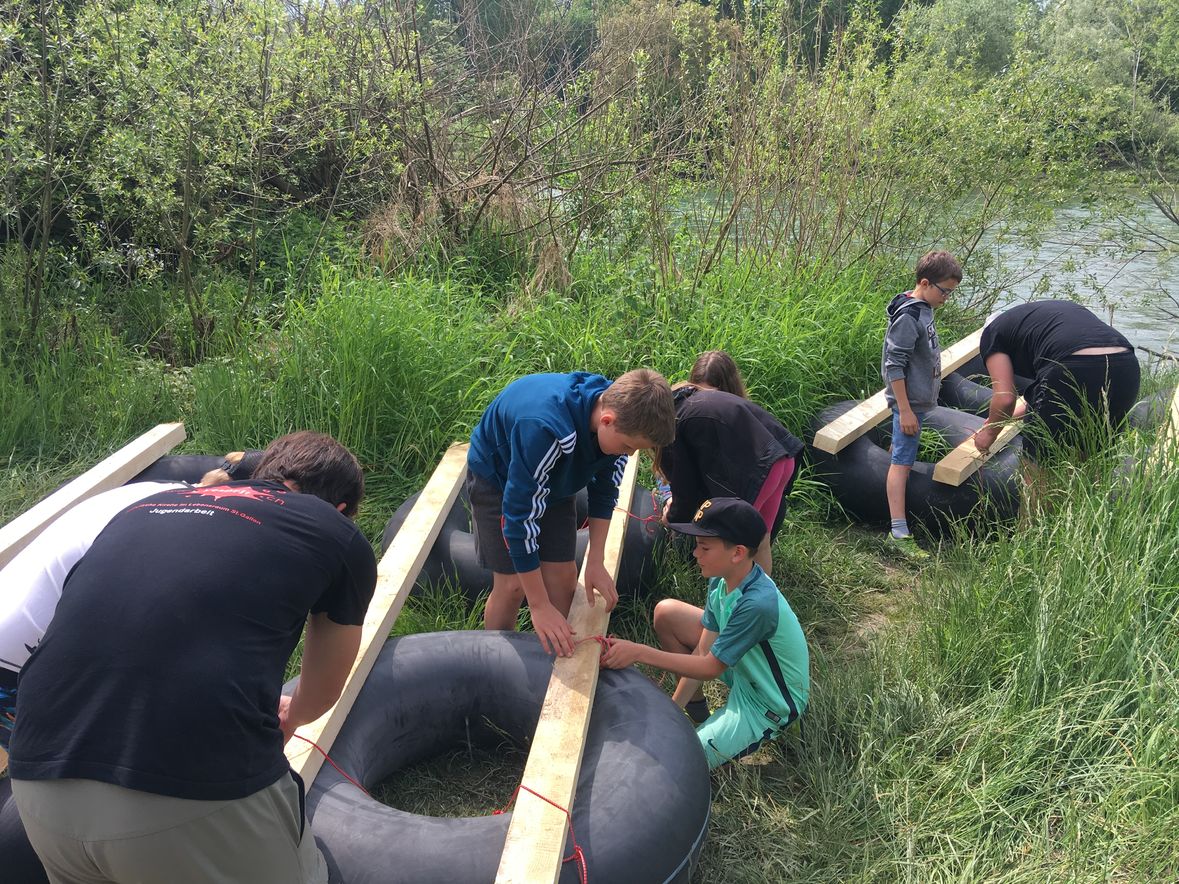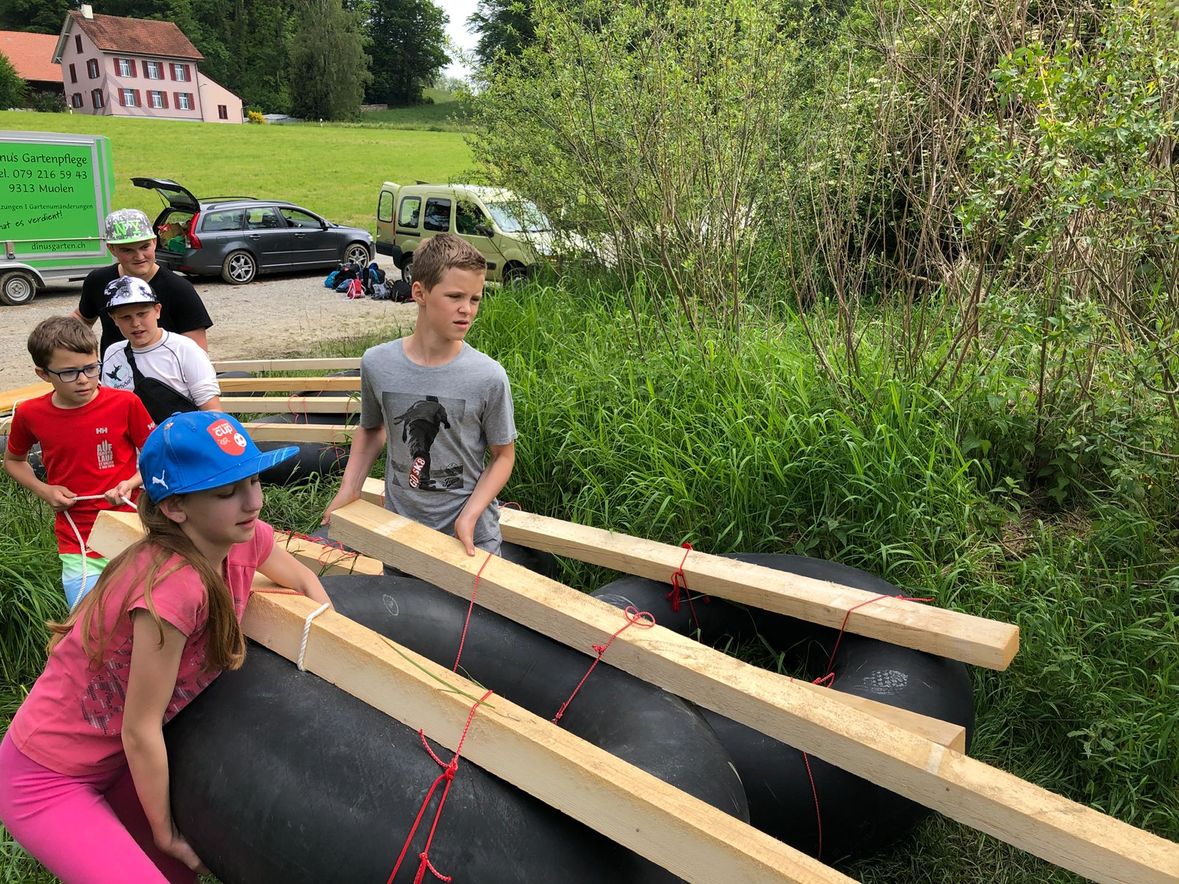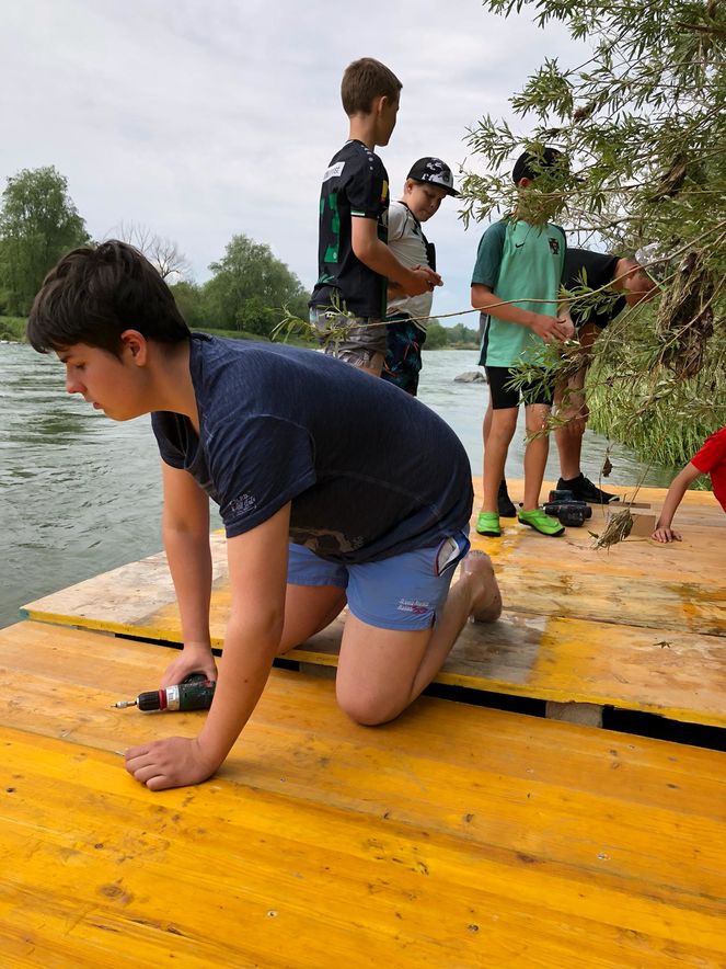 Eifrig wurden als erstes die beiden Flösse zusammen gebaut. Nach der "Schiffstaufe" hiess es dann: Leinen los. Gemütlich liessen wir uns vom Fluss auf seine Reise mitnehmen. Auch Petrus war uns gut gesinnt und beliess es bei ein paar dunklen Gewitterwolken und ab und zu einem Donnergrollen. Leider wurde unsere Fahrt dann doch früher als geplant unterbrochen, da ein Floss kenterte, im Treibholz festgefangen wurde und nicht mehr zu retten war. Die Besatzung konnte sich zum Glück unversehrt ans Ufer retten.