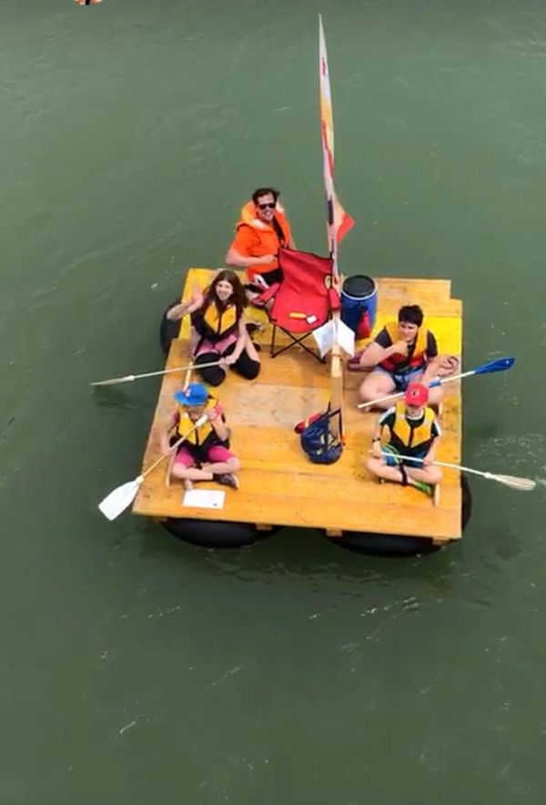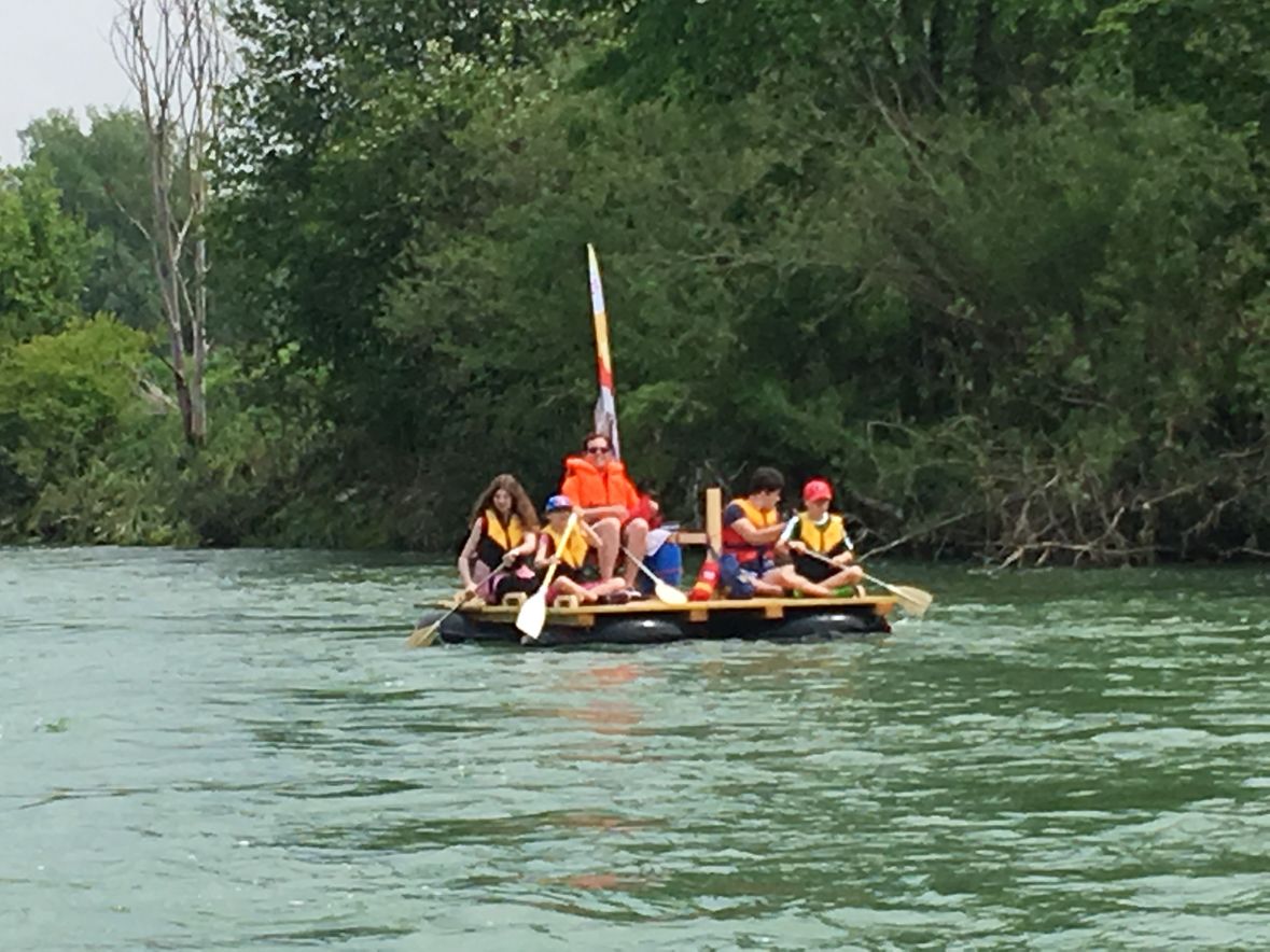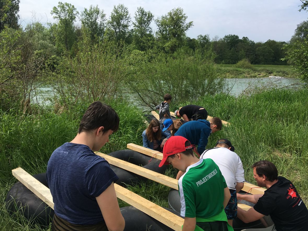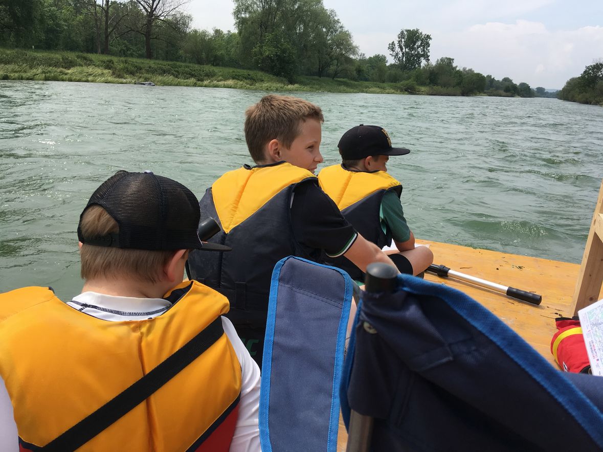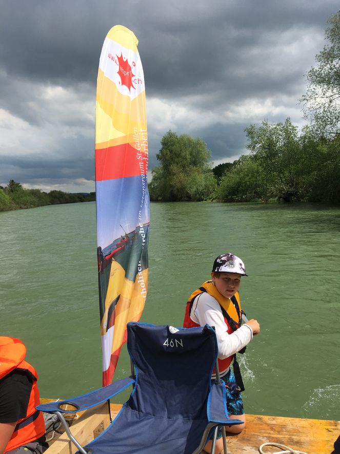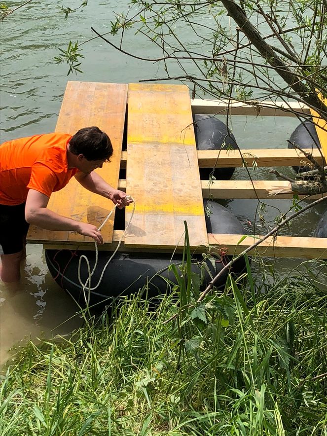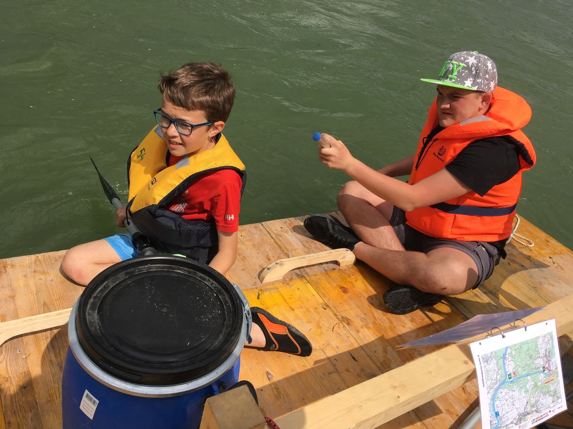 Eifrig wurden als erstes die beiden Flösse zusammen gebaut. Nach der "Schiffstaufe" hiess es dann: Leinen los. Gemütlich liessen wir uns vom Fluss auf seine Reise mitnehmen. Auch Petrus war uns gut gesinnt und beliess es bei ein paar dunklen Gewitterwolken und ab und zu einem Donnergrollen. Leider wurde unsere Fahrt dann doch früher als geplant unterbrochen, da ein Floss kenterte, im Treibholz festgefangen wurde und nicht mehr zu retten war. Die Besatzung konnte sich zum Glück unversehrt ans Ufer retten.