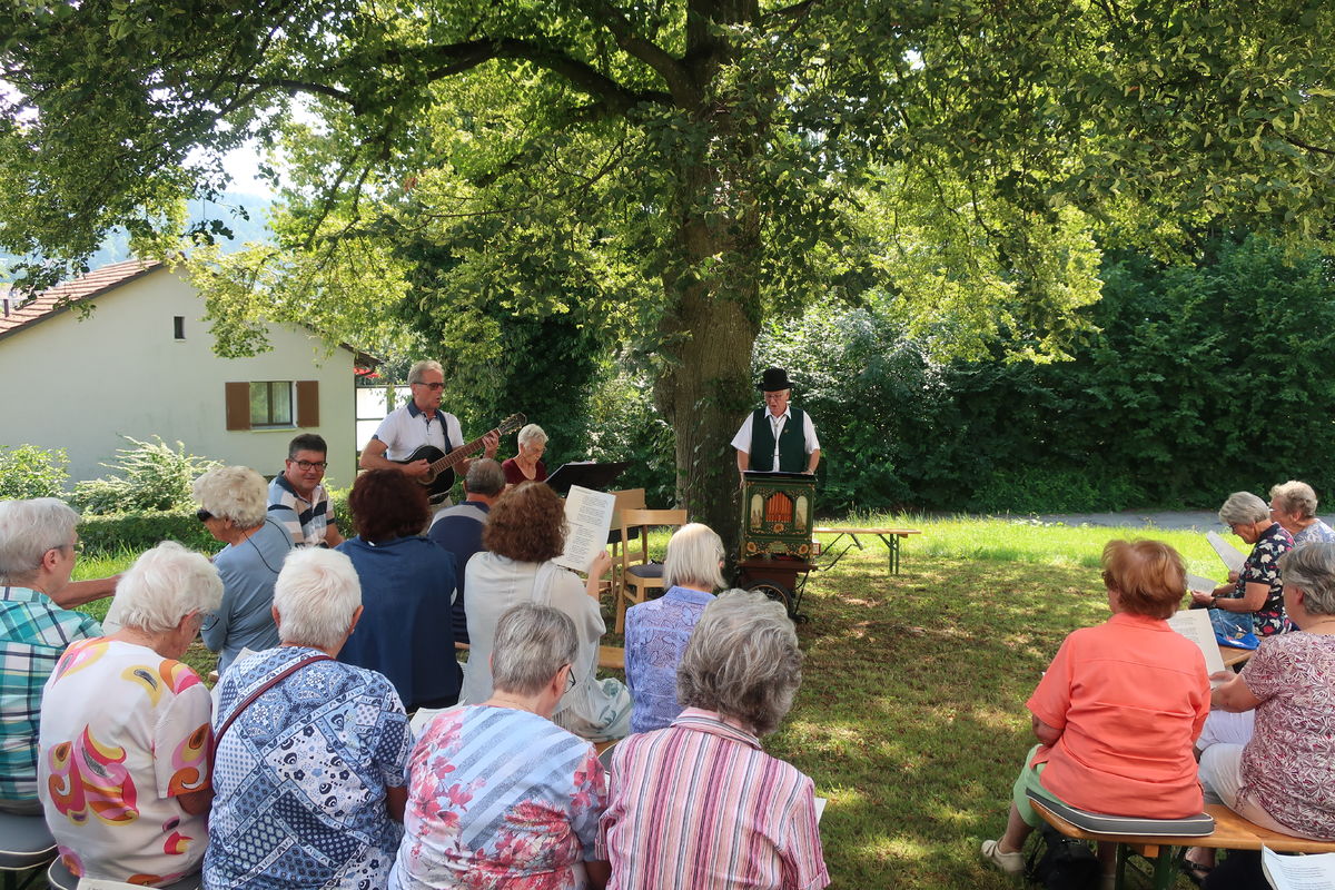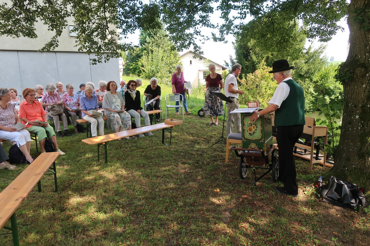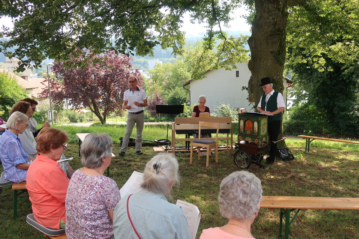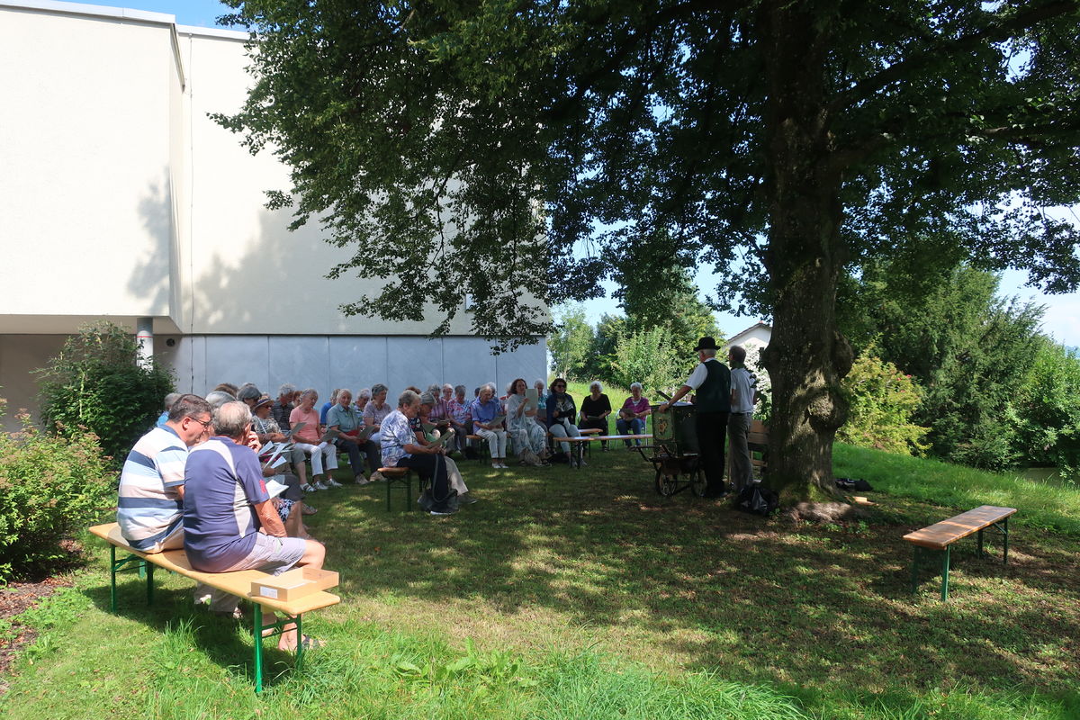 Im Rahmen des ökumenischen Senior*innenprogramms der Krichen Grossacker, St. Fiden, Neudorf, Stephanshorn und Halden trafen wir uns bei wunderbarer Sommerhitze im Schattend der grossen Linde vor dem Kirchgemeindehaus Stephanshorn. Unter der Federführung von Meinrad Leuch schwelgten wir dort in alten Volksweisen. Meinrad hat für diesen Anlass gemeinsam mit seinen beiden Musik-Kolleg*innen Susi Diethelm (Klavier) und Willi Hausammann (Gesang und Gitarre) ein buntes Programm zusammengestellt. Vorgetragene Liedern wechselten sich mit gemeinsam gesungenen ab. In seiner gewohnt humorvollen und mitreisenden Art schenkte uns Meinrad einen vergnüglichen Nachmittag. Natürlich durfte auch seine Drehorgel nicht fehlen. Mit ihr begrüsste er die ankommenden Senior*innen.