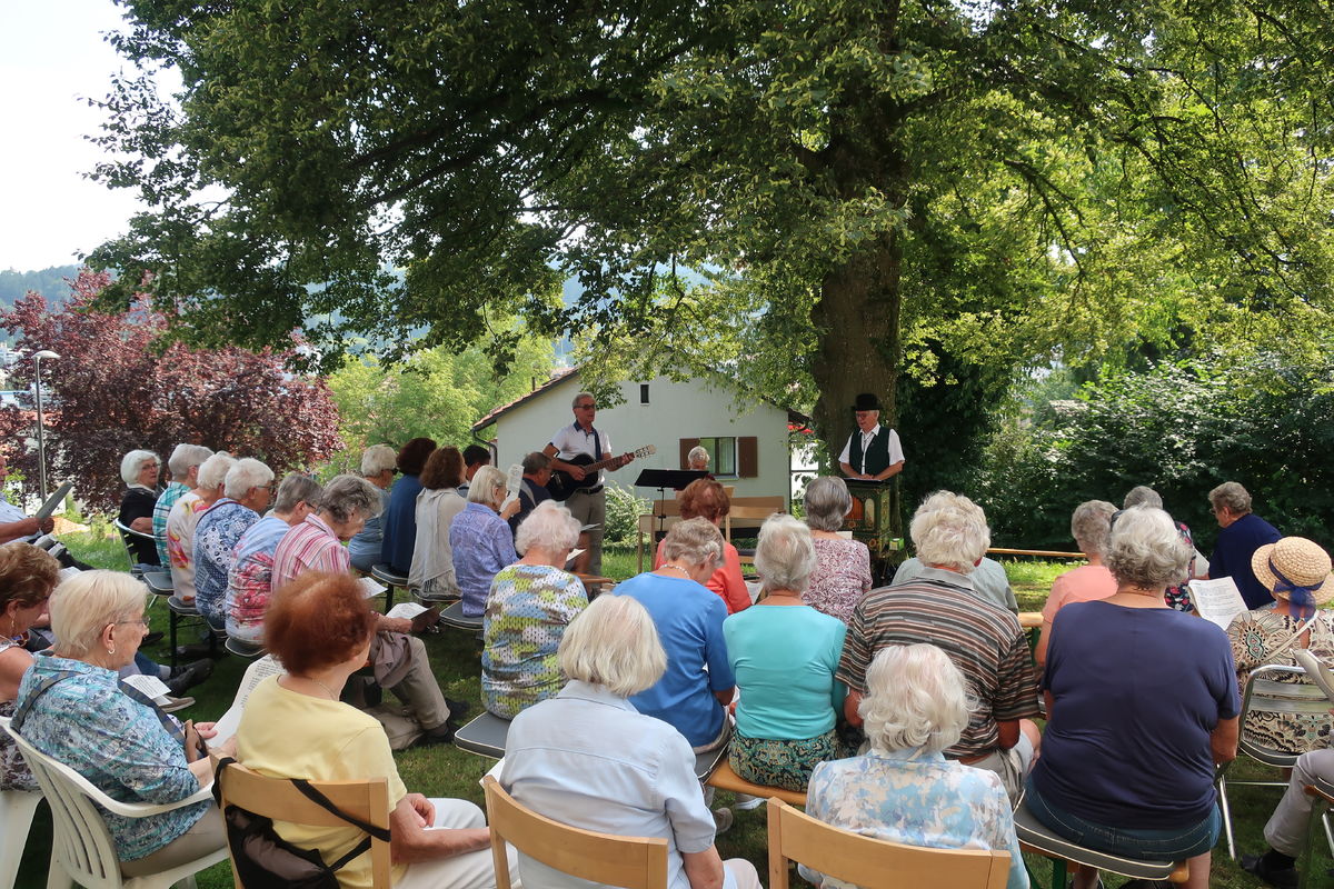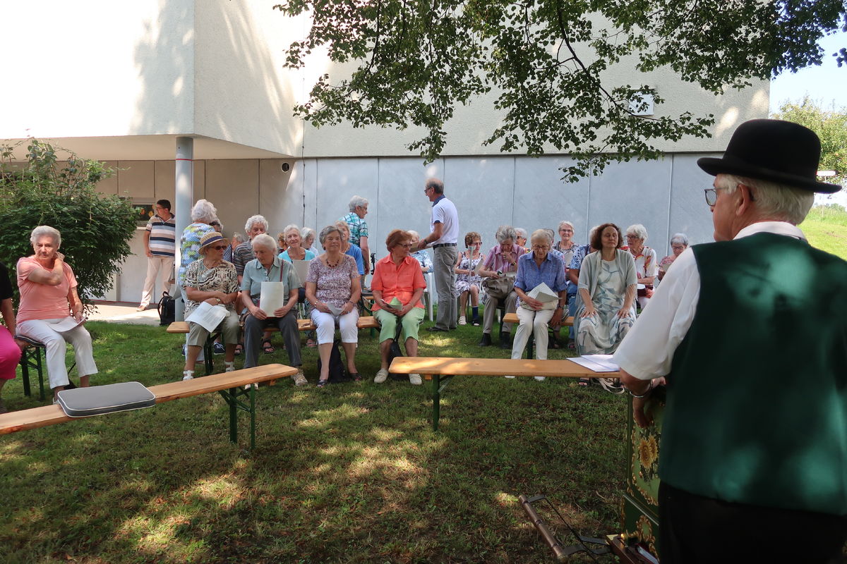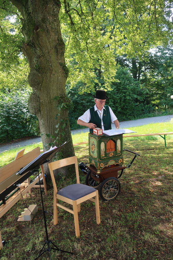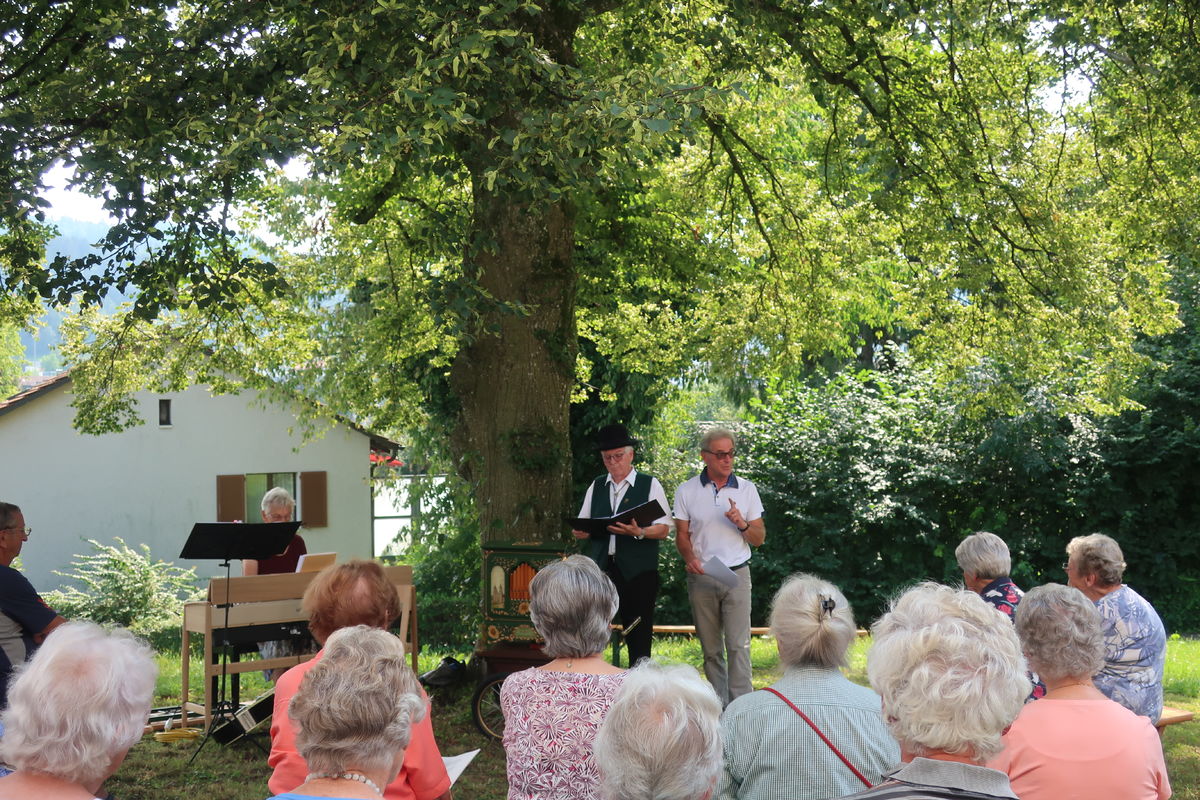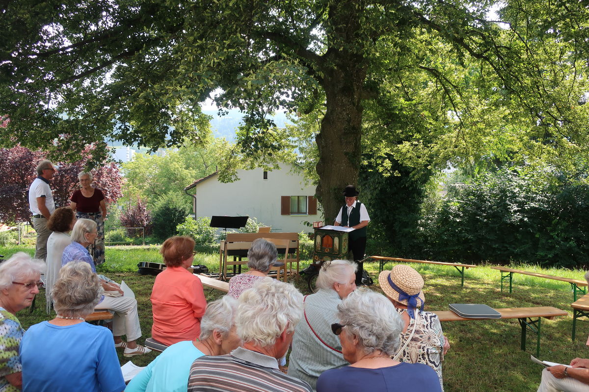 Im Rahmen des ökumenischen Senior*innenprogramms der Krichen Grossacker, St. Fiden, Neudorf, Stephanshorn und Halden trafen wir uns bei wunderbarer Sommerhitze im Schattend der grossen Linde vor dem Kirchgemeindehaus Stephanshorn. Unter der Federführung von Meinrad Leuch schwelgten wir dort in alten Volksweisen. Meinrad hat für diesen Anlass gemeinsam mit seinen beiden Musik-Kolleg*innen Susi Diethelm (Klavier) und Willi Hausammann (Gesang und Gitarre) ein buntes Programm zusammengestellt. Vorgetragene Liedern wechselten sich mit gemeinsam gesungenen ab. In seiner gewohnt humorvollen und mitreisenden Art schenkte uns Meinrad einen vergnüglichen Nachmittag. Natürlich durfte auch seine Drehorgel nicht fehlen. Mit ihr begrüsste er die ankommenden Senior*innen.