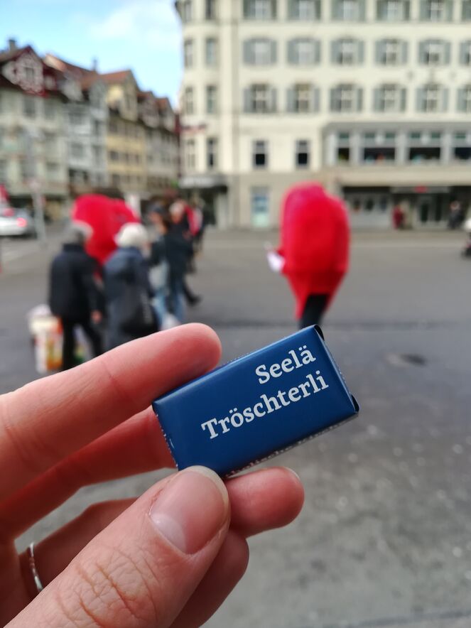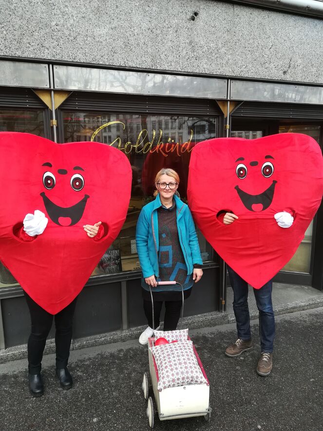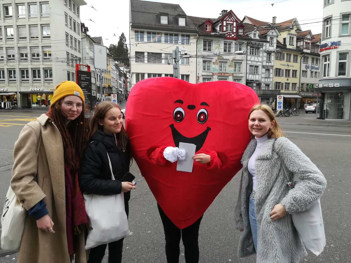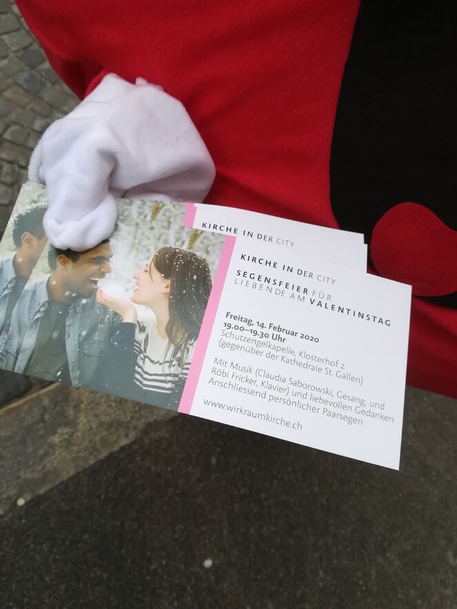 Das Team der Cityseelsorge machte am Nachmittag des Valentinstags in der St. Galler Innenstadt Werbung für die Segensfeier. Als Herz verkleidet ergaben sich einige spannende und natürlich humorvolle Begegnungen, die den einen oder die andere in die Schutzengelkapelle lockten. Ausserdem wünschten sich Passantinnen und Passenten immer wieder auch ein Herz-Umarmung!