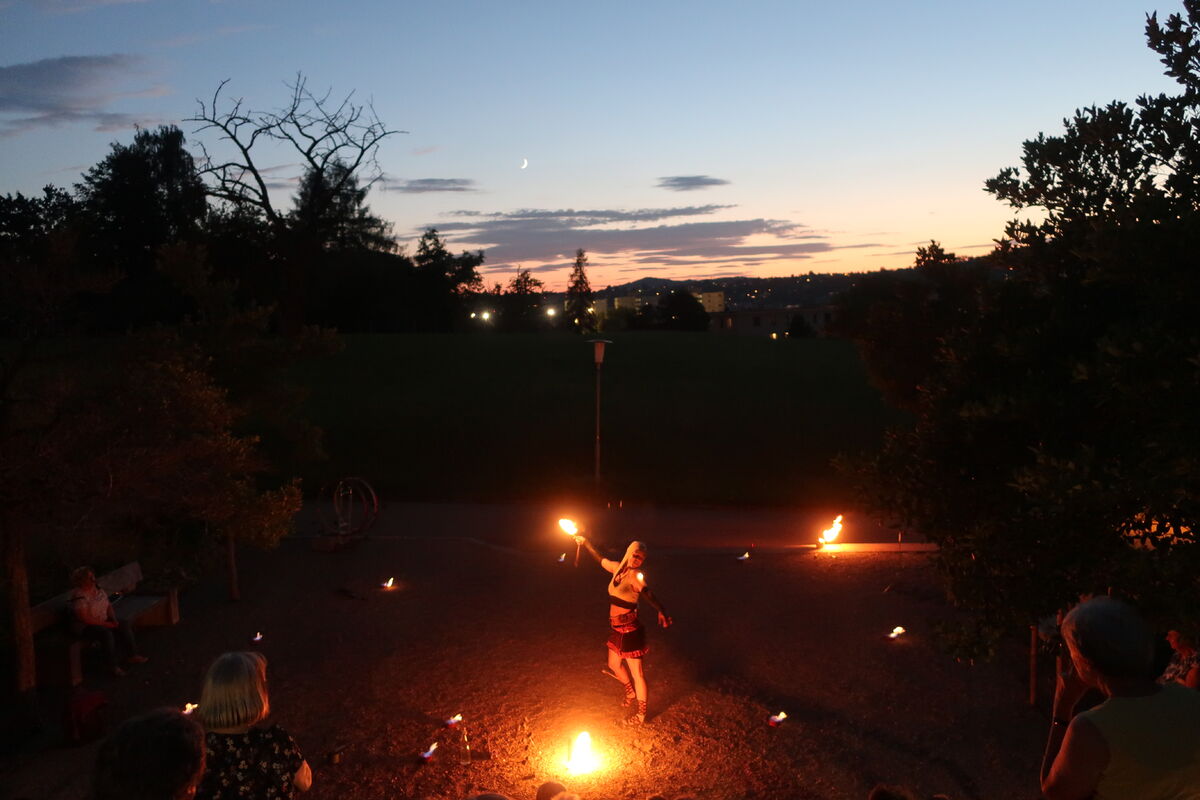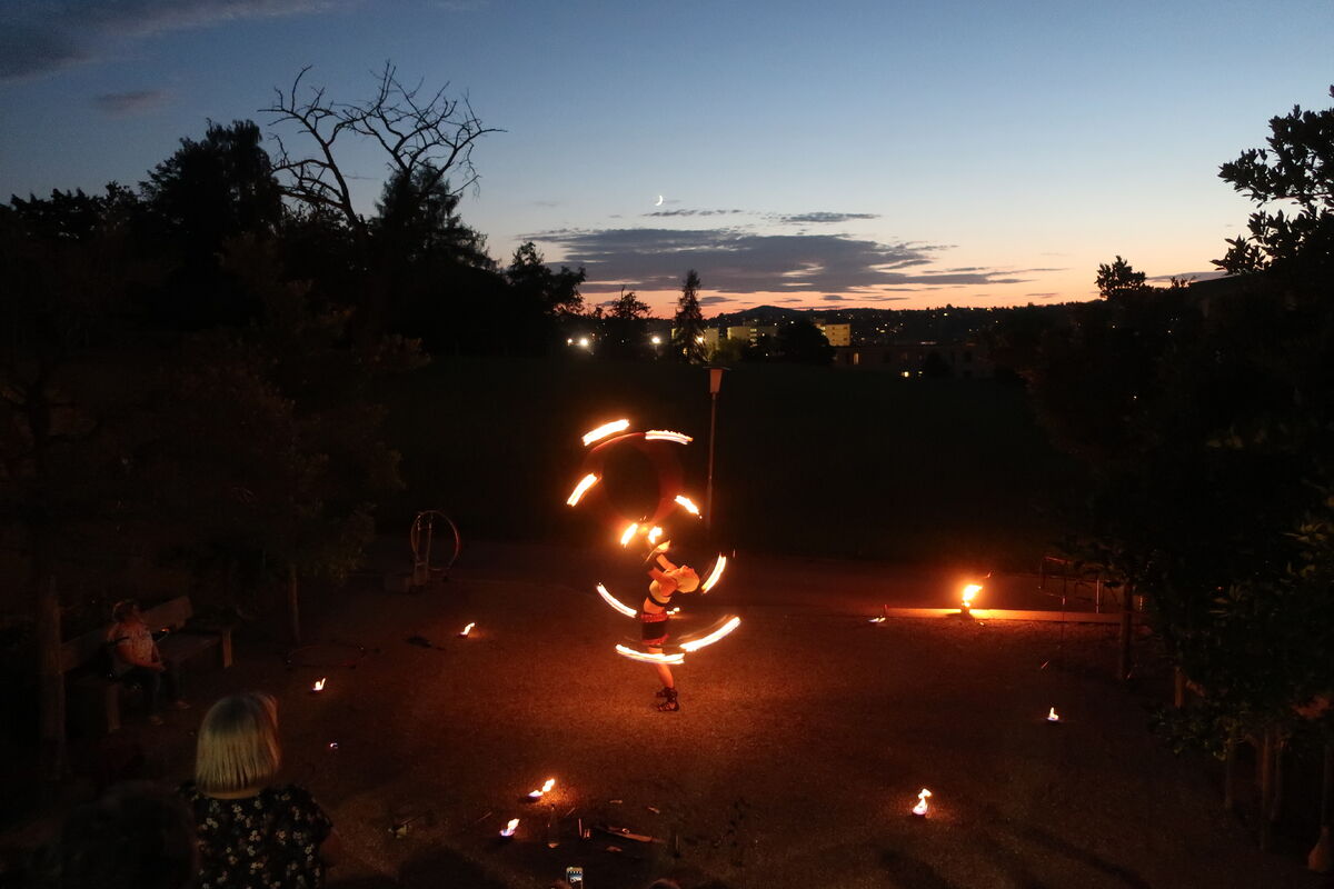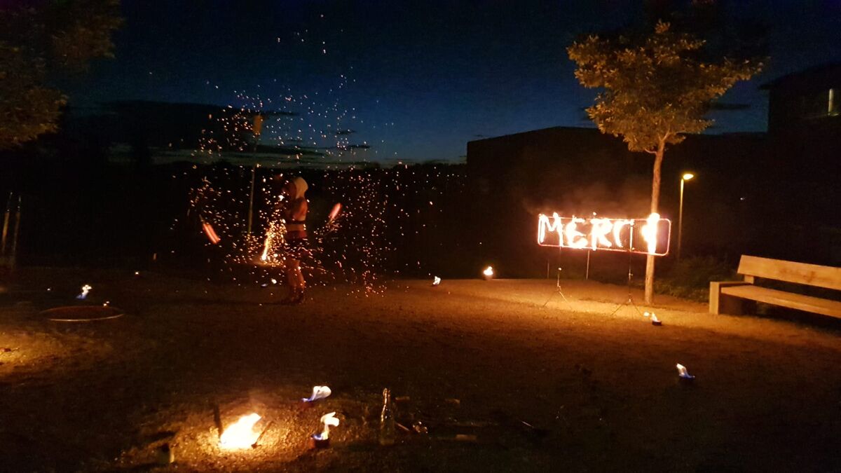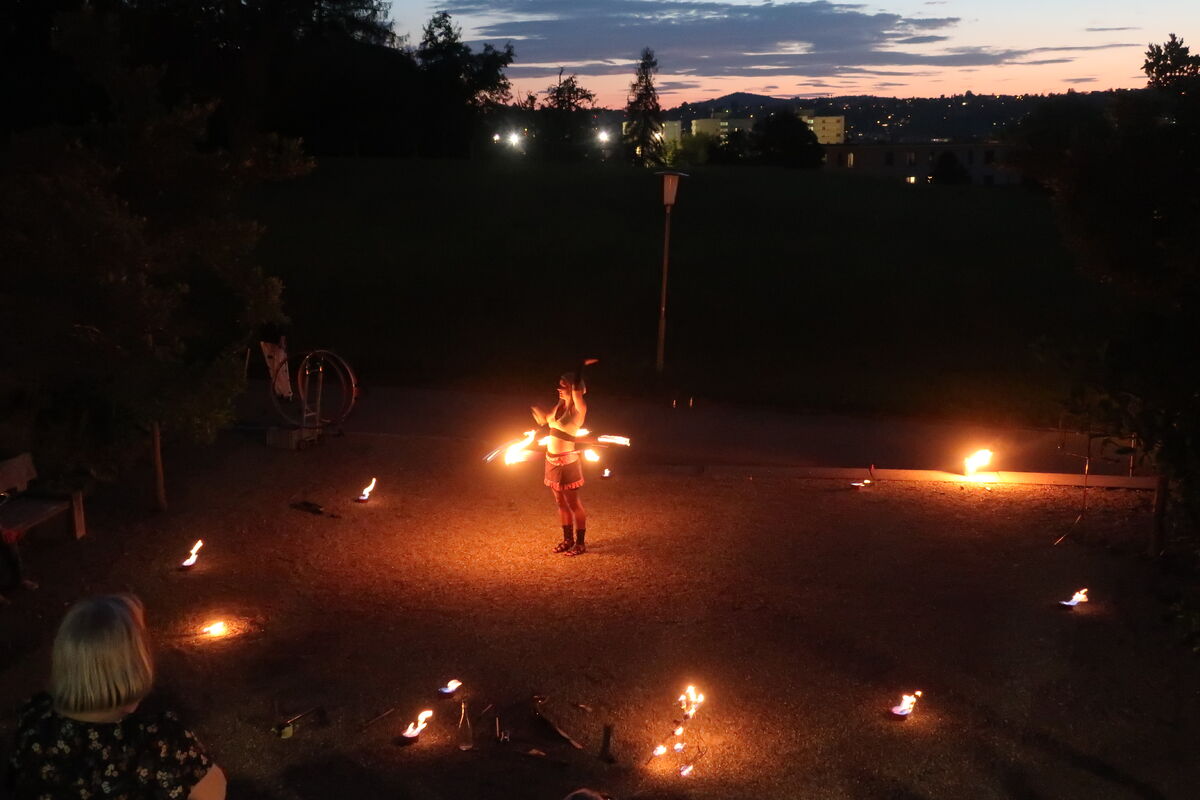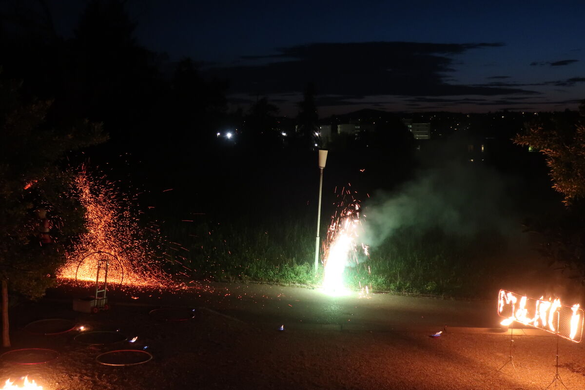 Corona-konform sagte das Team der ökumenischen Gemeinde Halden am Freitag-Abend "Merci" - Höhepunkt war eine Feuershow im Freien bei Dämmerung.