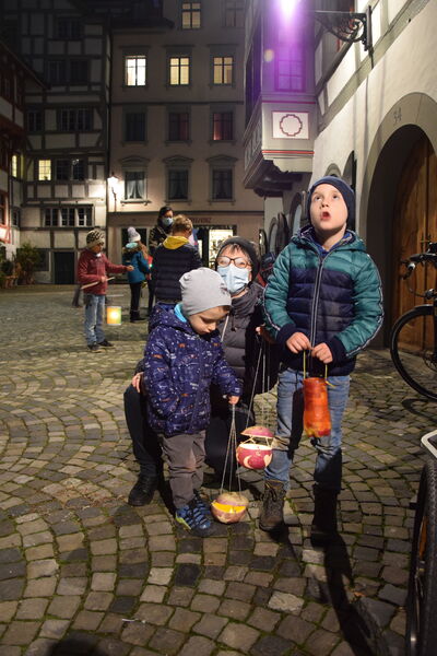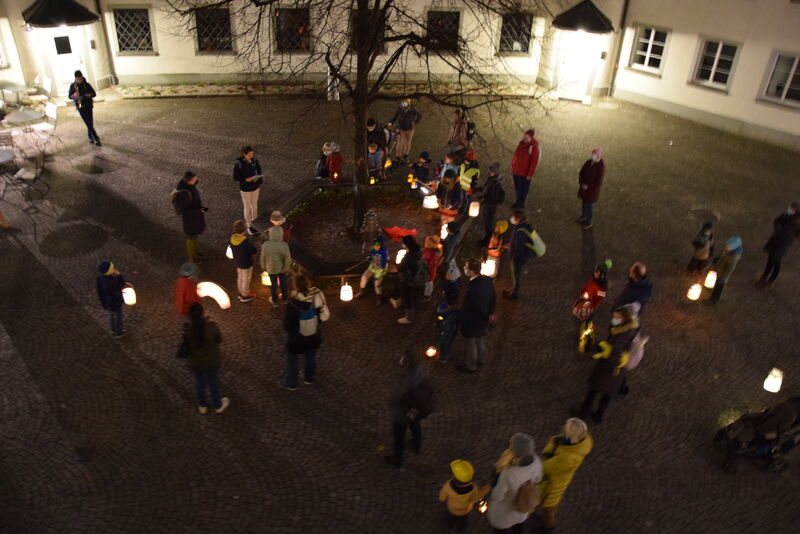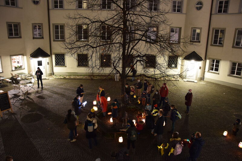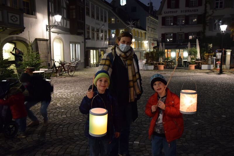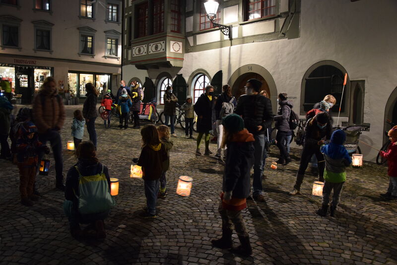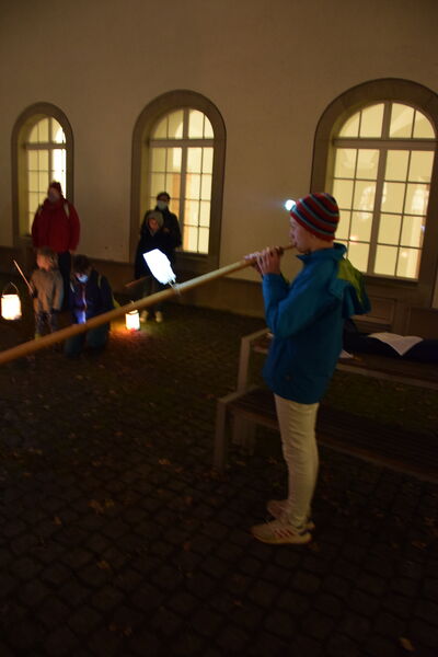 Mit leuchtenden, selbstgebastelten Laternen machten sich Kinder und Erwachsene auf den Martinsumzug. Wunderbar begleitet wurden sie von Trompeten- und Alphornklängen.
