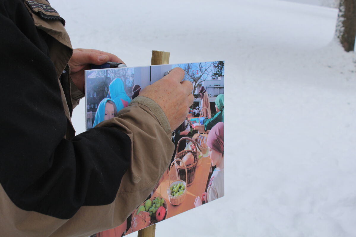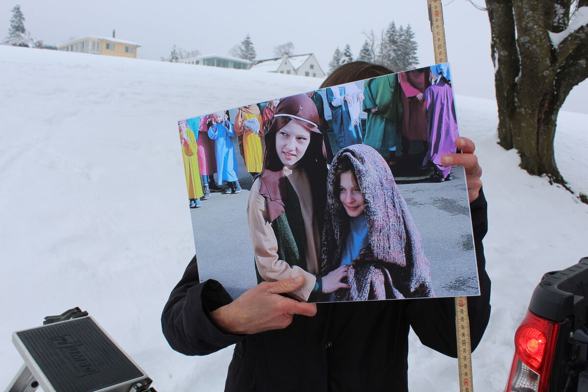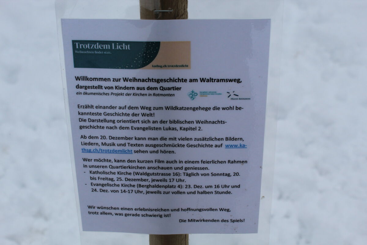 Fleissige Mitarbeiter der Pfarrei Rotmonten sind am Freitag bei Schnee und ein wenig Sonnenschein die Bilder der Weihnachtsgeschichte am Waltramsweg aufstellen gegangen.