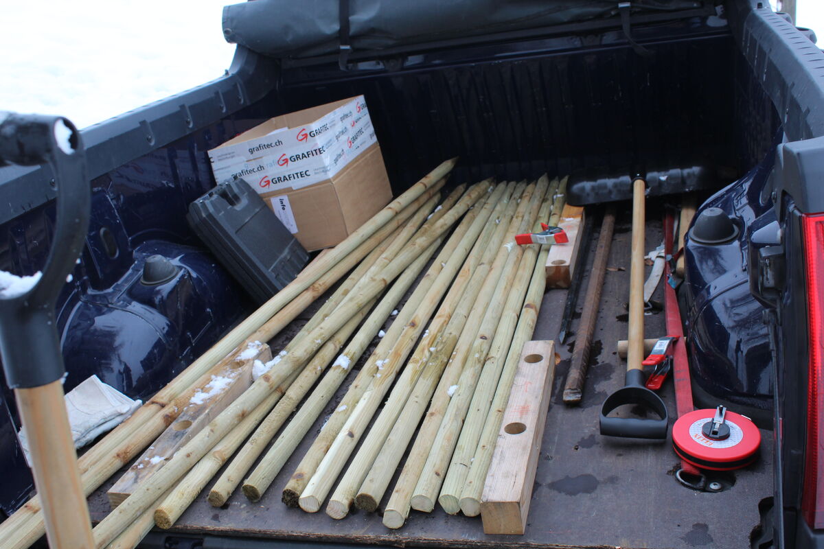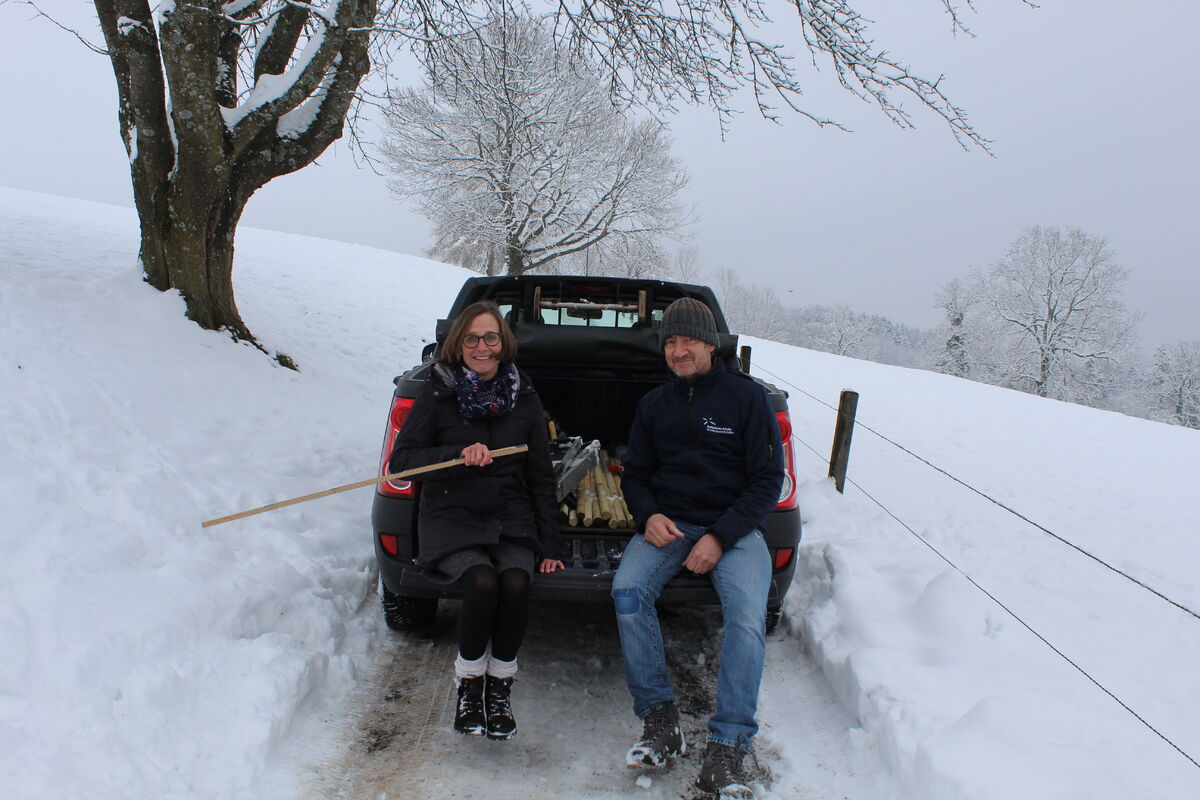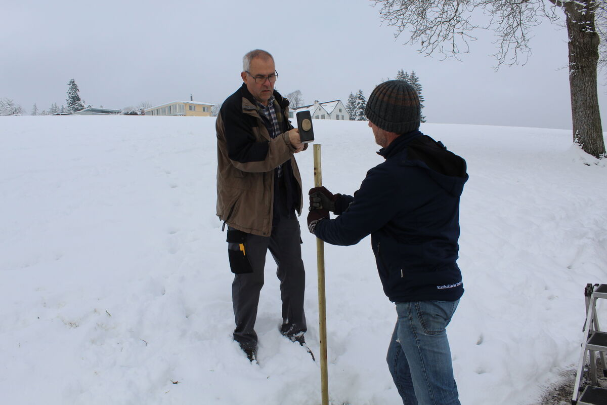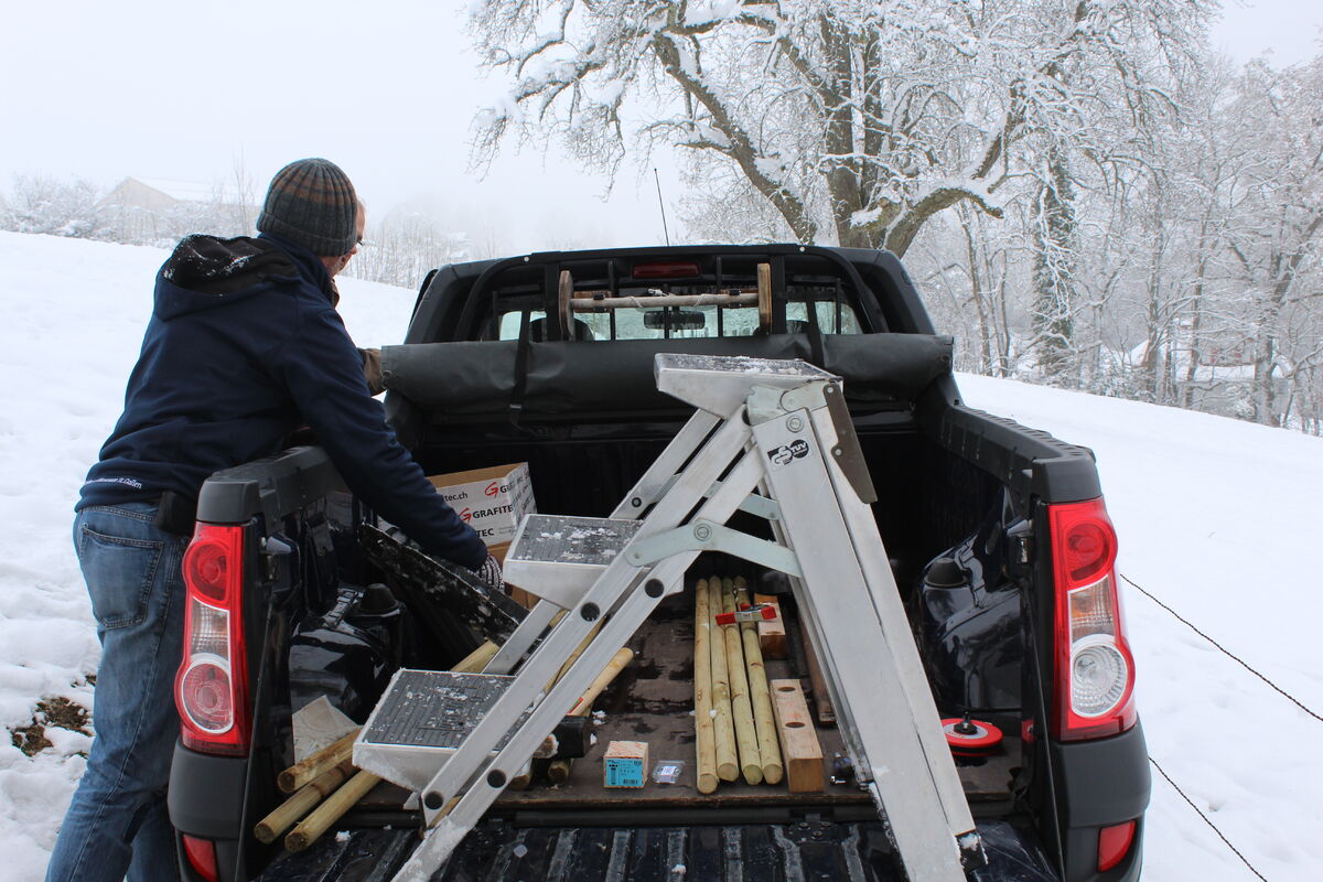 Fleissige Mitarbeiter der Pfarrei Rotmonten sind am Freitag bei Schnee und ein wenig Sonnenschein die Bilder der Weihnachtsgeschichte am Waltramsweg aufstellen gegangen.