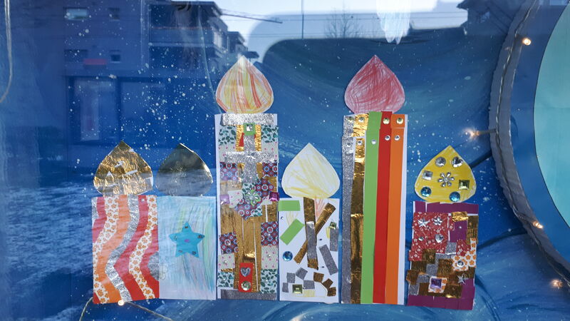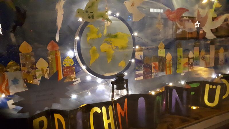 Schüler gestalten für die Adventsfenster Friedenszeichen mit guten Wünschen für alle.