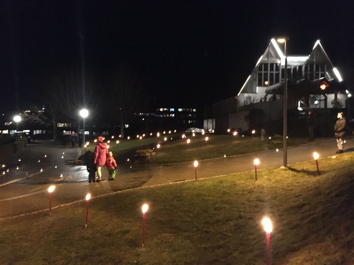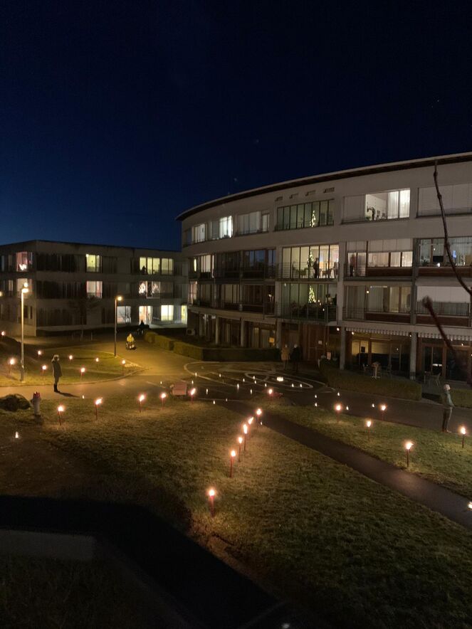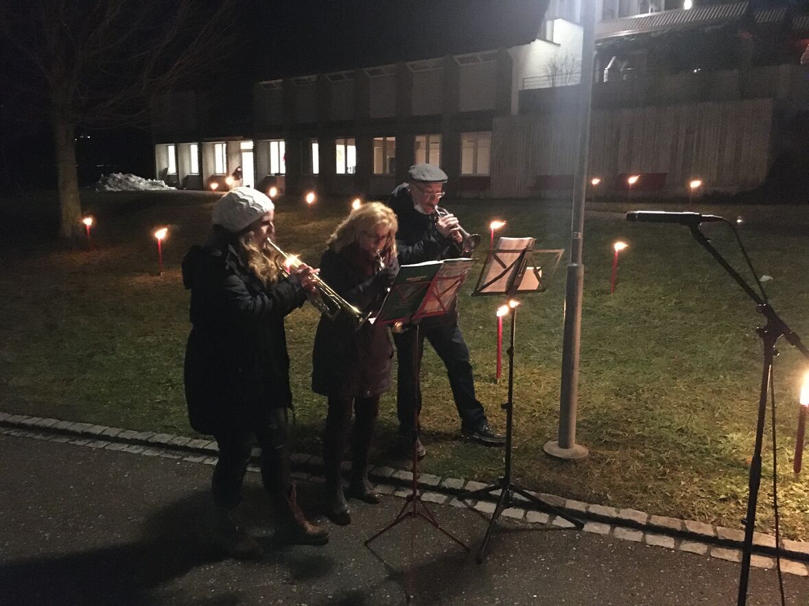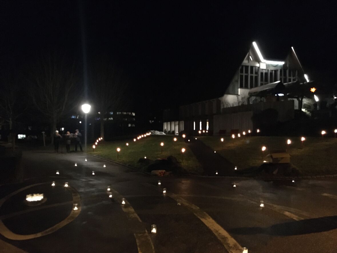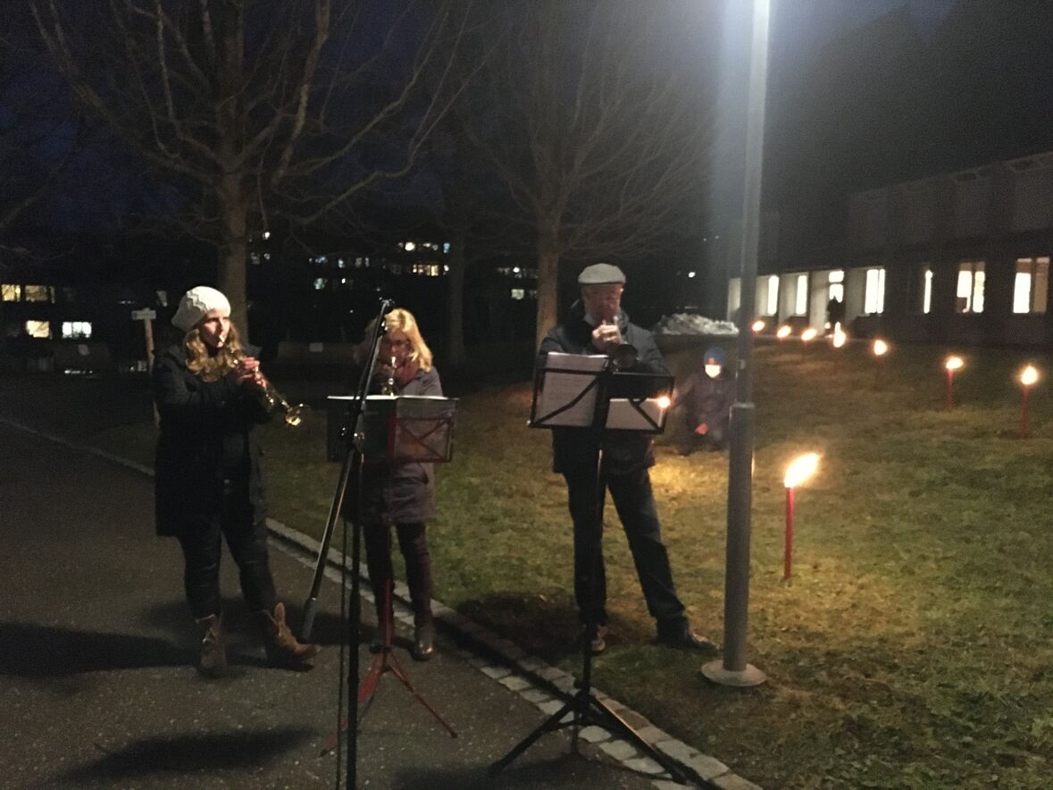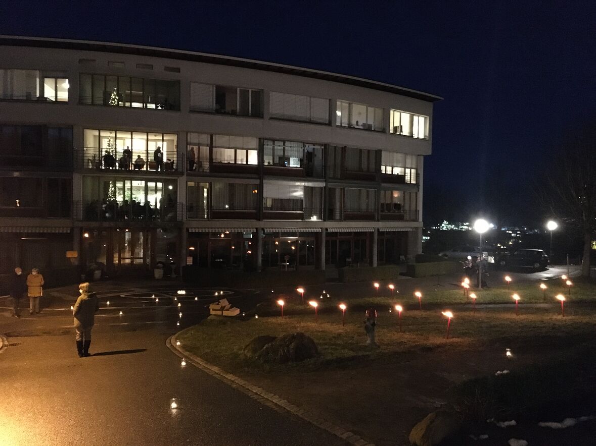 Im Rahmen dieses Adventskalenders fand am Donnerstag-Abend, 17. Dezember, auf der Wiese zwischen Betagtenheim Halden und Kirche Halden eine feierliche Übergabe vom Adventshüsli mit der Nummer 18 statt. Die Bewohner*innen des Betagenheims Halden haben dieses Hüsli gestaltet und "eingetauscht" gegen das Friedenslicht aus Bethlehem. Unsere Pfadi Fontana hat das Licht übergeben und auf der Wiese für die Bewohner*innen einen grossen Stern aus brennenden Fackeln gesteckt. Der Anlass wurde von einem kleinen Bläserensemble musikalisch umrahmt.