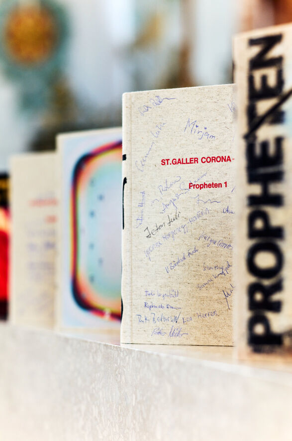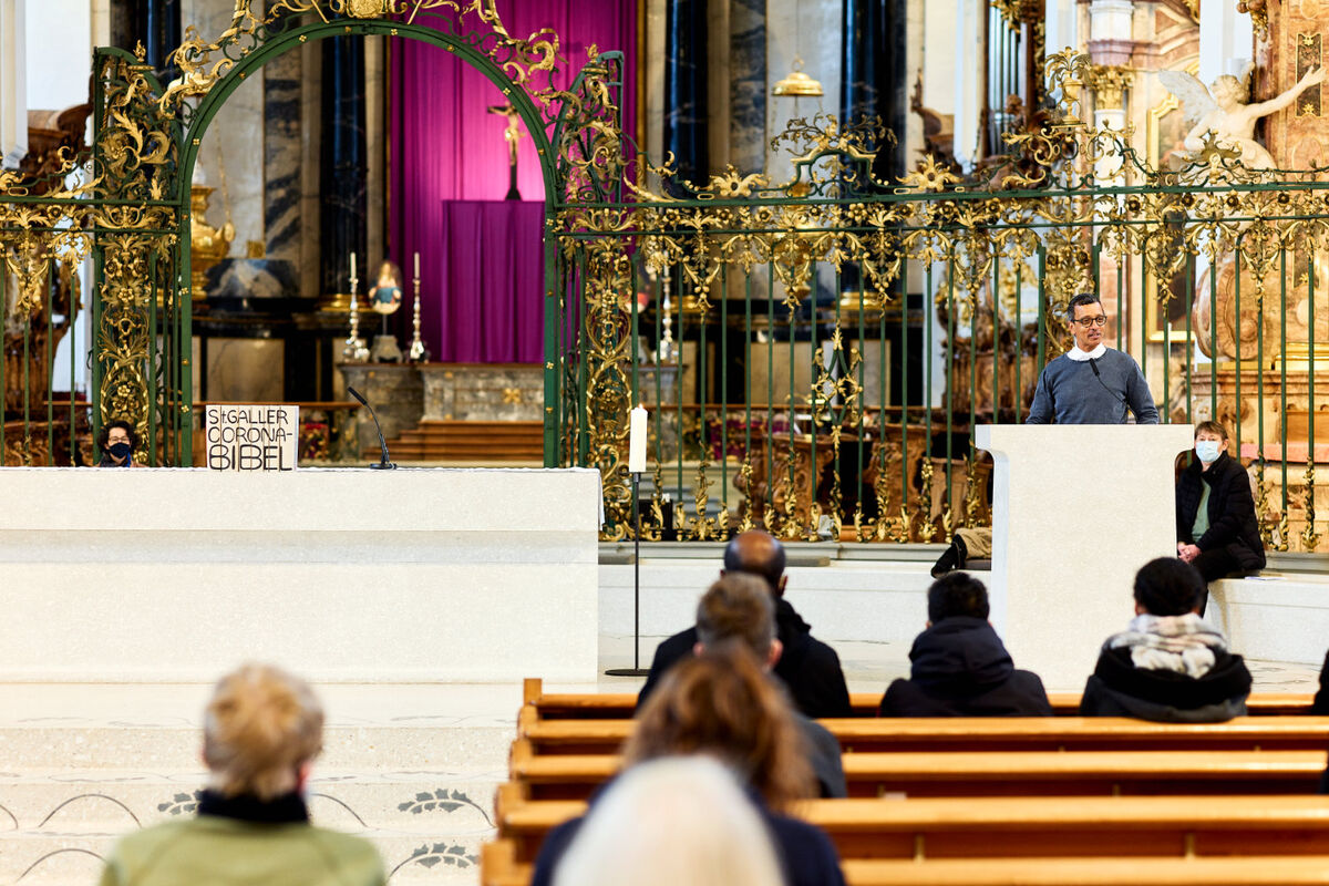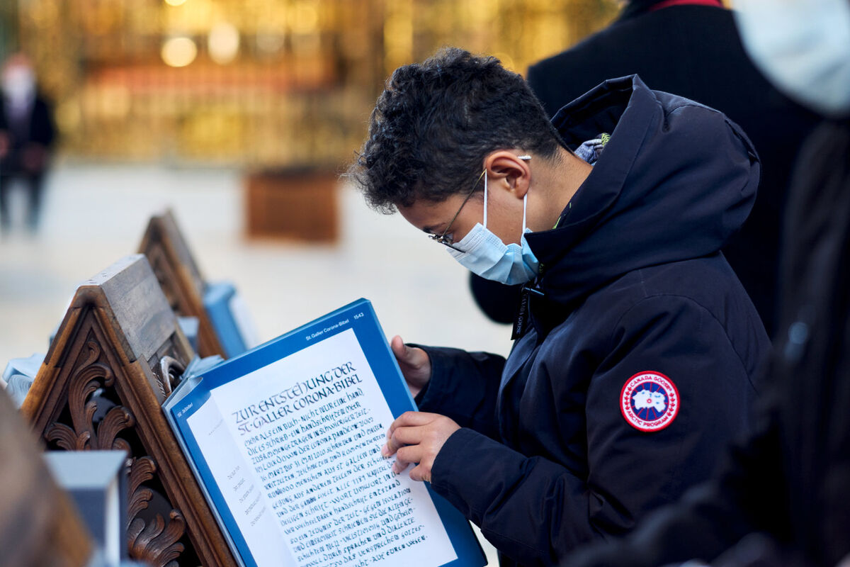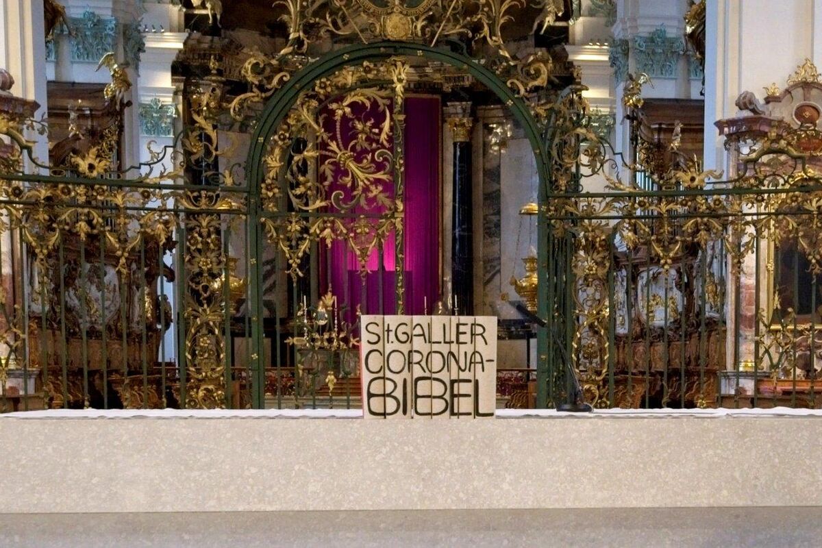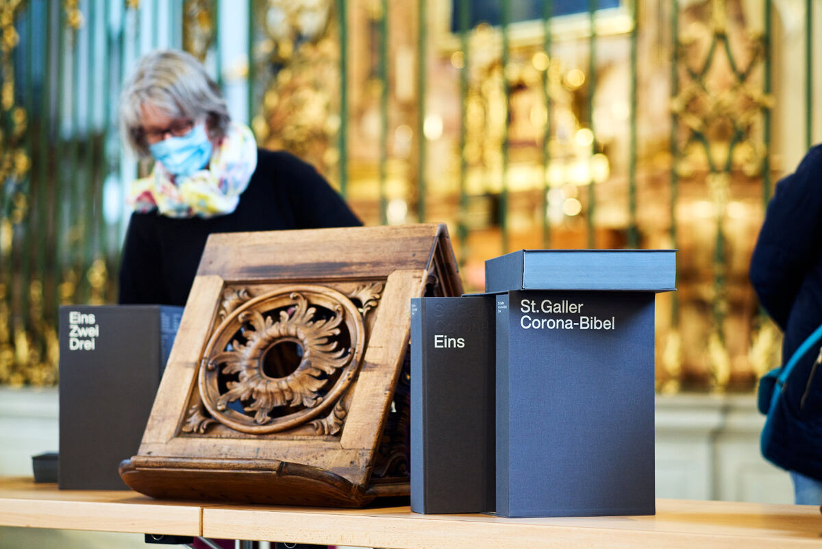 Am Jahrestag des ersten Lockdowns in der Schweiz, dem 14. März 2021, wurde die St.Galler-Coronabibel in der Kathedrale St.Gallen dem Stiftsbibliothekar Cornel Dora und somit der Stiftsbibliothek übergeben. Dieser Feier gingen drei dezentrale Feiern in St.Maria Neudorf, St.Laurenzen und evang.-ref. Bruggen voraus. Auf www.coronabibel.ch findet sich die ganze Corona-Bibel zum Durchblättern und viele Informationen zur Entstehung.