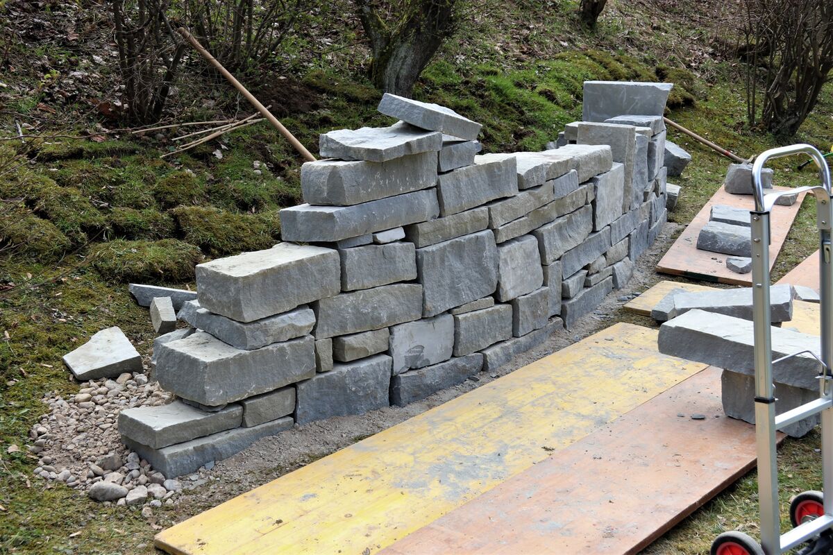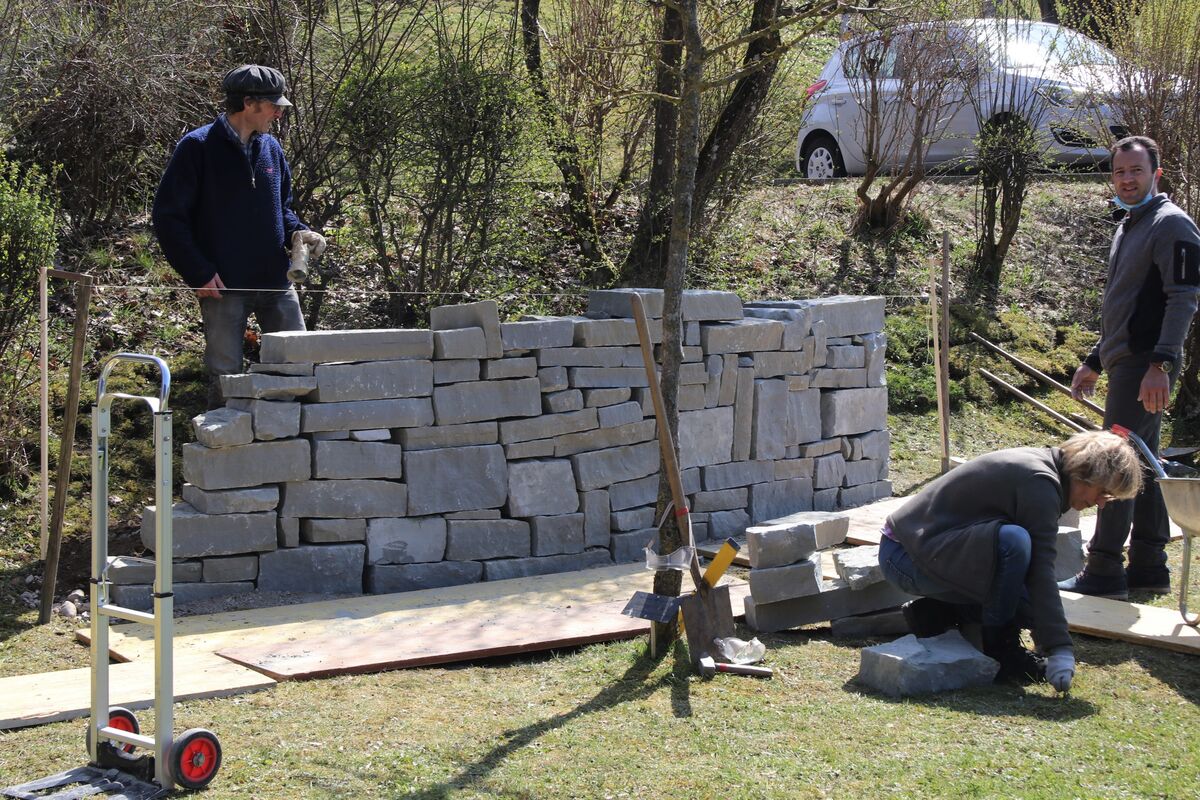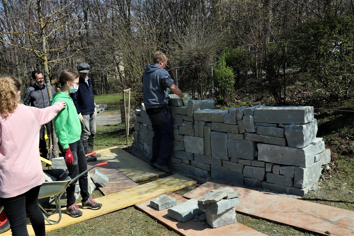 Bau einer Trockenmauer auf der Wiese vor der Haldenkirche « zurück