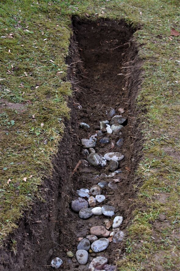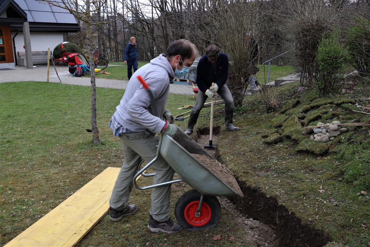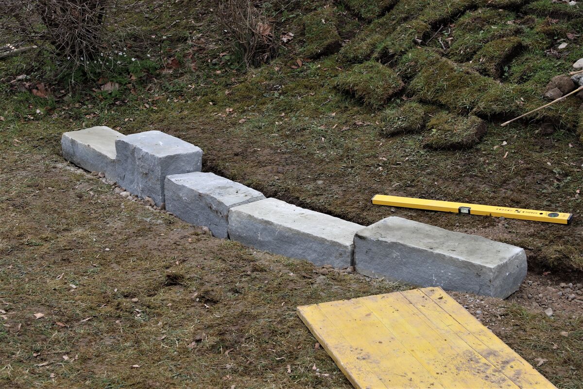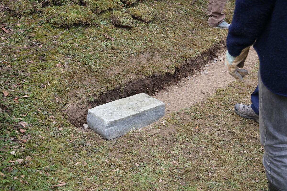 Bau einer Trockenmauer auf der Wiese vor der Haldenkirche « zurück