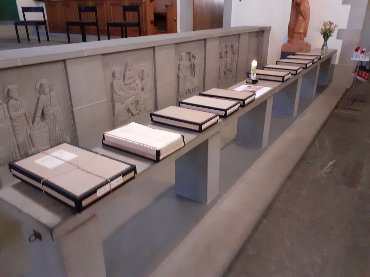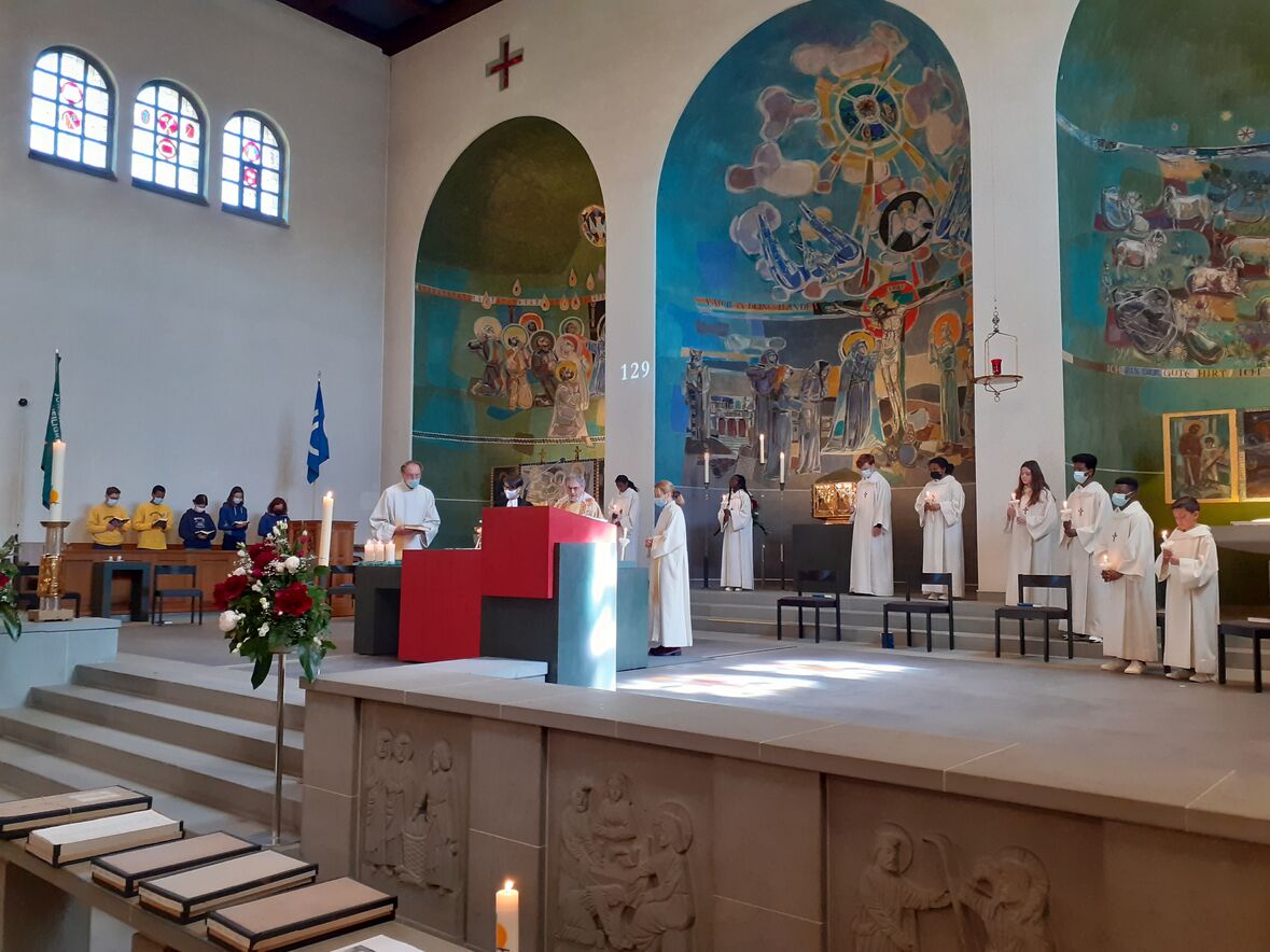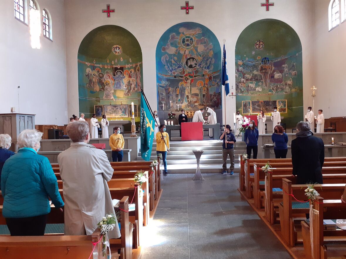Die Ministranten gaben dem Kirchenfest trotz Corona Glanz und Frische. 12 Ministranten vertraten die Mini Schar. Dazu gesellten sich Leiter der Jungwacht und Leiterinnen des Blaurings. Gastpredigerin war die evangelische Pfarrerin Birke Müller. Jasmina Golnik konnte mit WorldVoices nicht auftreten und sang darum als Solistin begleitet von Dario Canal. Die schweren Bücher mit den Sammlungen für den Kirchenbau lagen auf. In der grössten Wirtschaftskrise, die St. Gallen je gesehen hat, sammelten die fleissigen Heiligkreuzer Fr. 1'215'118.64 für die Kirche. Einmal mehr: vielen Dank für unsere wunderschöne Kirche!