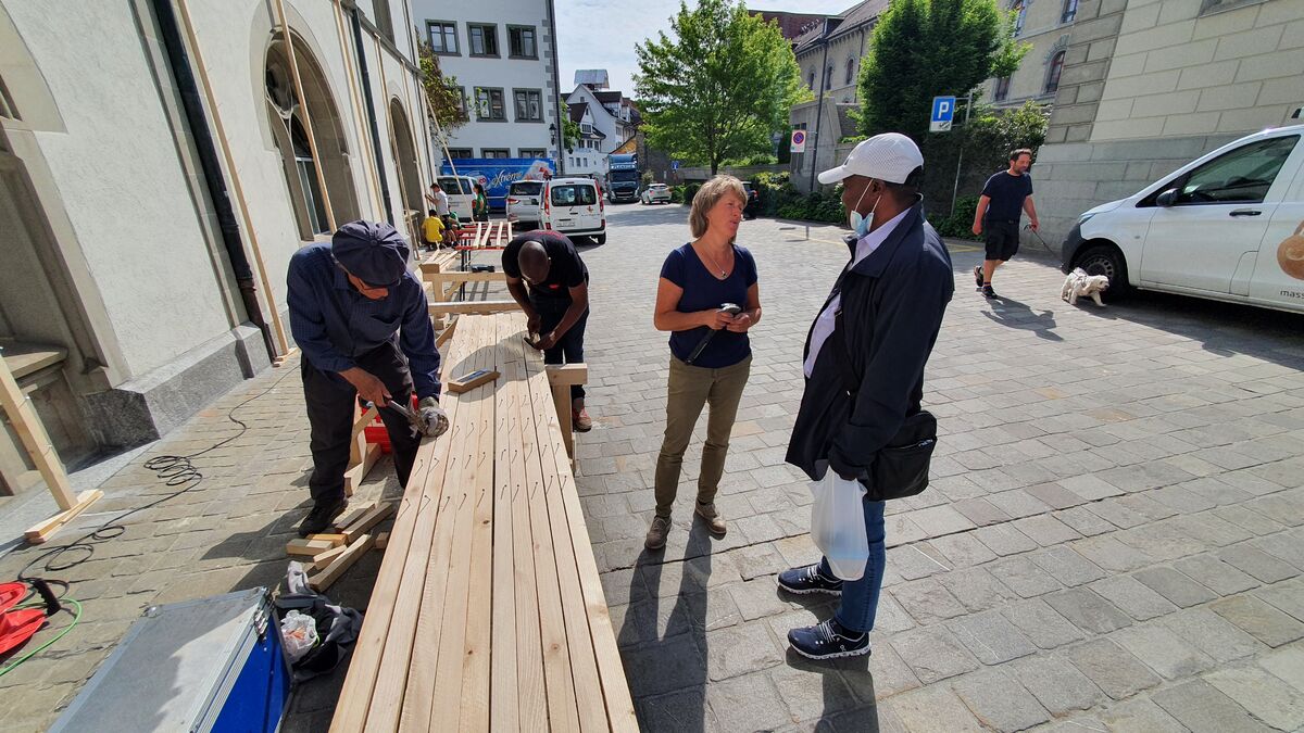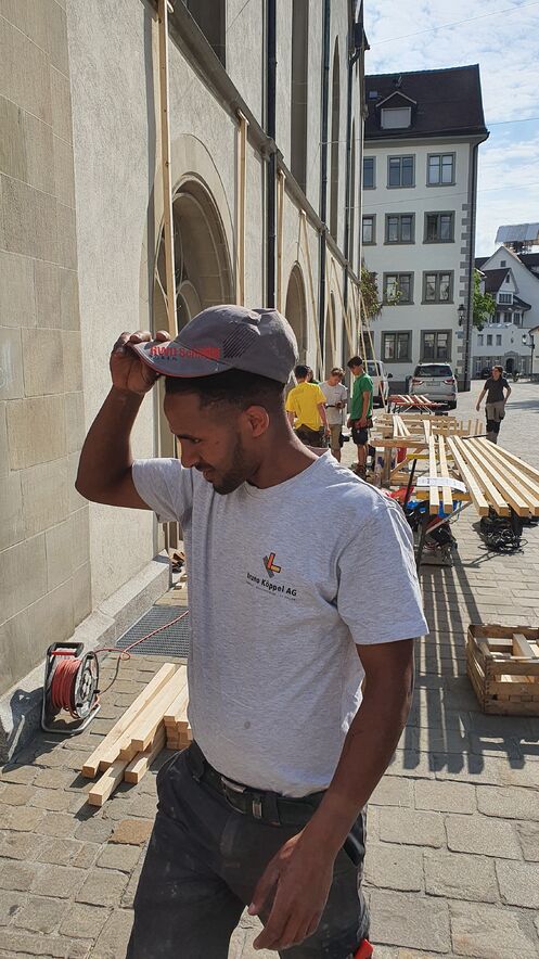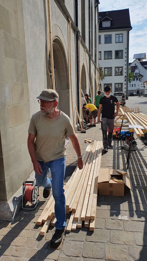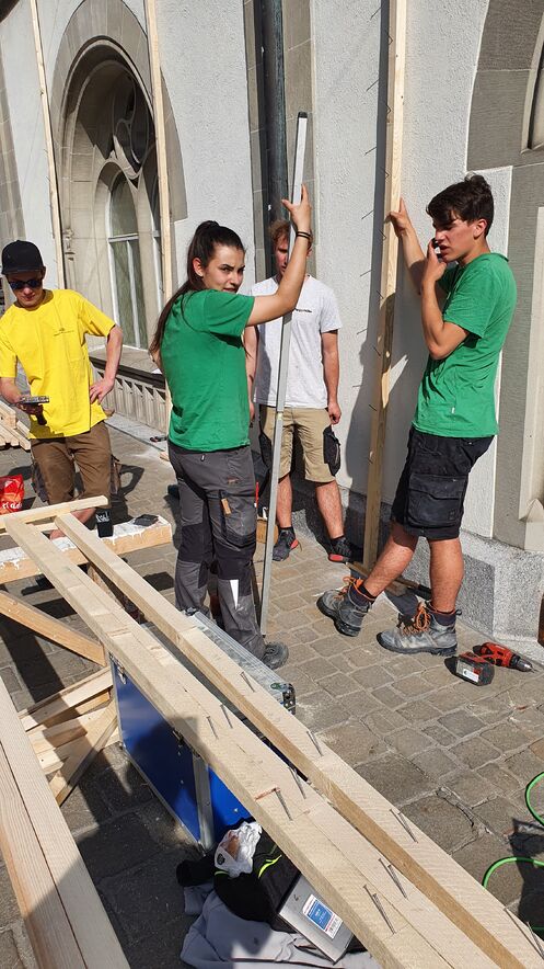 Dafür bauten am Freitag 4. Juni acht Lehrlinge der Holzbaufirmen Schreinerei Koster / Schreinerei Bock / Schreinerei Ambrosch / Sutter Zimmerei Holzbau / Zimmerei B. Köppel und HP Müller die nötige Holzkonstruktion auf. Wir danken den genannten Firmen ganz herzlich für ihre Unterstützung!