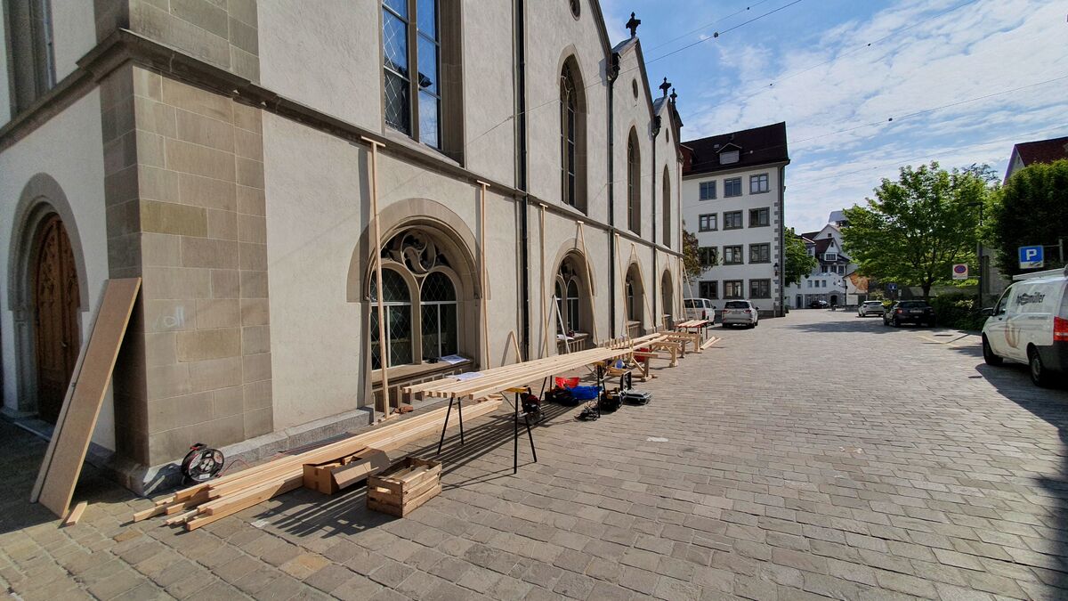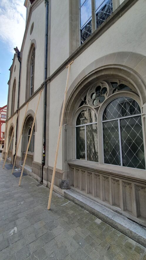 Ihr Namen werden auf Stoffstreifen geschrieben und an der Fassade der St.Laurenzenkirche aufgehängt.