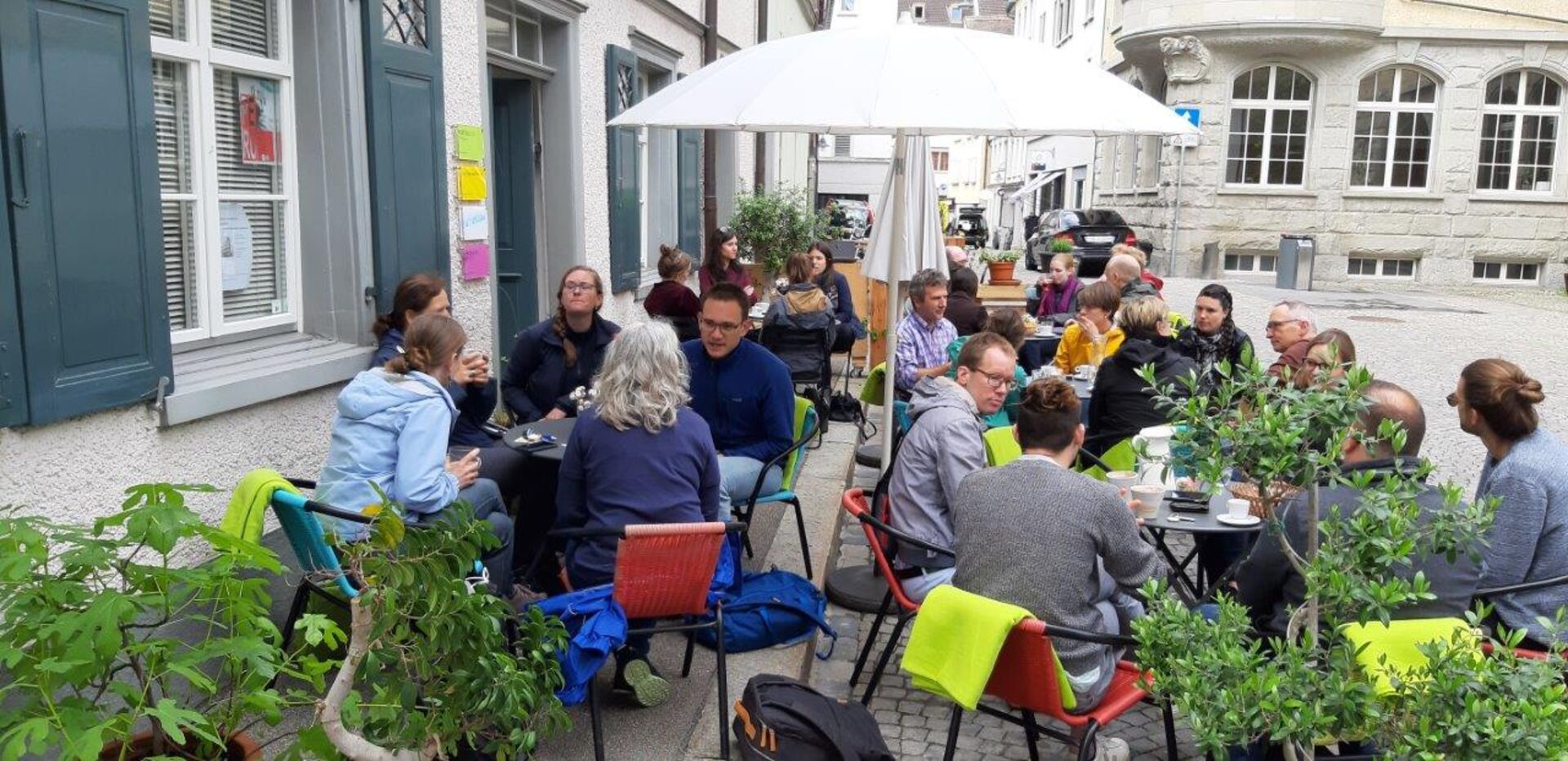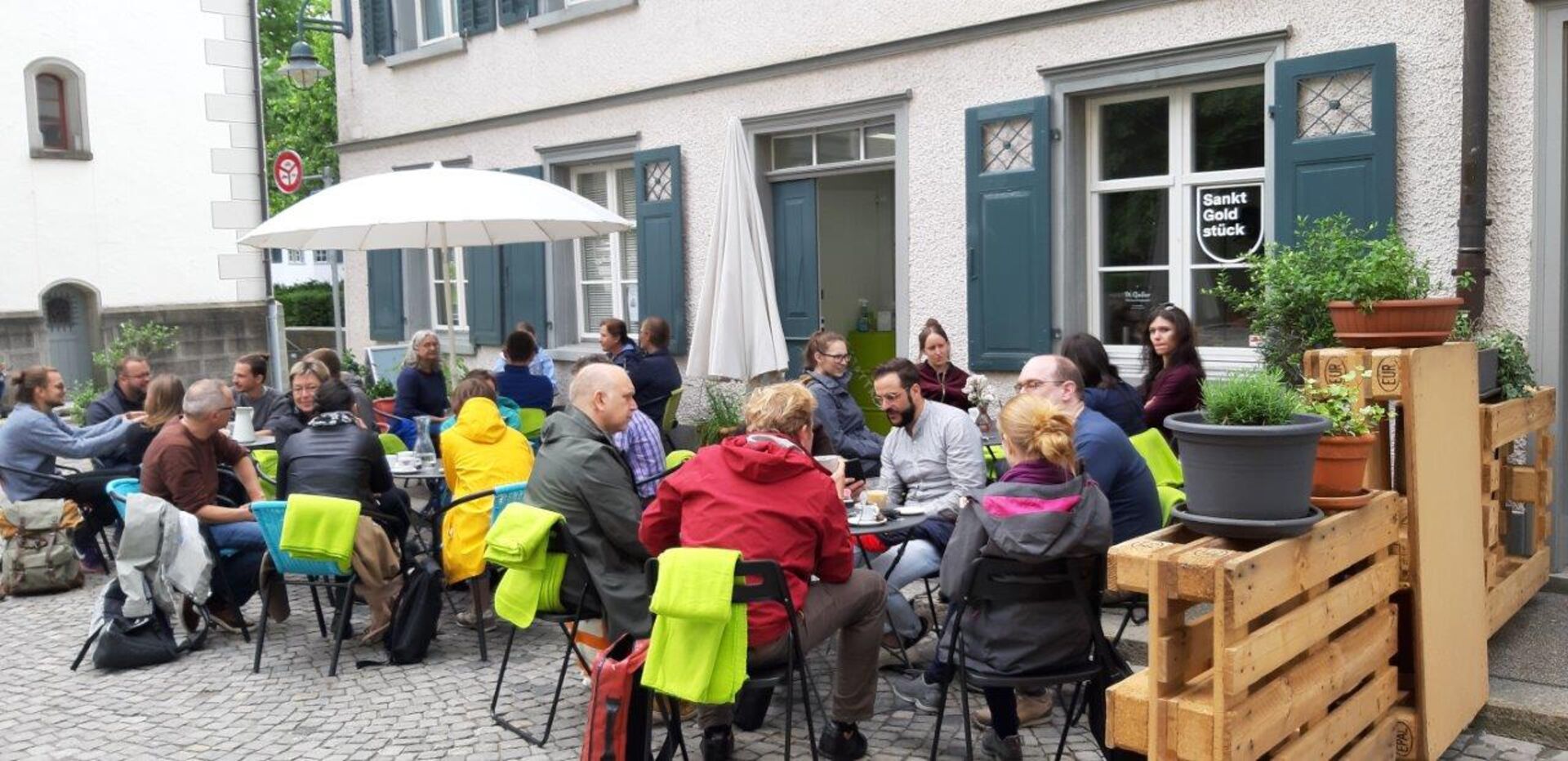 Bei ihren Weiterbildungstagen besuchen die 26 Personen, verschiedene Projekte in und um St.Gallen. Dabei lassen sie sich von der Arbeit des Wirkraumkirche mit den verschiedenen Räumen und deren Angeboten in der offenen Kirche und des Stattklosters mit seiner Integrativen, spirituellen und Friedens fördernden Arbeit anregen und inspirieren. Auf den Bildern beim Kaffee im Strassenrestaurant der Werkstatt.