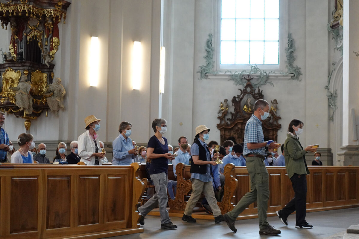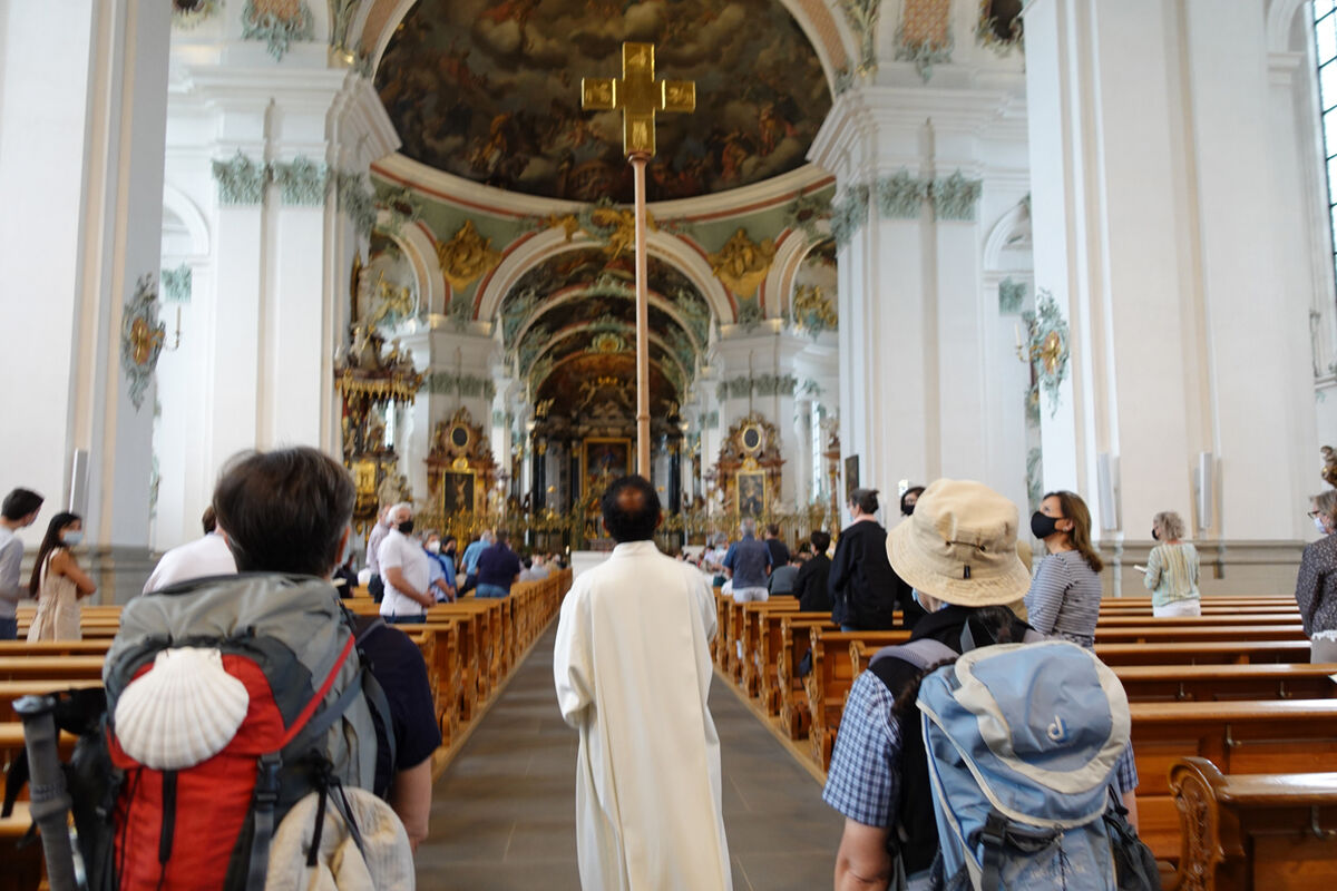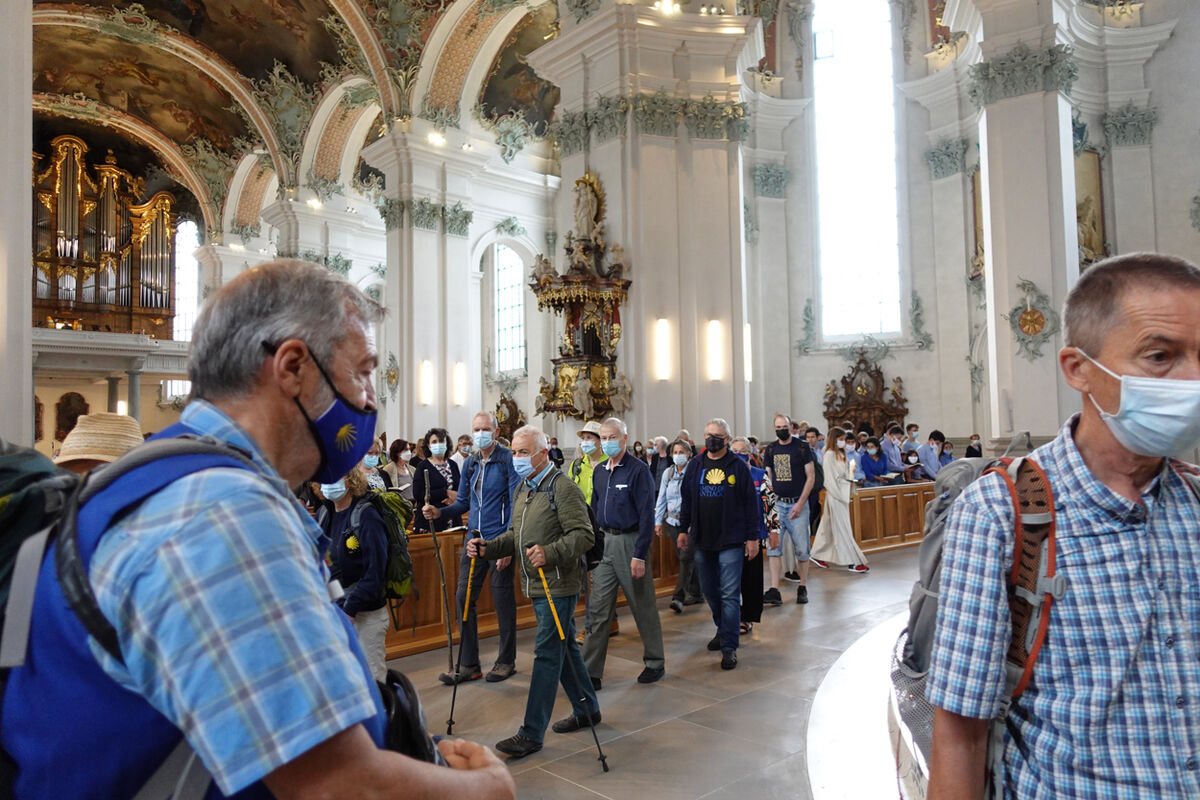Unter den vielen Gottesdienstbesuchenden befanden sich zahlreiche Pilgerinnen und Pilger der ganzen Schweiz. Ausser der Dommusik mit den Dombläsern gestaltete auch eine Gruppe von Pilgerinnen und Pilger des Vereins ‘Pilgerherberge Sankt Gallen’ die Feier mit. Die Festpredigt hielt Dompfarrer Beat Grögli, der auch einst nach Santiago pilgerte.
