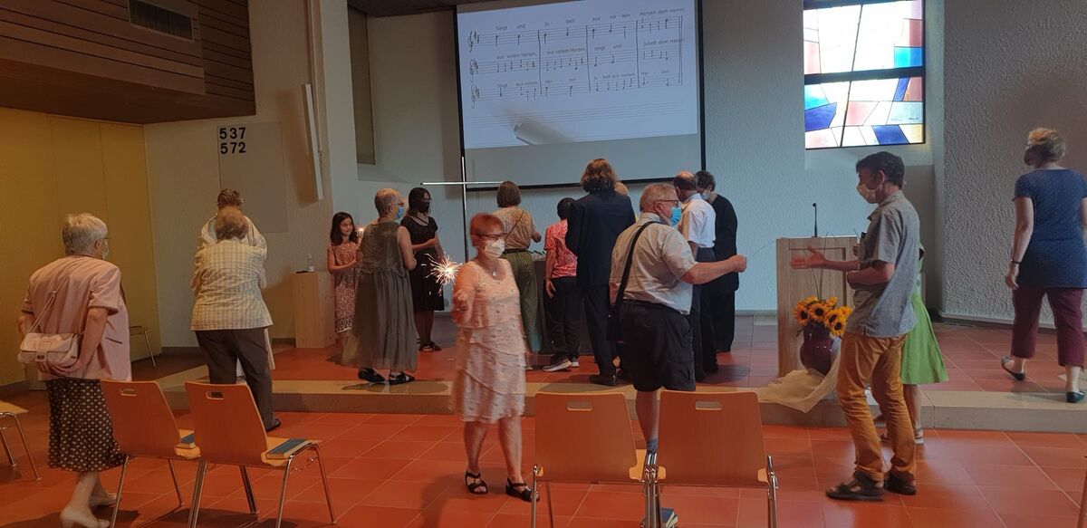 Seit zwei Jahren feiern Katholische und evangelische Menschen im gleichen Kirchgenraum. Darum wurde ein Geburtstagskuchen aus der Kirche getragen und auf der Piazza bei wunderschönem Wetter gegessen.