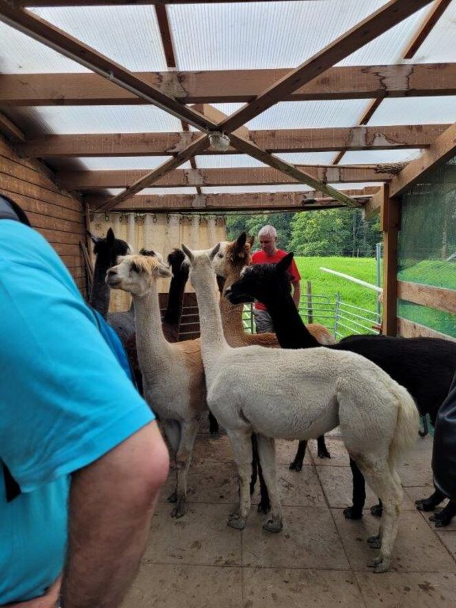 Nach einem kleinen Apéro bei Christine Huber machte sich die Gruppe auf zur Alpakafarm von Silvia Rechsteiner und Stefan Felder. Nach einer Kennenlernrunde der zwei Esel und des "Mulis" (Maultier), die ebenfalls zur Farm gehören, wurden wir in den Stall der Alpakas geführt. Silvia erzählte uns viel spannendes und aussergewöhnliches über diese zum Anschauen "putzigen" Tiere.