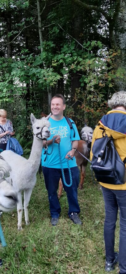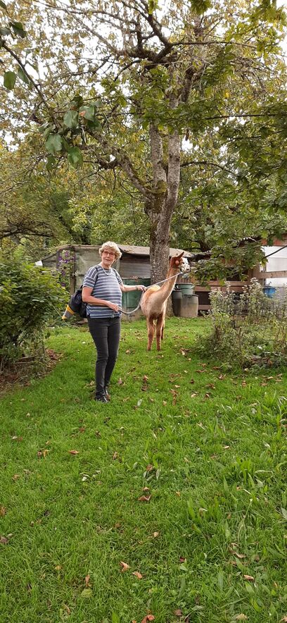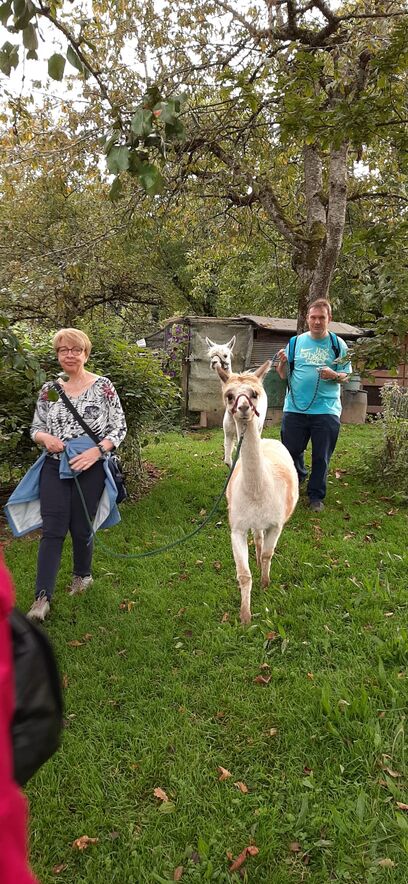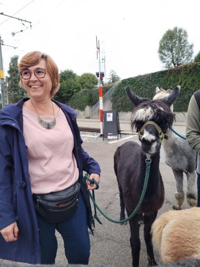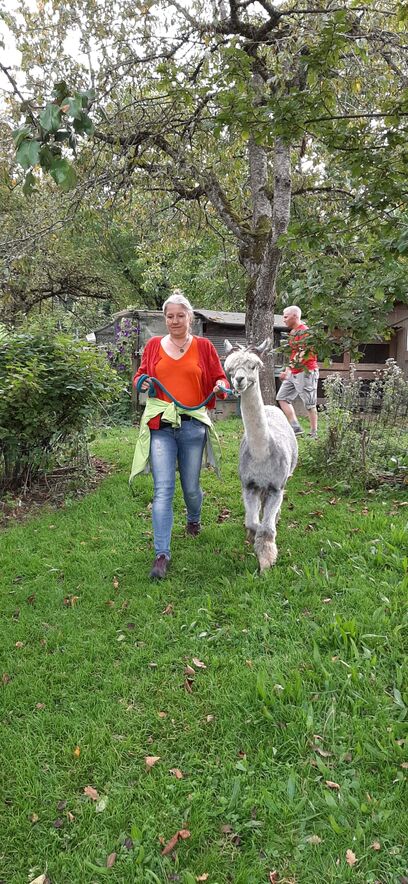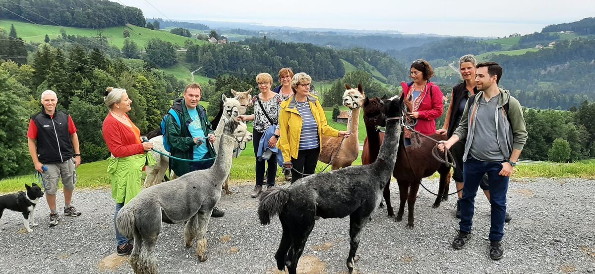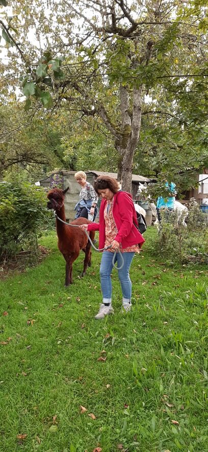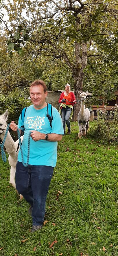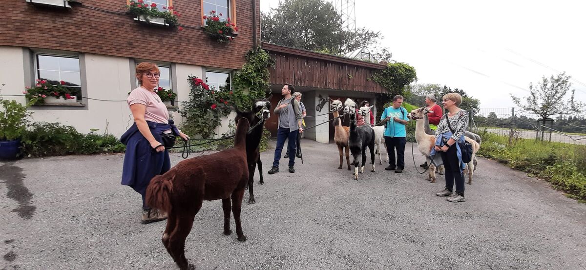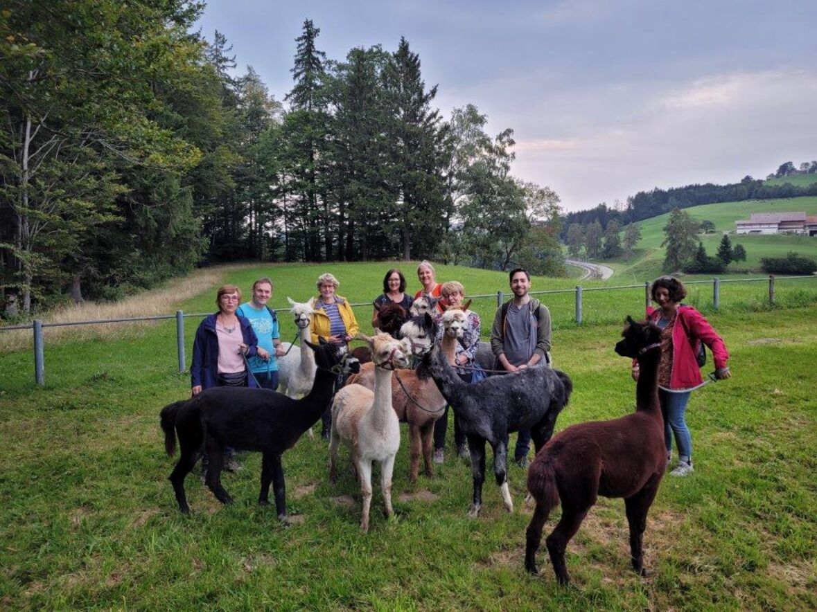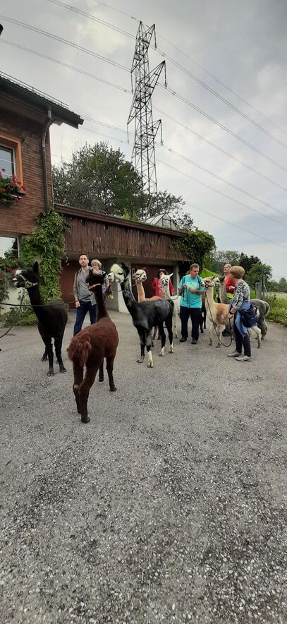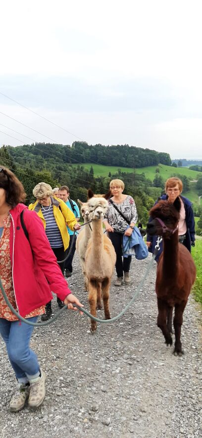 Nach den Instruktionen durfte jede/r die/der wollte ein Tier führen - ein nicht ganz einfaches Unterfangen - da wir aufgrund unserer Augenstellung für die Alpakas Raubtiere sind und wir zuerst das Vertrauen zu ihnen aufbauen mussten (mit Futter). Auch suchen diese Tiere nicht die Nähe der Menschen und lassen sich nur ungern streicheln. Nichts desto trotz hat die 2-stündige Wanderung zum Restaurant Schwarzen Bären Spass gemacht - eine Erfahrung - die wir Teilnehmende nicht missen möchten.
