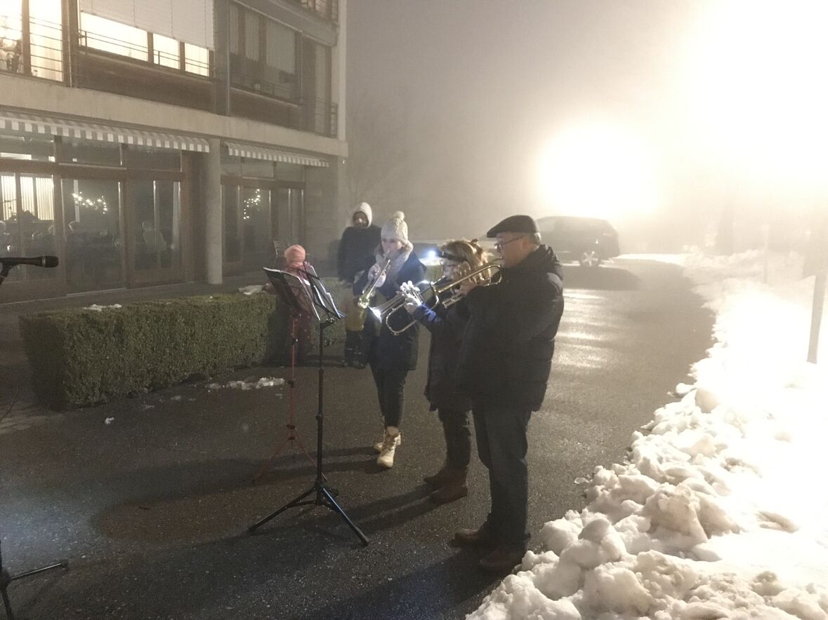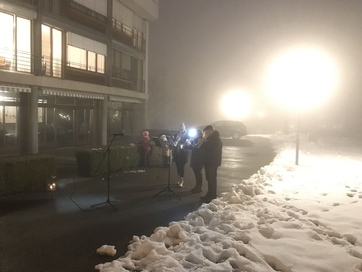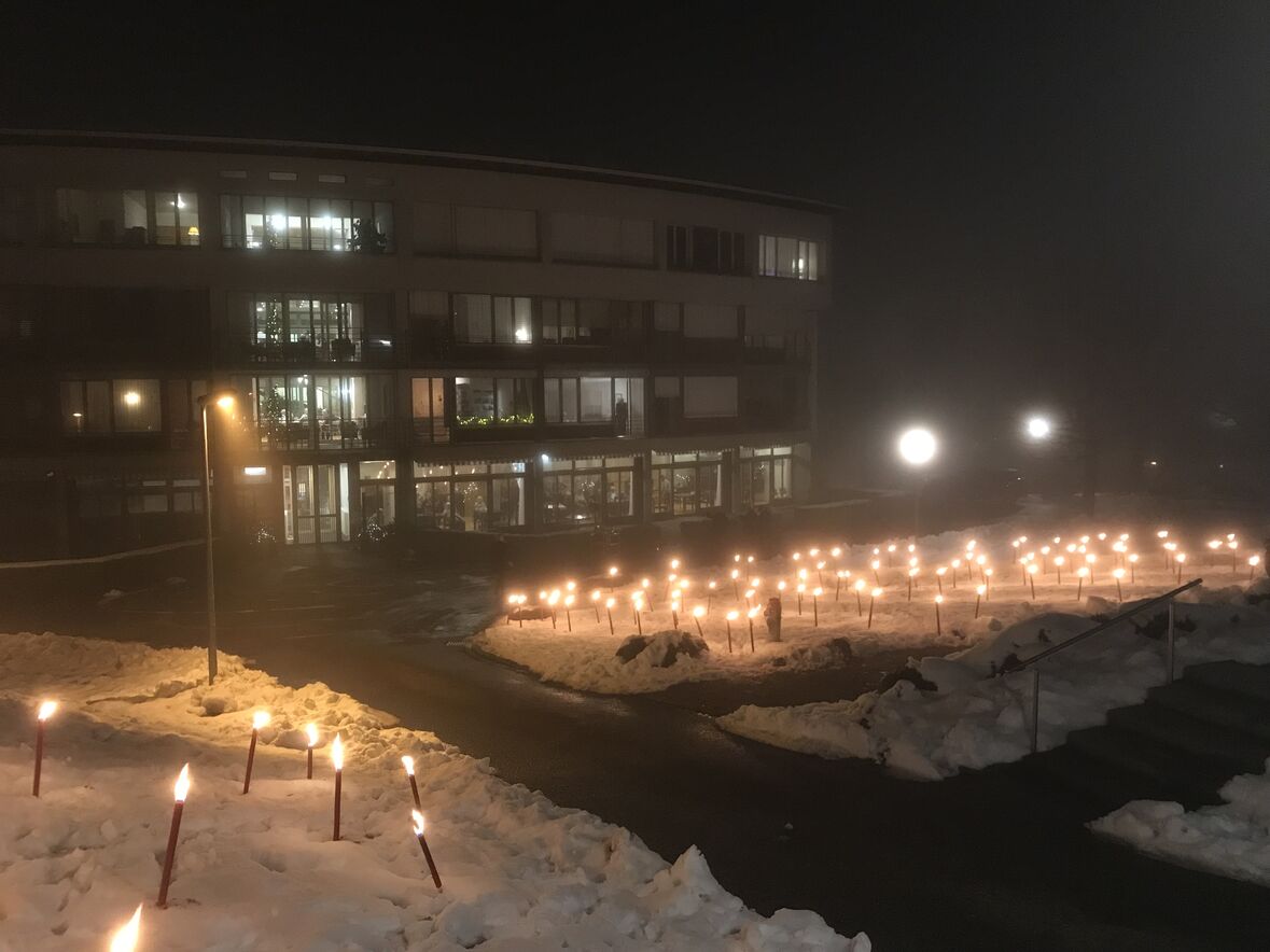 Ein kleines Lichterfest konnten wir vom Team der Ökumenischen Gemeinde Halden und der Pfadi Fontana heute Abend den Bewohner*innen des Betagtenheims Halden schenken. Mit 106 brennenden Fackeln hat die Pfadi einen grossen Stern in den Schnee auf der Wiese zwischen Betagtenheim und Kirche Halden gezeichnet. Anita und Andreas Lauper und Manuela Rechsteiner spielten mit Trompete und Flügelhorn Weihnachtslieder und Pfrn. Andrea Weinhold richtete ein paar einfühlsame Worte an die Bewohner*innen - alles natürlich im Rahmen entsprechender Corona-Regeln. Aus der schweren Situation im Winter 2020 heraus entstand diese Tradition, bei der die Halden dem Betagtenheim das Friedenslicht von Bethlehem übergibt und das Heim ihren Adventsstern für die Kirche.