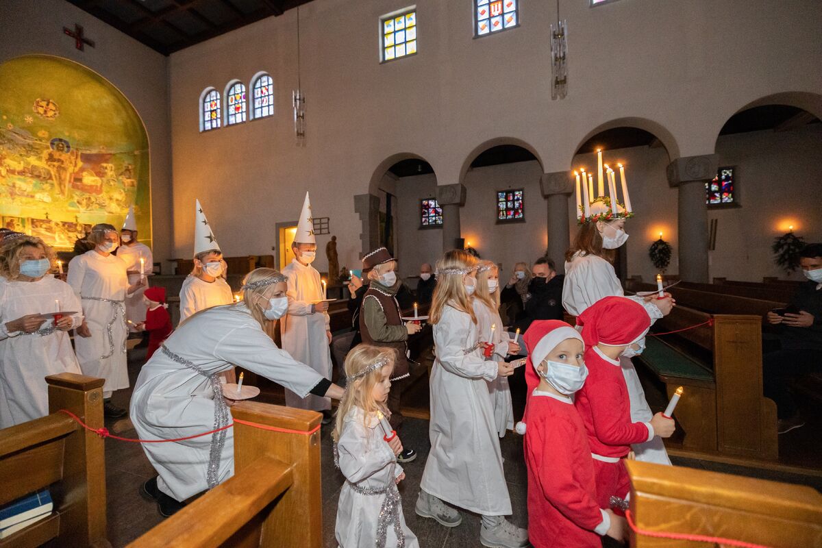 Luziafeier der Schweden in der Kirche. Das religiöse Ritual reicht weit in vorchristliche Zeiten zurück und wird an der Wintersonnenwende gefeiert. Ein Mädchen trägt den Lichtkranz auf dem Haupt. Jede Familie bestimmt ihre Luzia und hat ihr eigenes Ritual.