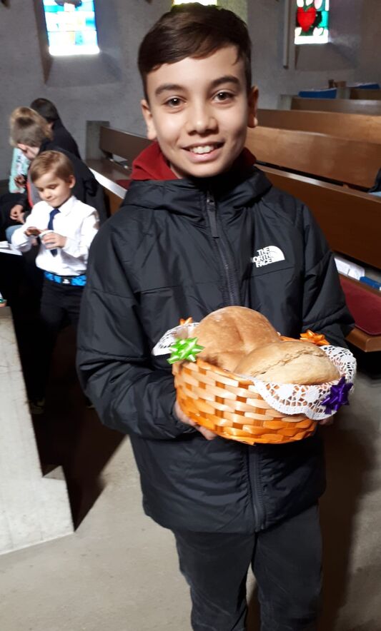 Auf dem Weg zur Erstkommunion haben die Erstkommunionkinder ihre Tauferneuerung zum Thema "Brot" gefeiert: Sie haben im Gottesdienst Glaubenssätze vorgetragen mit Aussagen zu ihrem je eigenen Glauben, die sie im Religionsunterricht erarbeitet hatten.