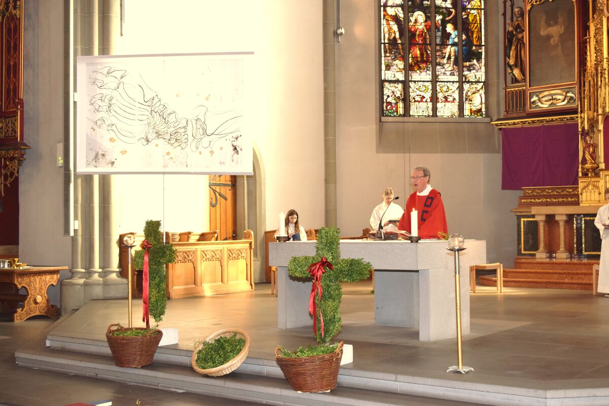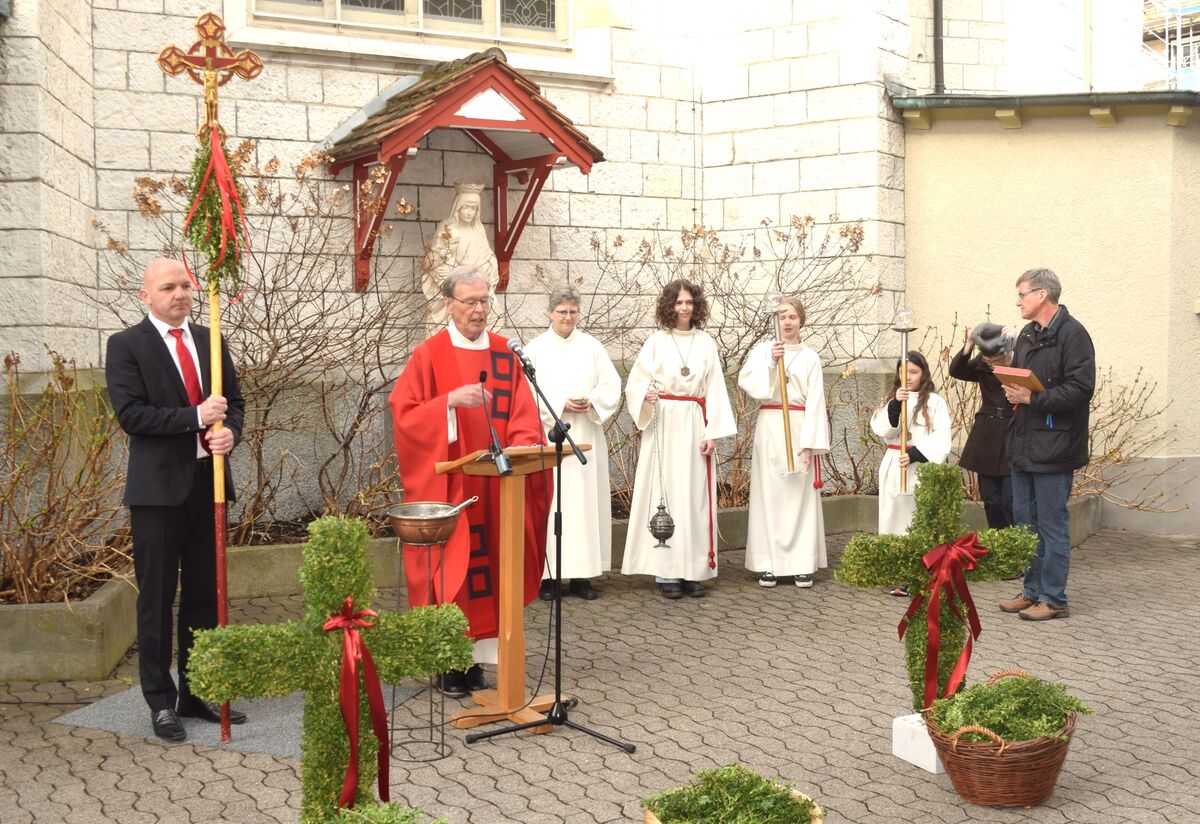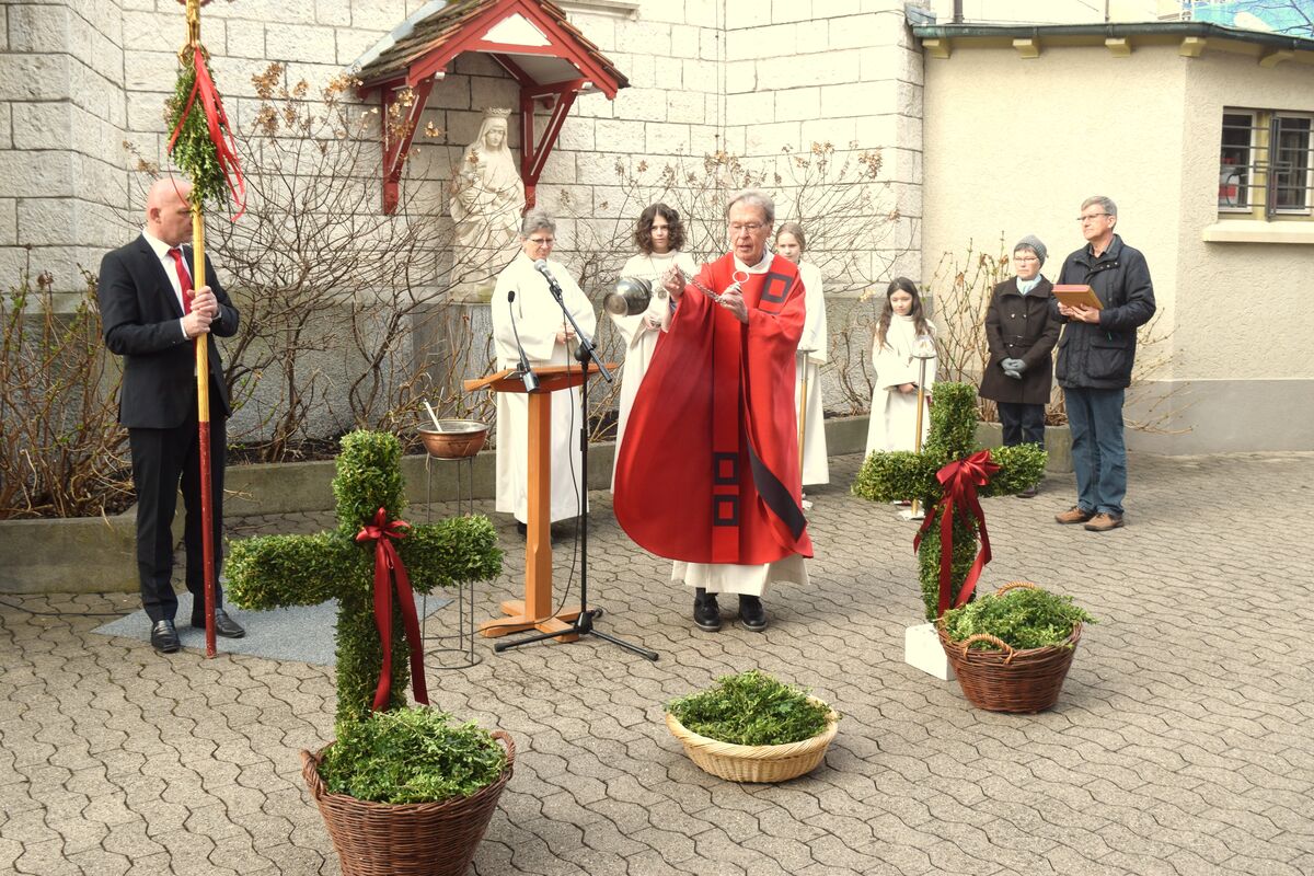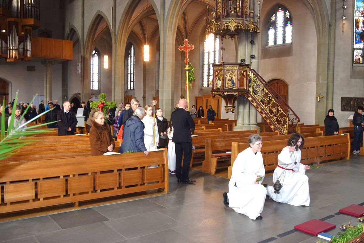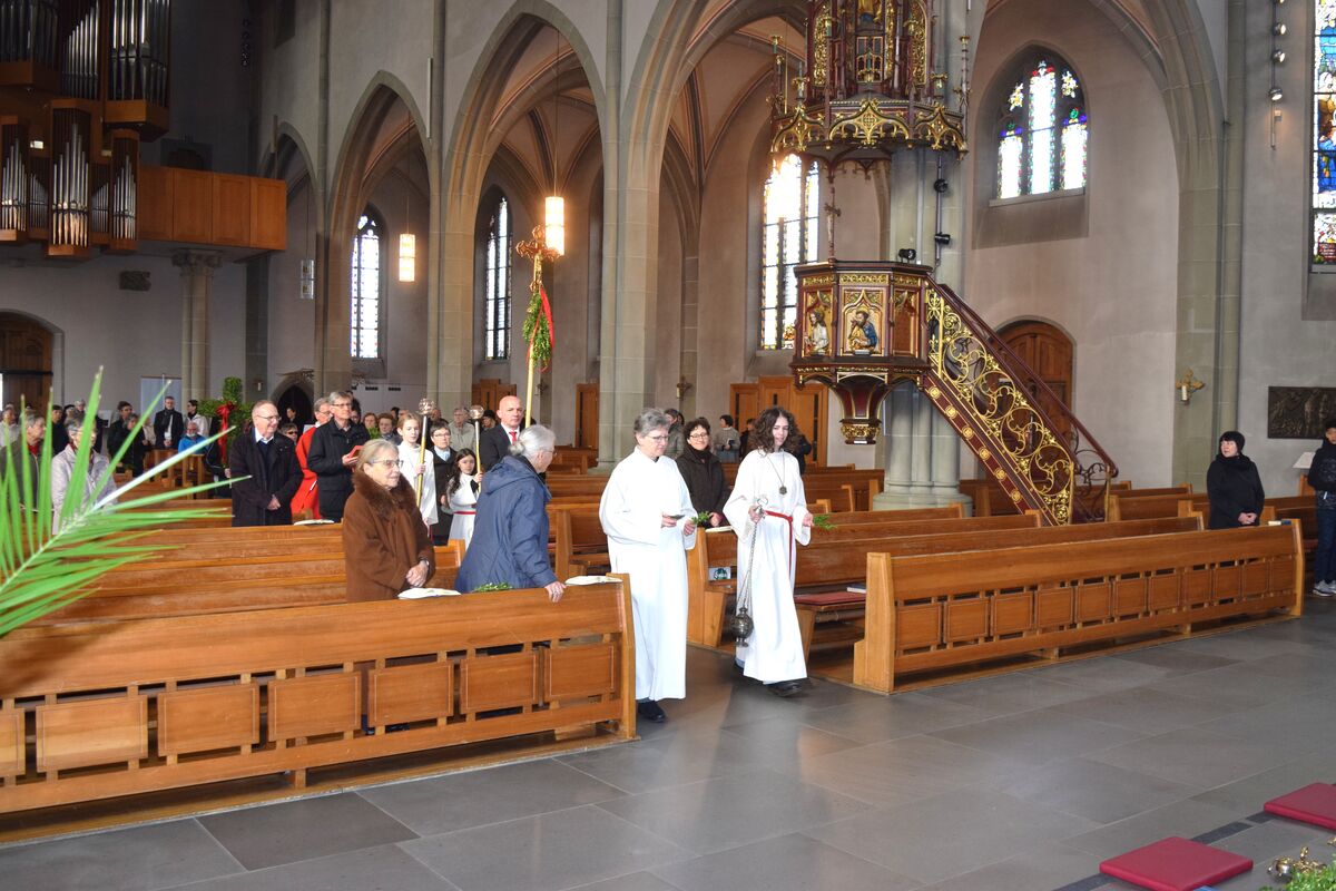 Zunächst wurden im Innenhof die Palmzweige gesegnet, bevor sich die Gemeinde anschliessend in der Kirche Gottesdienst feierte.