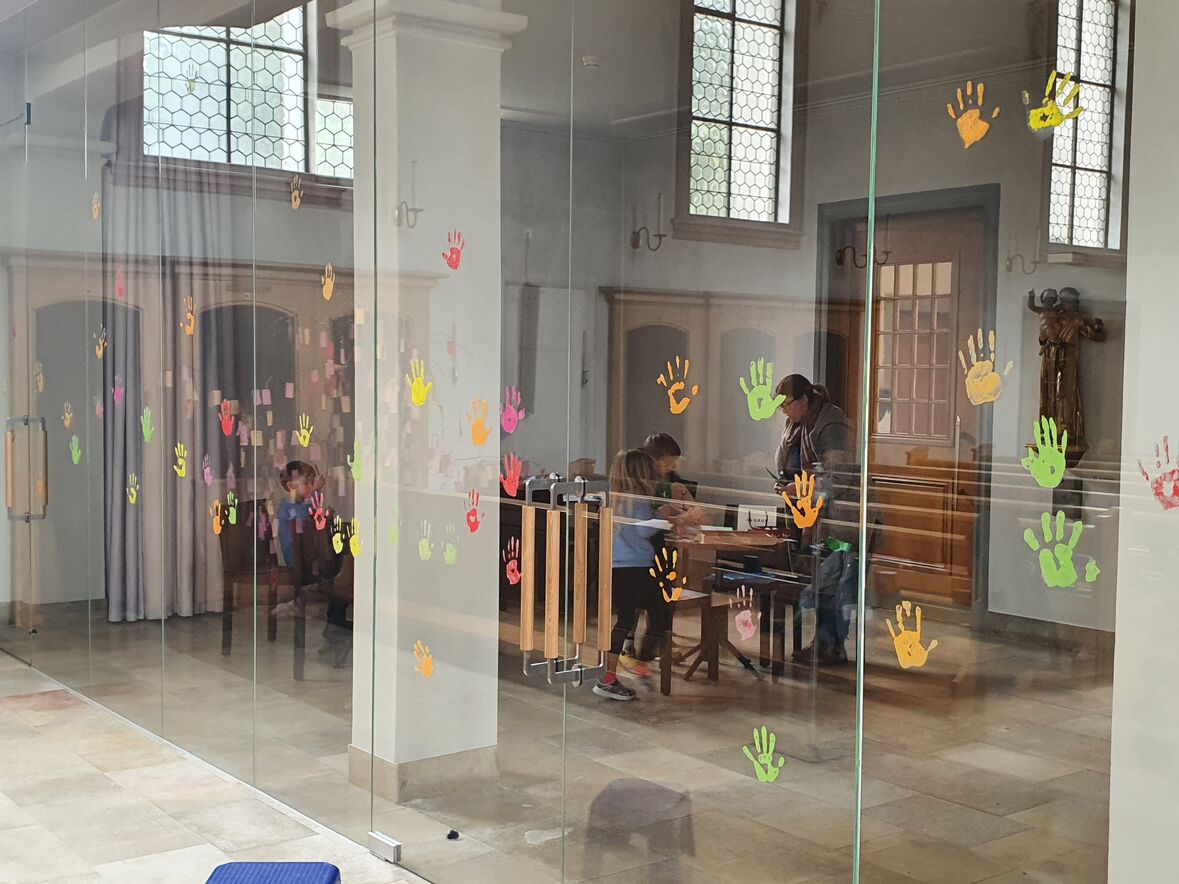 Die Glaswand zwischen Kirchenraum und Begegnungsraum wartet noch auf den letzten Schliff. Bis dahin dürfen uns die bunten Handabdrücke der Kinder der ersten Klasse im Grossacker ein Lächeln hervorzaubern. Vielen Dank, liebe Kids!