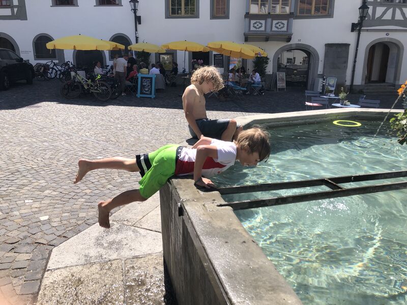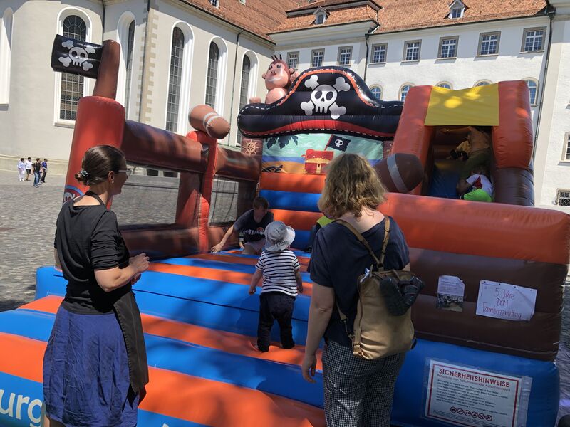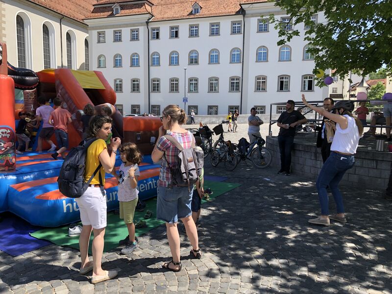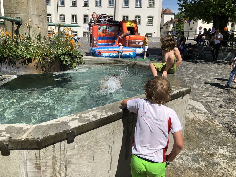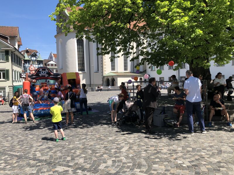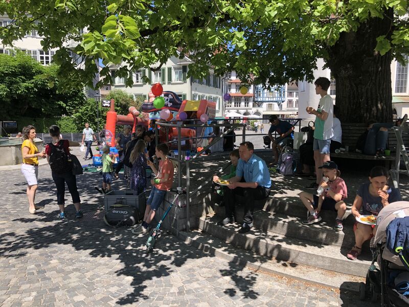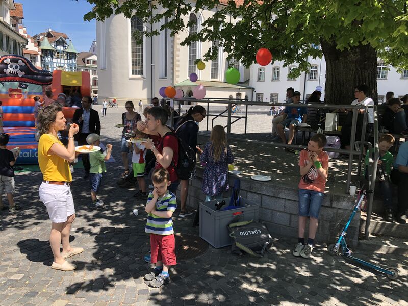 Der FamilienZmittag hat sein 5-jähriges Jubiläum gefeiert. Hier kochen einmal im Monat Familien für Familien. Zum Jubiläum hat das Vorbereitungsteam um Lisi Germann eine Hüpfburg organisiert, welche von den Kindern sofort in Beschlag genommen wurde. Auch der Brunnen auf dem Gallusplatz wurde wegen des schönen Wetters gleich als kleine «Badi» genutzt. Das Zmittag war wie immer ein Genuss! Ein grosser Dank geht an alle fleissigen Mamis und Papis, die für andere zu Köchinnen und Köchen werden!