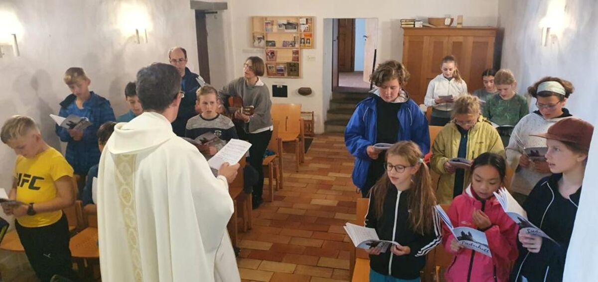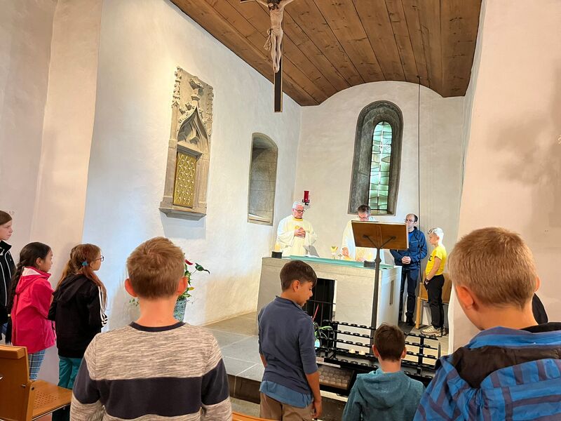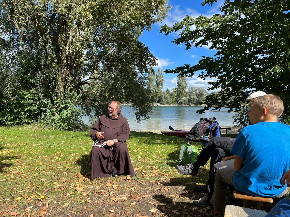 Mit Zug, Bus, Schiff und zu Fuss "pilgerte" eine grosse, bunte, fröhliche Schar von Ministrantinnen und Ministranten der Kathedrale an den Untersee auf die Insel Werd. Nach dem stimmigen Gottesdienst in der alten, romanischen Kapelle genossen wir die Gastfreundschaft der Franziskanerpatres in ihrem schönen Garten über dem leeren Grab des Heiligen Otmar. Pater Hans setzte sich auf den "heissen" Stuhl und die Mini's durften ihm allerlei Fragen stellen zu seinem Gewand und diversen anderen interessanten Dingen.