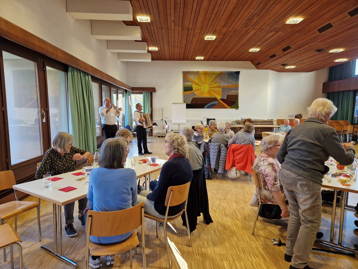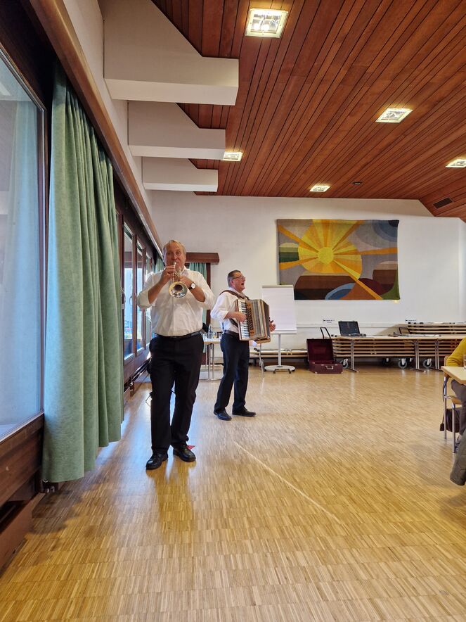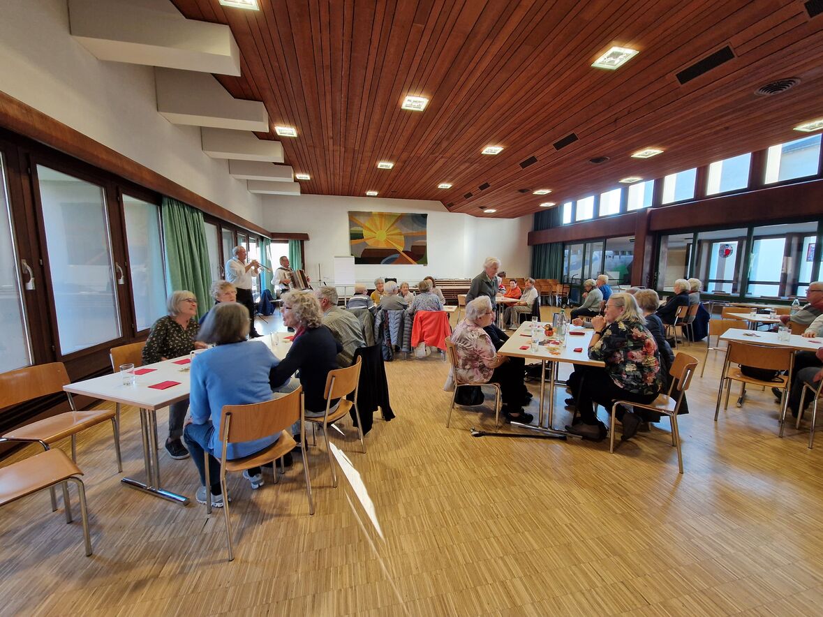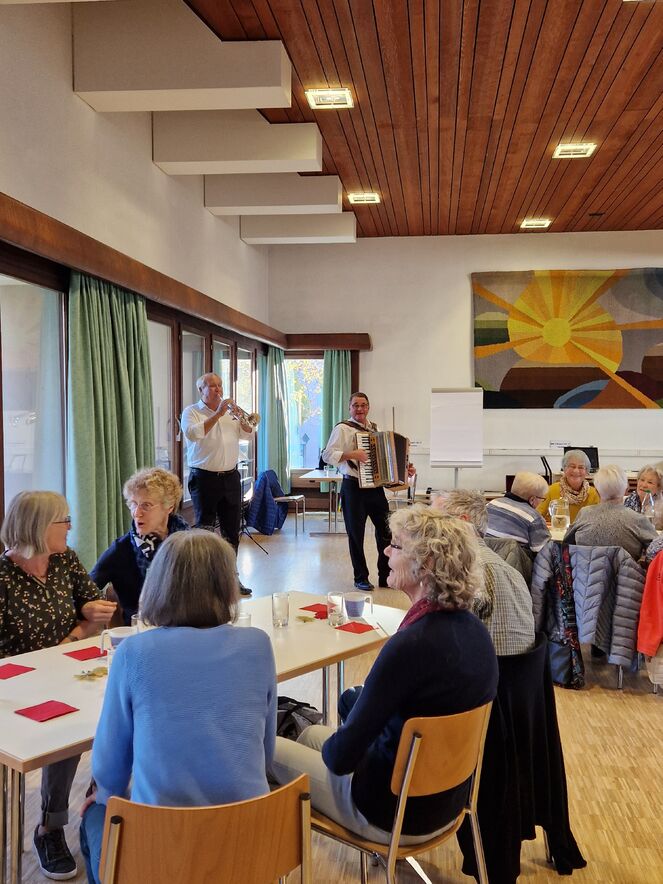 Am 16. November 2022 fand der 60plus Programmnachmittag statt. 34 interessierte Personen fanden sich im Pfarreiheim St. Martin in Bruggen zum gemeinsamen Singen und Tanzen mit dem Duo Pirmin und Röbi ein. Es wurde zu bekannten Volksliedern gesungen, geschaukelt und gelacht, welche von Pirmin und Röbi mit dem Akkordeon und der Trompete begleitet wurden. Als Verschnaufpause wurden Rouladen mit Rohschinken, Pesto und Tomaten serviert und dazu gab es ausnahmsweise mal keinen Kaffee - sondern Punsch. Der salzige Zvieri wurde von allen sehr geschätzt.