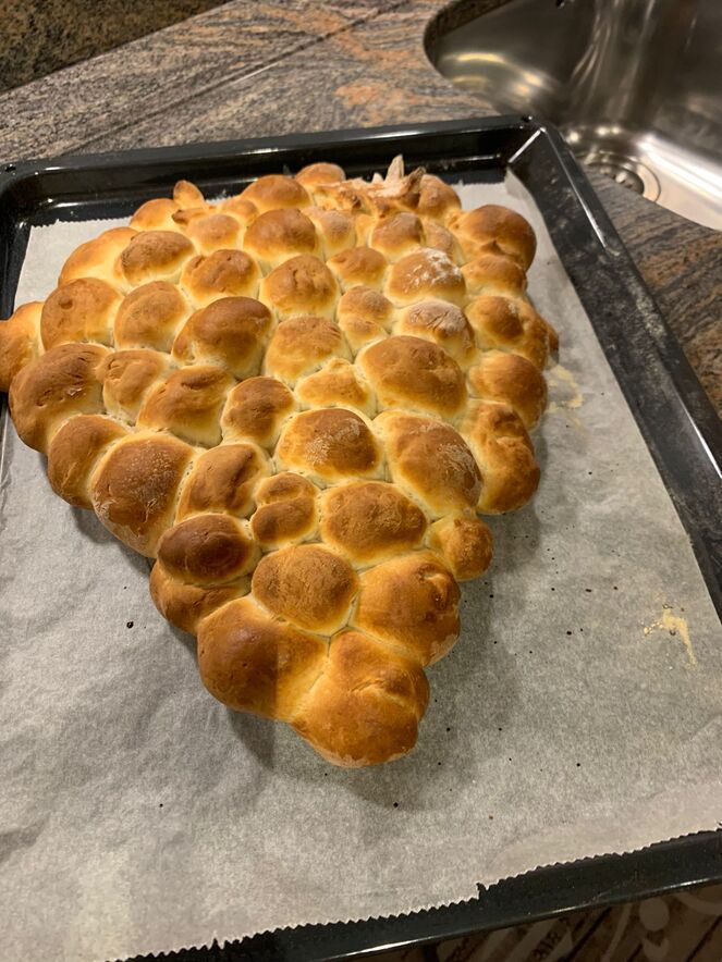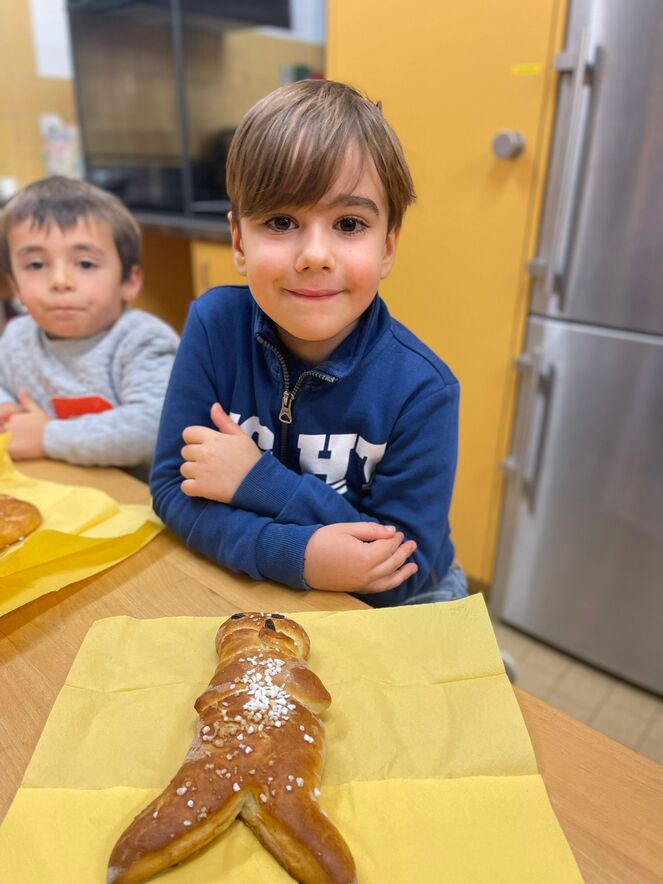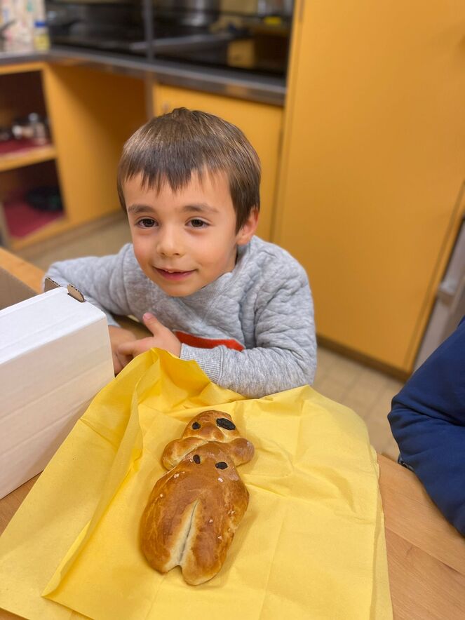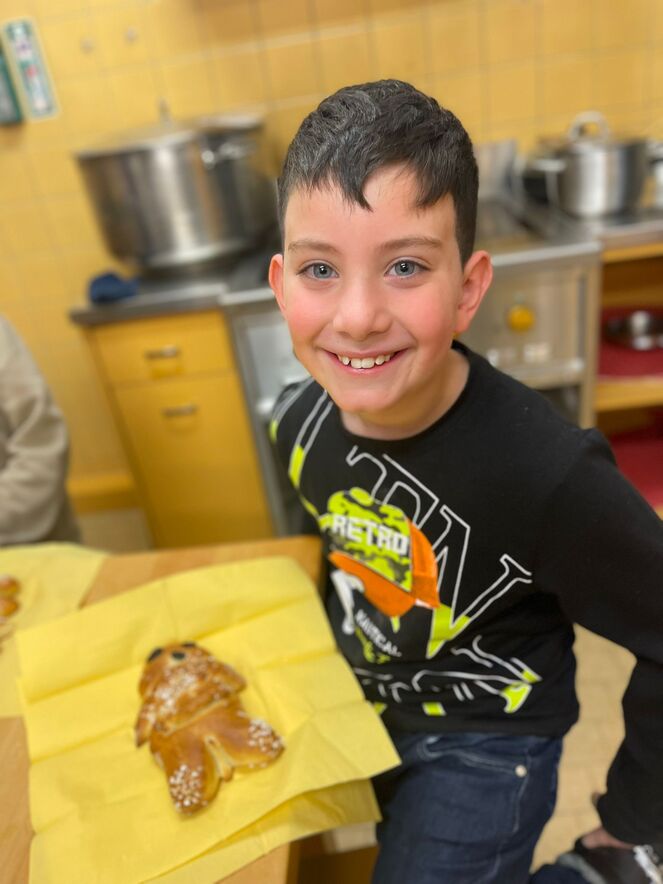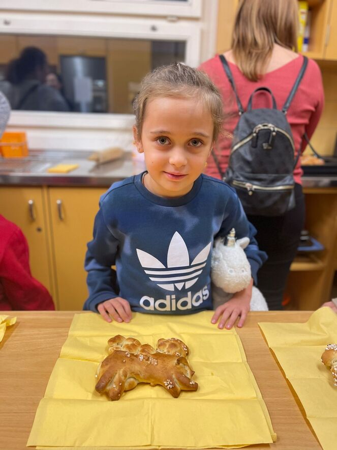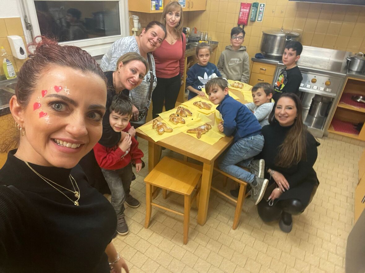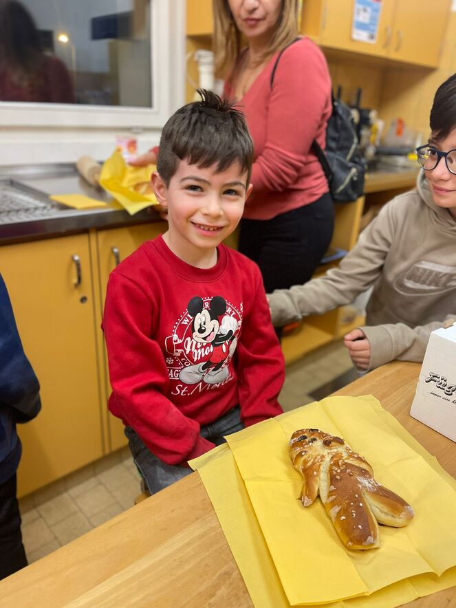 Impegno dei bambini insieme alle animatrici per preparare il segno del "Pane che unisce". Il frutto del loro lavoro è stato poi benedetto a Messa l'11.12.22 e "spezzato" per tutti.