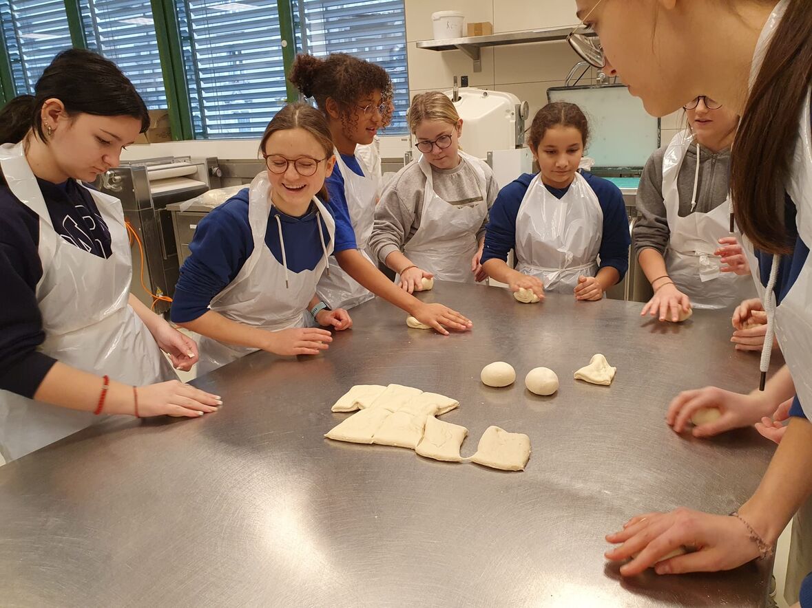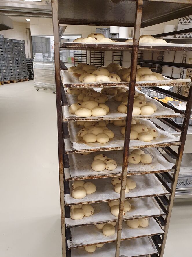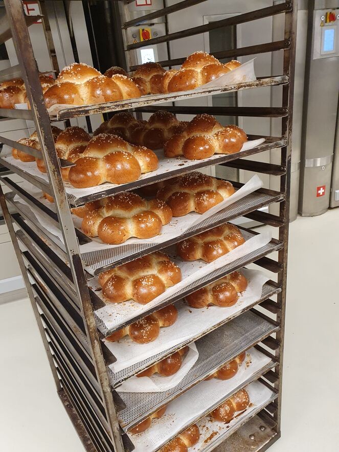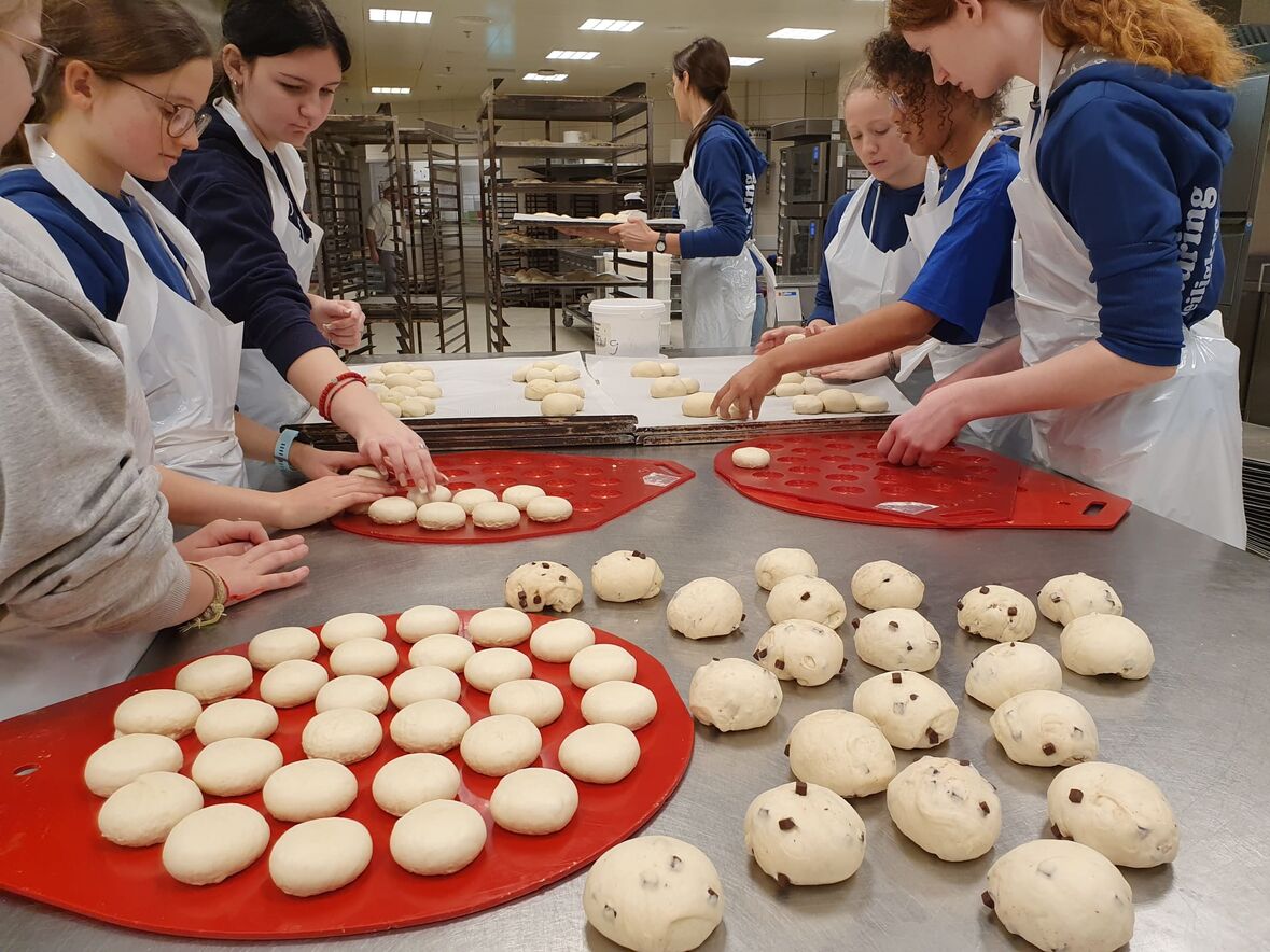Um diese Königskuchen zu backen, trafen wir uns am Donnerstagnachmittag und machten uns auf den Weg in die Migros Bach. Dort angekommen wurden wir nett empfangen und in die Bäckerei hineingeführt. Als erstes wurden alle Hände gründlich gewaschen und Schürzen angezogen. Zusammen haben wir dann den Teig, welcher bereits in der Knetmaschine umherschleuderte, beobachtet. Während dieser weiter knetete wurde uns die Bäckerei gezeigt. Nebst den vielen verschiedenen Öfen, Knetkesseln (in denen 3 Blauringmädchen platz hätten), den riesigen begehbaren Kühlschränken sowie den Tiefkühlern, haben sie dort sogar eine Maschine nur für Berliner! Zurück beim Teig konnten wir diesen herausnehmen und abwiegen. Die einzelnen Teile wurden dann mit einer Maschine in gleichgrosse Stücke geteilt. Nun konnten wir diese zu schönen runden Bällchen formen. Dies war allerdings gar nicht so einfach, wie es ausgesehen hat. Jetzt mussten wir nur noch Könige verstecken und uns gut merken, wo diese drin waren. Nicht, dass jemand keinen König bekommt. Nun setzten wir die Königskuchen zusammen, zuerst 6 Mittelteile auf ein Blech, danach je ein Stück mit dem König drin und dann die 5 weiteren Stücke. Da unsere Königkuchen Hefe enthalten, mussten sie zuerst ein wenig aufgehen. Hierzu kamen sie in den Gärschrank, welcher eine schön warme Temperatur aufweist. 20 Minuten später mussten wir die Kuchen nur noch mit Ei bestreichen und Hagelzucker darauf streuen. Kurz darauf waren sie dann auch schon im Ofen am Backen. Während dessen genossen wir einen kleinen Zvieri.
