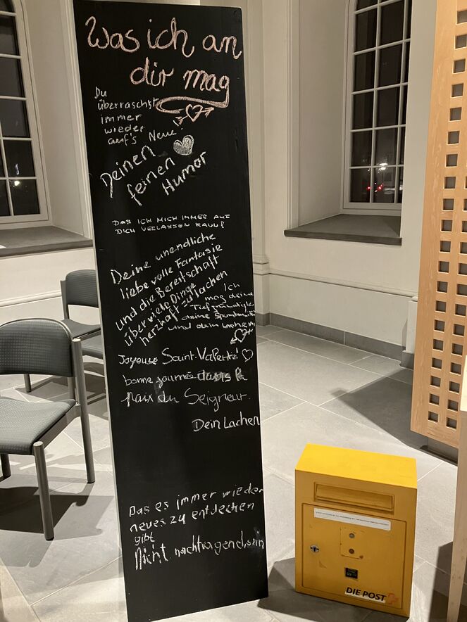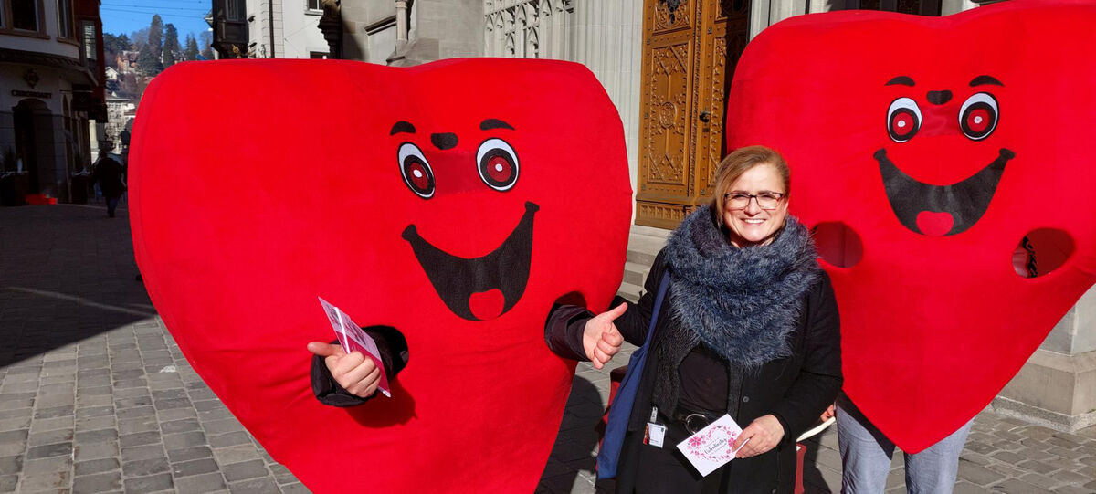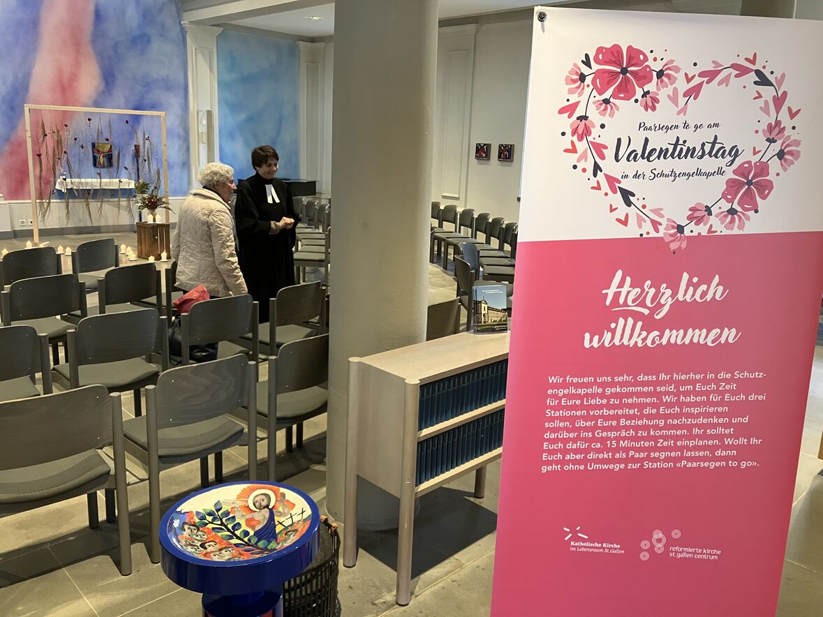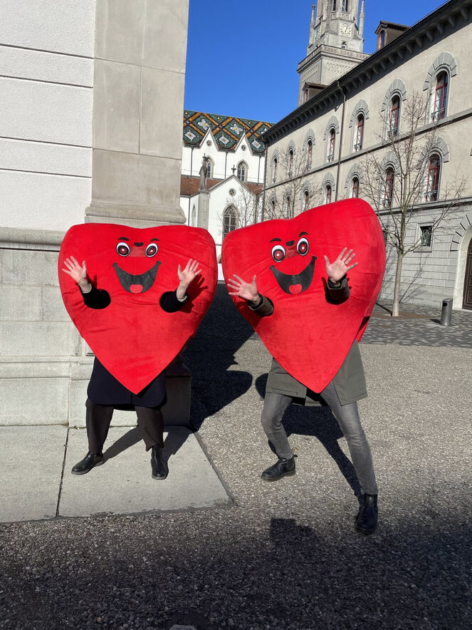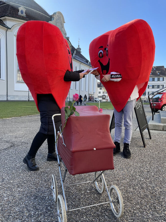Valentinstag: der Tag aller Liebenden! Und Liebe ist notwendig ist dieser Welt - da besteht gar kein Zweifel. Deshalb haben Pfrn. Kathrin Bolt von der Evangelisch-Reformierten Kirchgemeinde St. Gallen C und die Cityseelsorge der Kath. Kirche im Lebensraum St. Gallen den 14. Februar dafür genutzt, um mit einer breit angelegten Aktion für die Liebe zu werben. Als Herz verkleidet zogen Mitarbeiter*innen und Freiwillige durch die Stadt und haben dazu eingeladen, Menschen, die einem lieb sind, eine Karte zu schreiben, oder selbst mit seinem liebsten Menschen (Partner*in, Freund*in, Familienmitglied) in die Schutzengel zum "Paarsegen to go" zu kommen. Dort hat ein Stationenweg dazu inspiriert, über die eigene Partnerschaft nachzudenken, sich darüber auszutauschen und seine*n Liebste*n wertzuschätzen. Wer möchte konnte sich dort von Seelsorgenden segnen lassen.