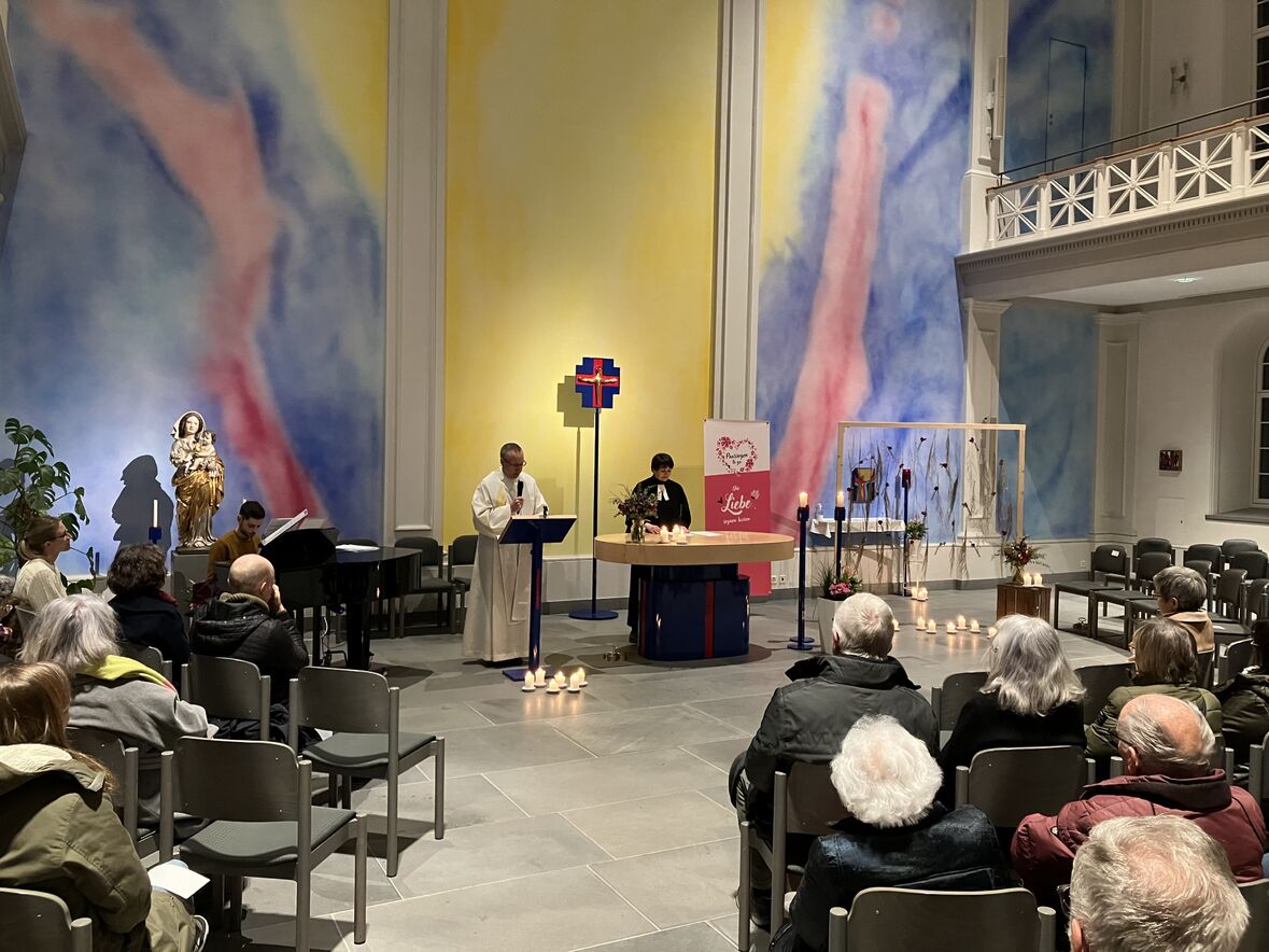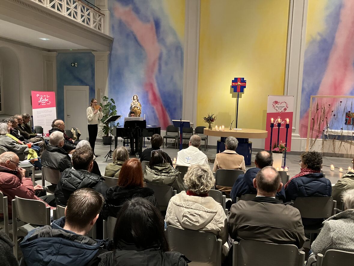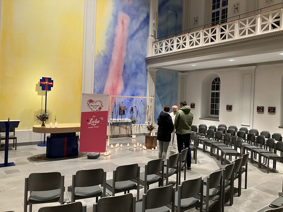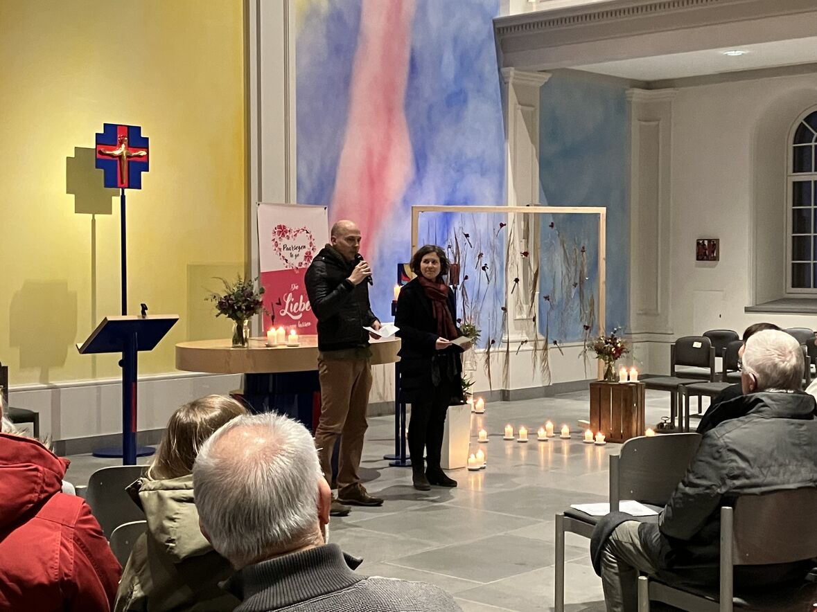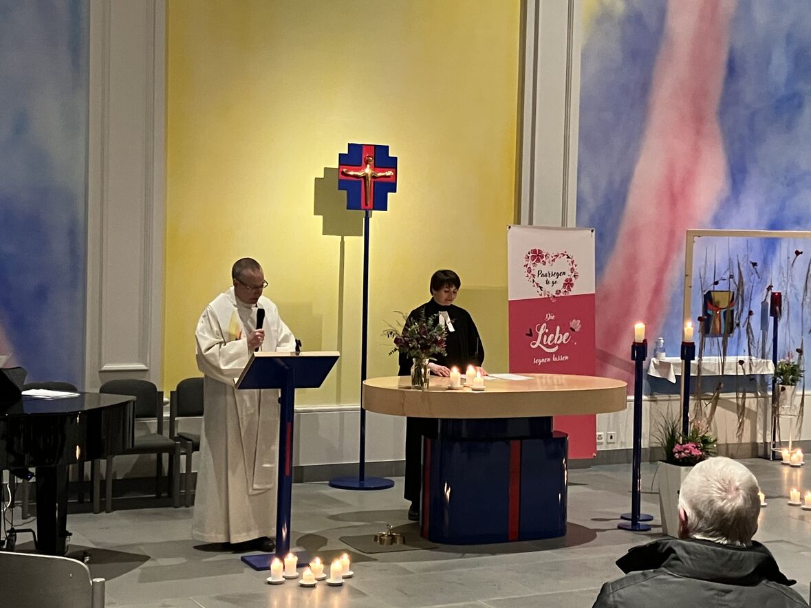 Die Segensfeier um 19 Uhr mit Musik von Nadine & Dario Canal und liebevollen Gedanken hat den Tag der Liebenden abgerundet. Christiane Schubert und Gregor Scherzinger haben dabei von ihrem Alltag als Paar erzählt und vor allem auch von ihrem goldigen Liebesstaub, der manchmal vom Alltagsstaub verdeckt wird. Wer wollte konnte sich als Paar zum Abschluss der Feier segnen lassen.