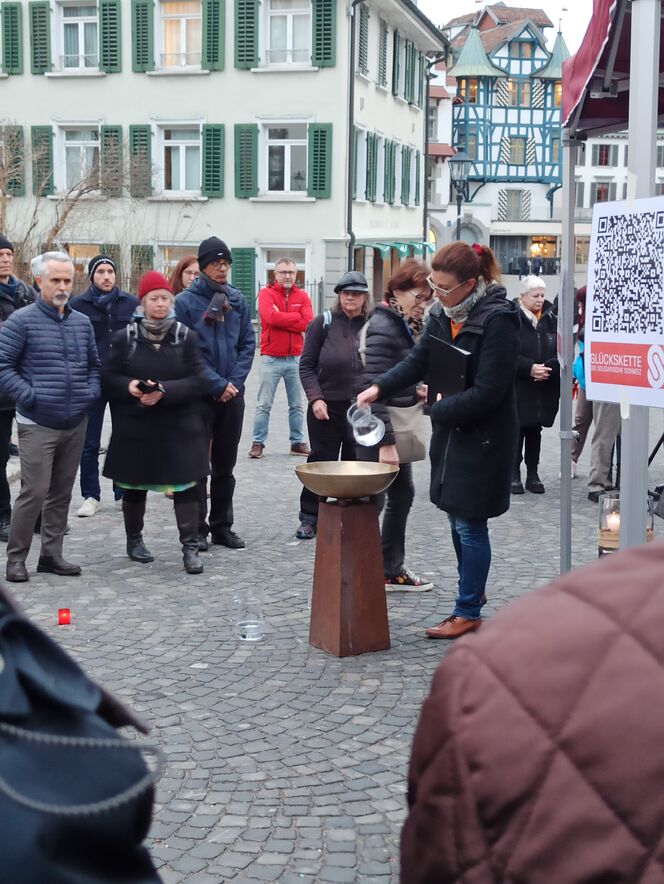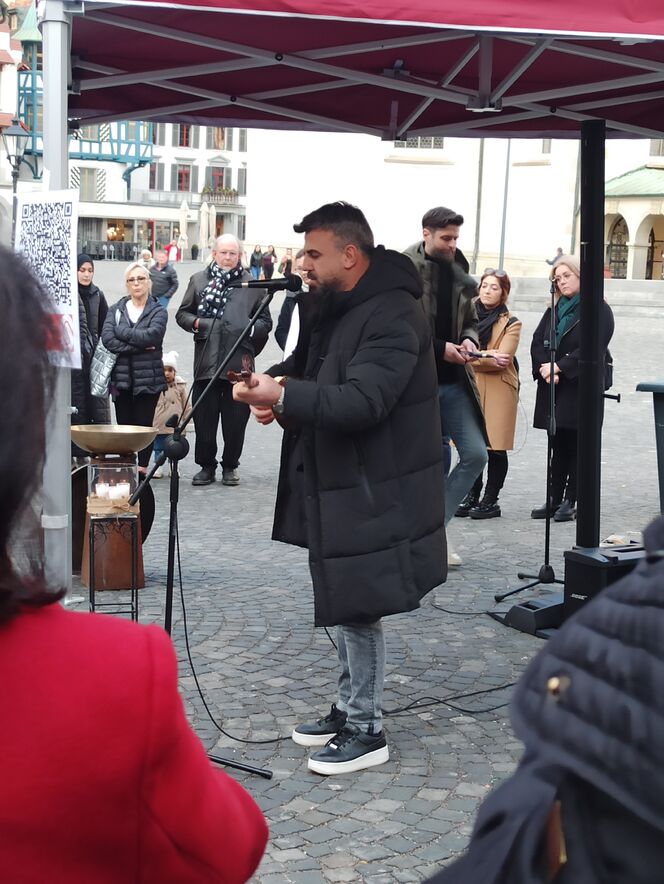 Vertreter*innen des DIGO (Dachverband islamischer Gemeinden der Ostschweiz und des Fürstentums Liechtenstein), desAlevitisches Kulturzentrums Ostschweiz, der evangelisch-reformierten Kirchgemeinde Straubenzell und der Cityseelsorge der Katholischen Kirche im Lebensraum St. Gallen haben Trauergesänge und Klagetexte aus ihren jeweiligen Traditionen eingebracht. Menschen unterschiedlicher sozialer, religiöser und kultureller Zugehörigkeit sind vom Erdbeben betroffen worden. Darum wurde auch aus dem kulturellen Schatz der Traditionen das Mitgefühl zum Ausdruck gebracht und ein Zeichen für die praktischen Hilfe vor Ort gesetzt: die Kollekte ging an die Glückskette.