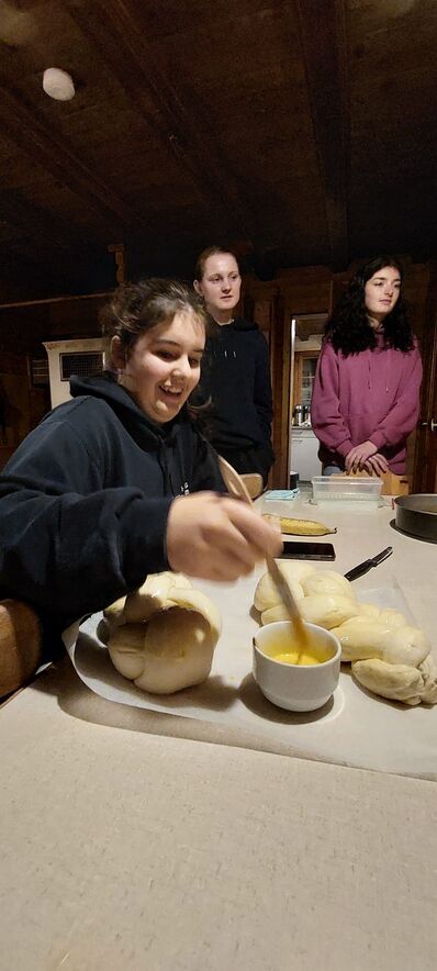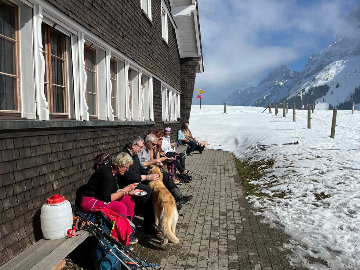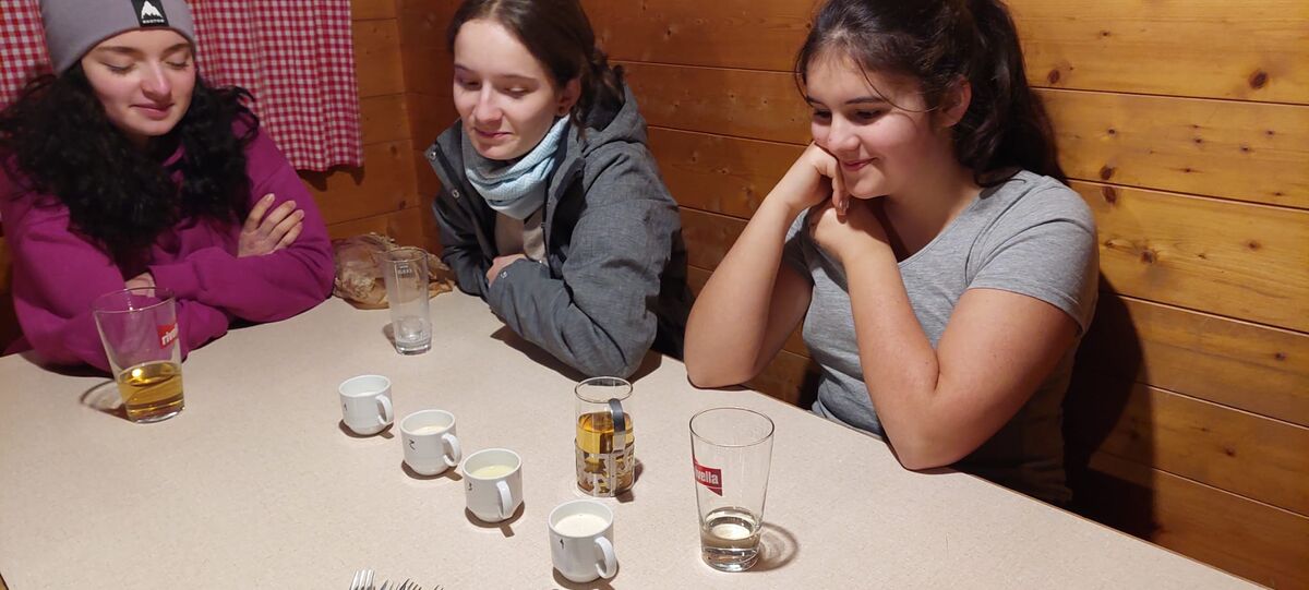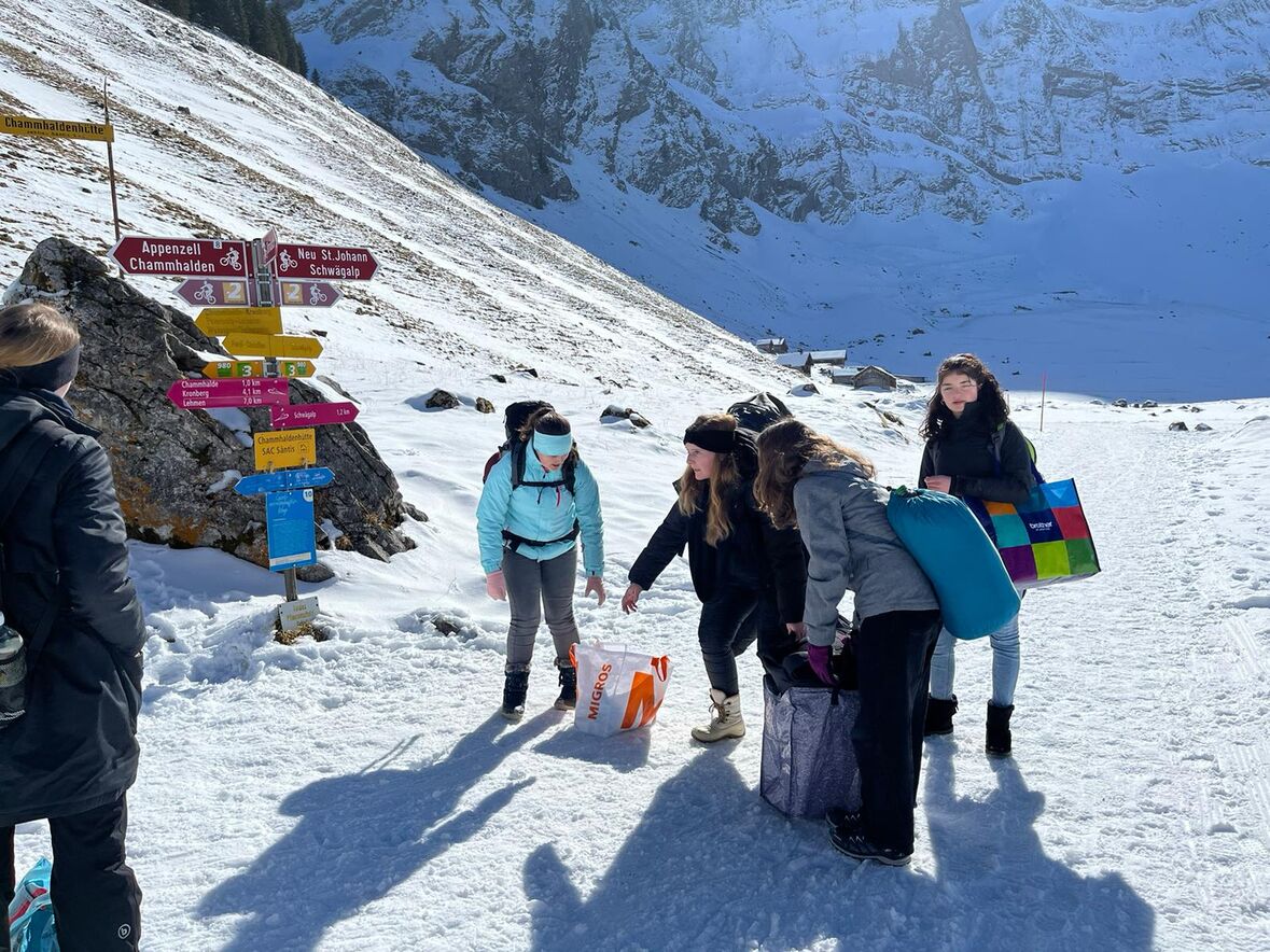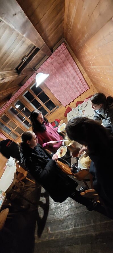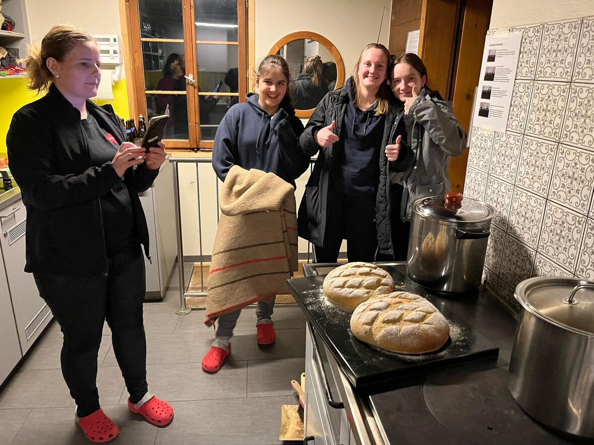 Auch am Verschiebedatum unseres Igluweekends lag auf der Schwägalp zu wenig Schnee für dieses Abenteuer. Trotzdem wollten die Jugendlichen das gemeinsam geplante Wochenende auf der Chammhaldenhütte verbringen. Kaum waren wir mit Sack und Pack oben angekommen, verlangten die ersten Gäste schon nach Kaffee und Kuchen. Und so ging es munter weiter, so dass wir alle Hände voll zu tun hatten, die Wandersleute bei strahlendem Winterwetter mit Getränken und Kuchen zu umsorgen und gleichzeitig die Hütte zu heizen, damit es warm und gemütlich wurde. Am Abend wurde dann auf dem Holzherd gekocht und vor allem auch gebacken, denn am Sonntag wollten wir eine feine Suppe, Wienerli und selbstgemachtes Brot für unsere Gäste bereit haben. Dazwischen blieb aber auch genügend Zeit für uns als Gruppe zum Spielen oder zu einer nächtlichen Rutschpartie auf der mit Fackeln beleuchteten Piste.