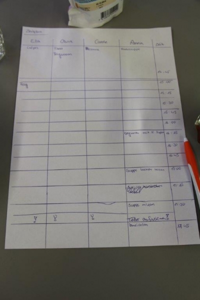 Kurz vor sechs kam nochmals ein bisschen Hektik auf. Um Punkt 6 mussten die Kochgruppen ihr schön angerichtetes Drei-Gänge-Menu präsentieren. Die anderen Kochgruppen bewerteten Aussehen, Geschmack und Kreativität. Das Jugendarbeiter-Team bewertete das Teamwork und die Planung und Organisation. Das Ergebnis von drei Stunden planen, kochen und anrichten konnte sich sehen und schmecken lassen.